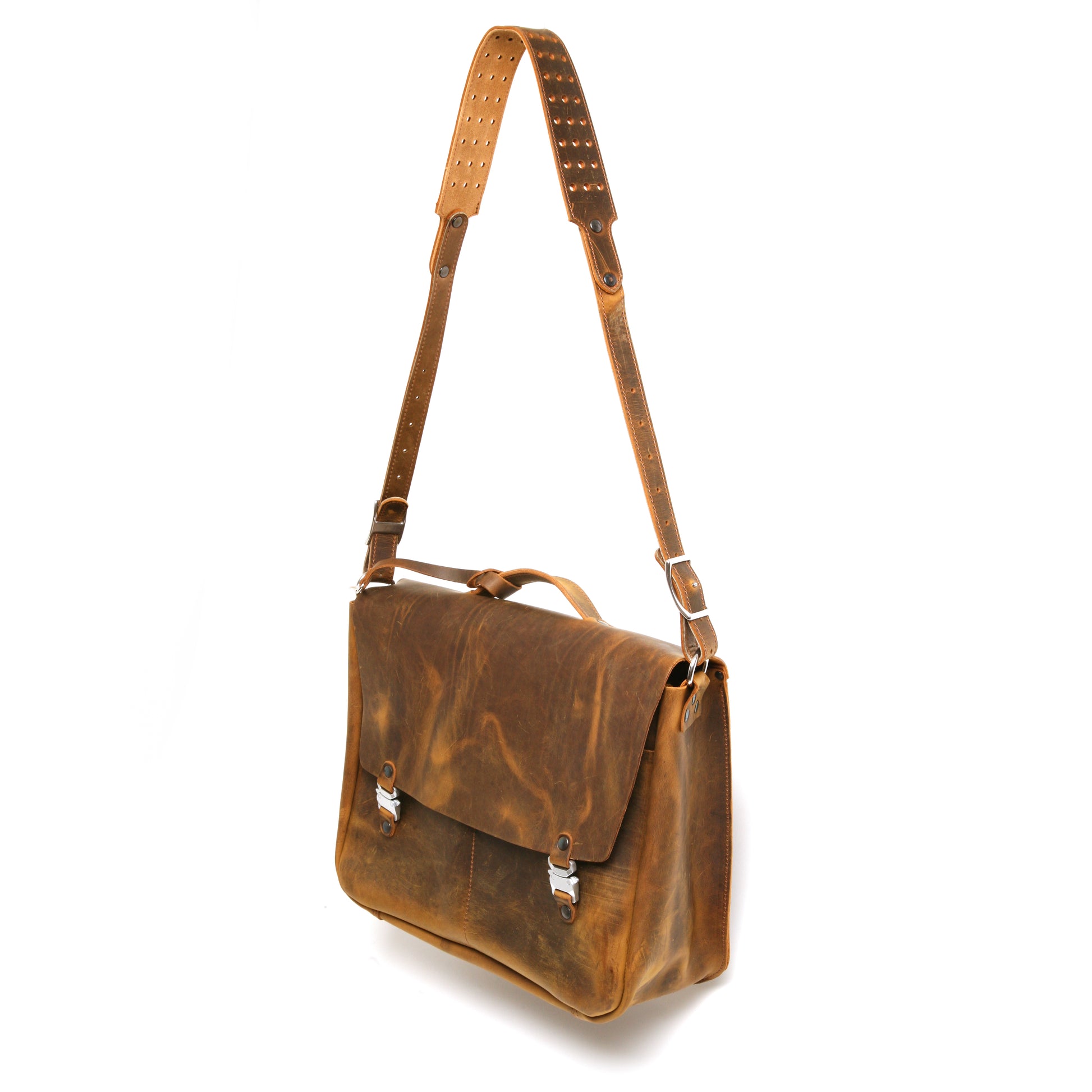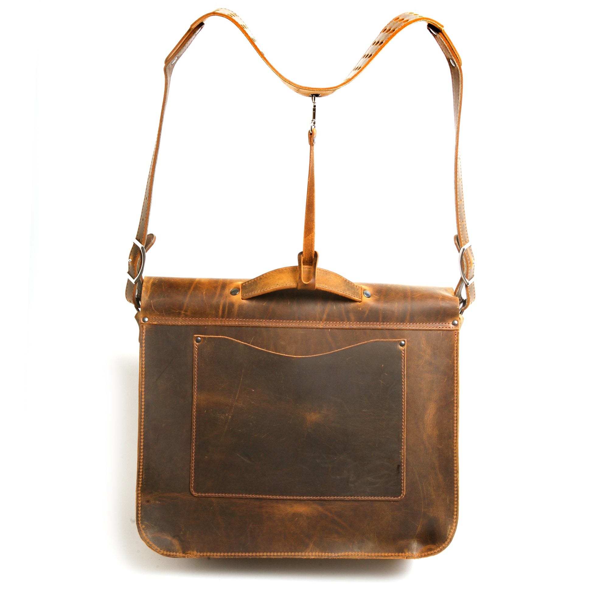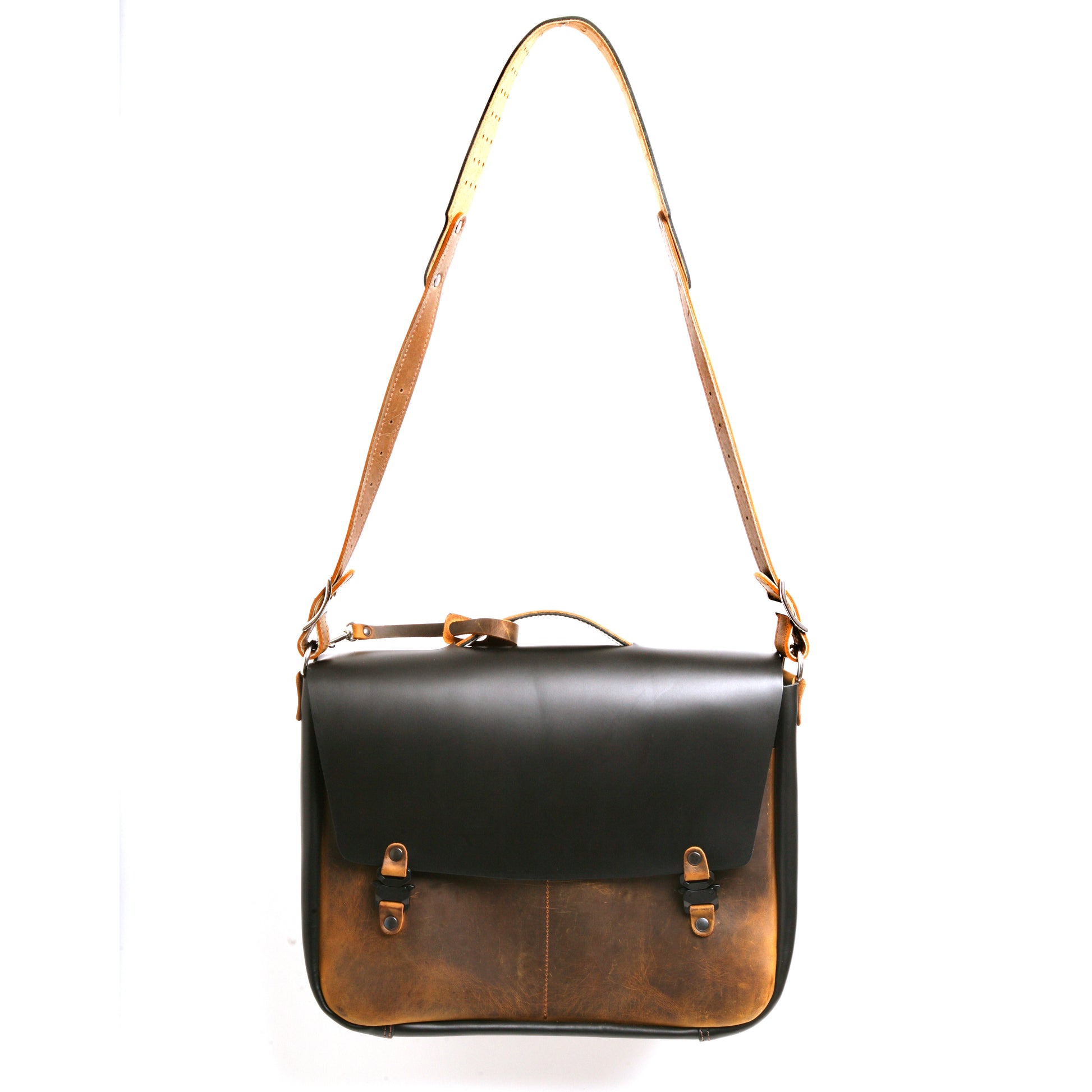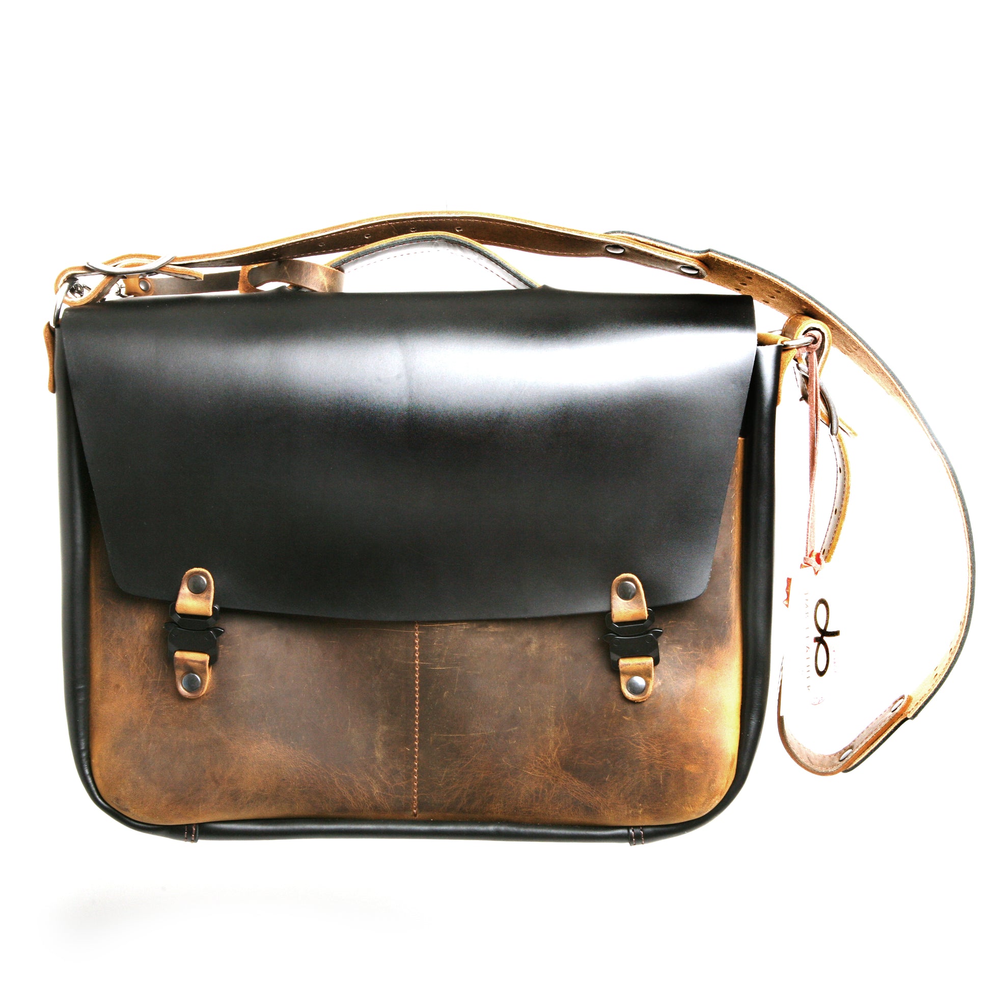 This professional messenger bag is designed with functionality in mind, featuring two spacious front pockets and a convenient patch pocket on the back for easy access. Made with durable full leather construction, reinforced with military grade quick release buckles and gunmetal rivets at key stress points, this bag is built to last through years of use. The handle is placed at the back to provide comfortable carrying, and the removable T strap quickly converts the shoulder strap into a backpack within seconds. Ideal for commutes, the backpack is designed to sit low on the back and off the shoulders. The structured black leather has a pull up and smooth finish combination for a sleek look. All JMB pieces are bench made in small, limited runs at the King Mountain atelier located in the foothills of the Canadian shield.