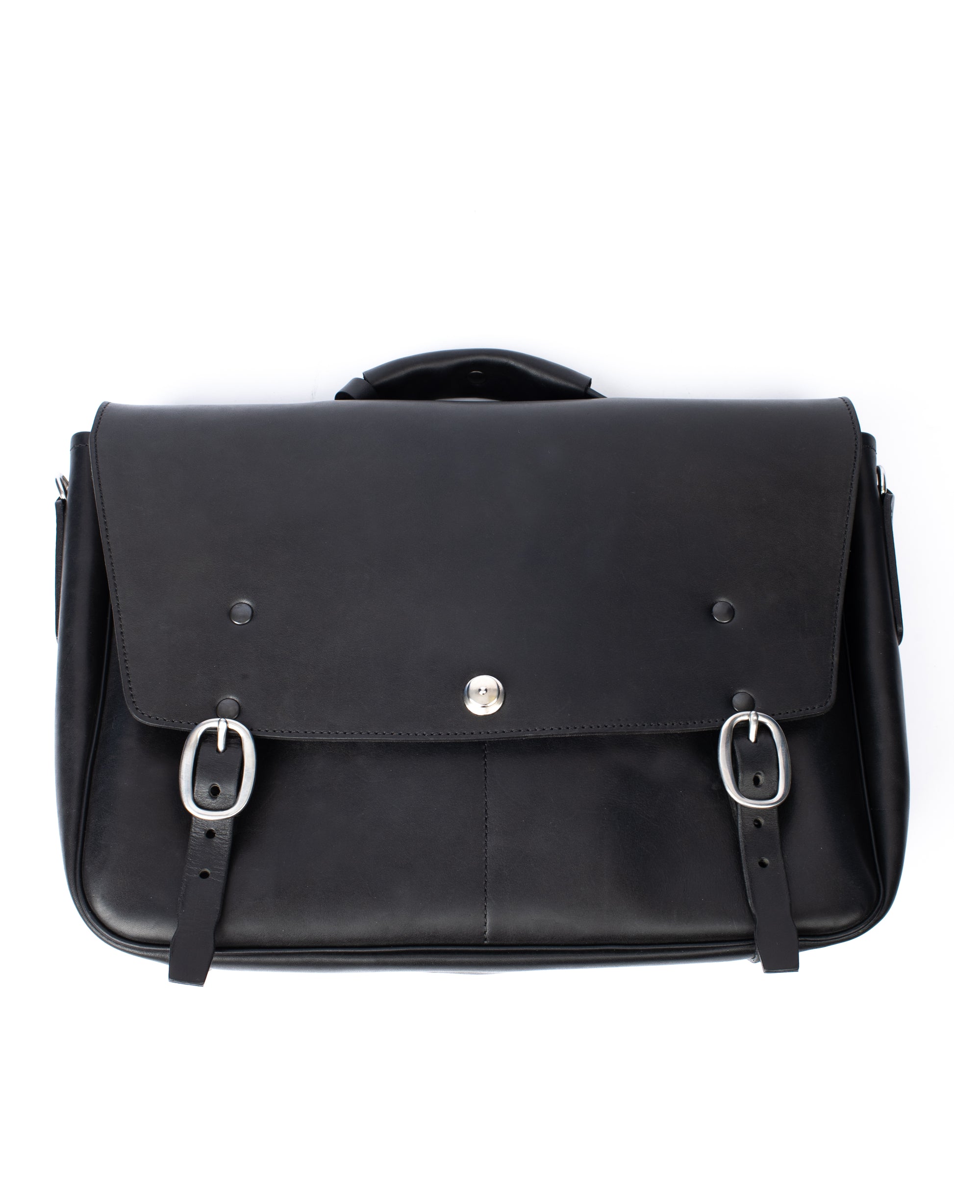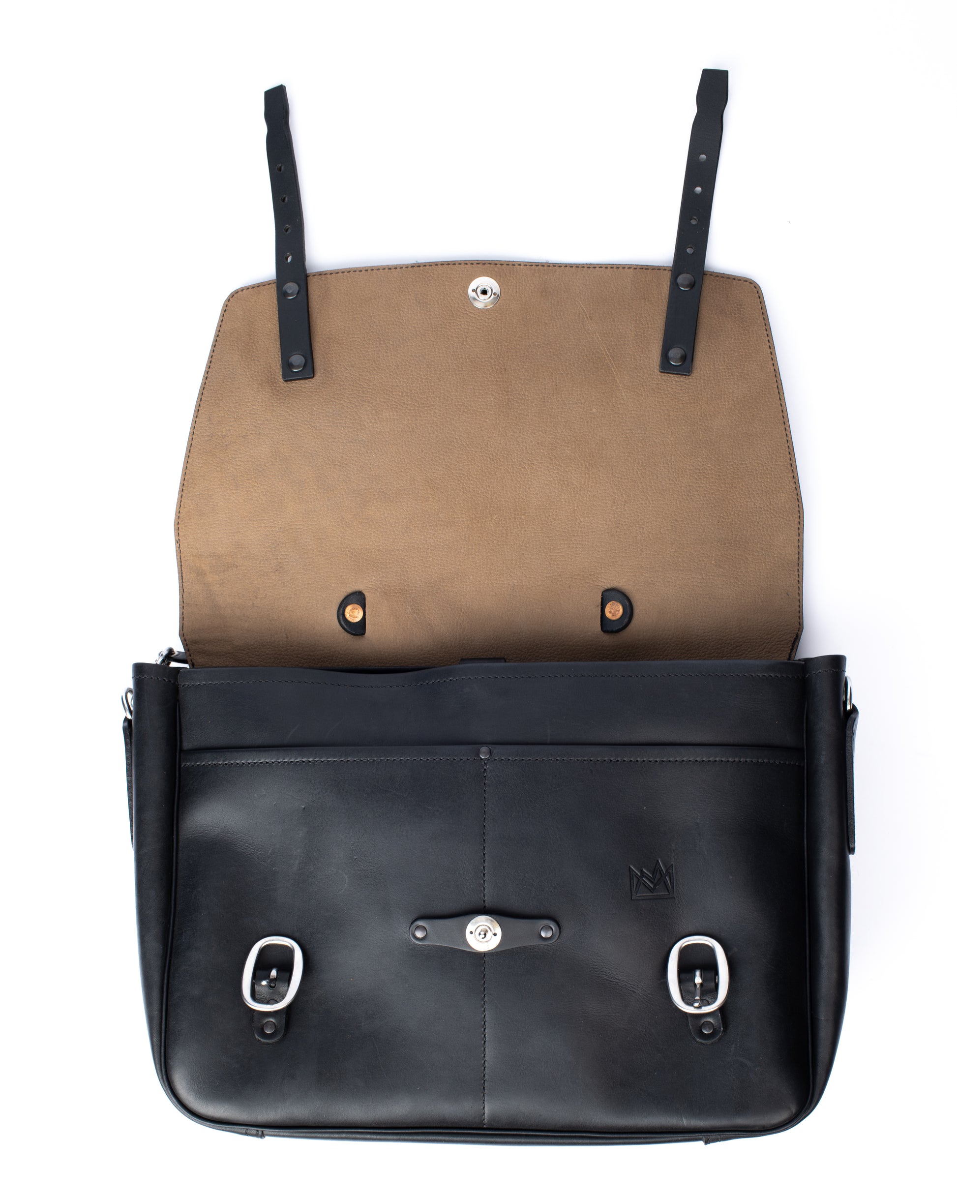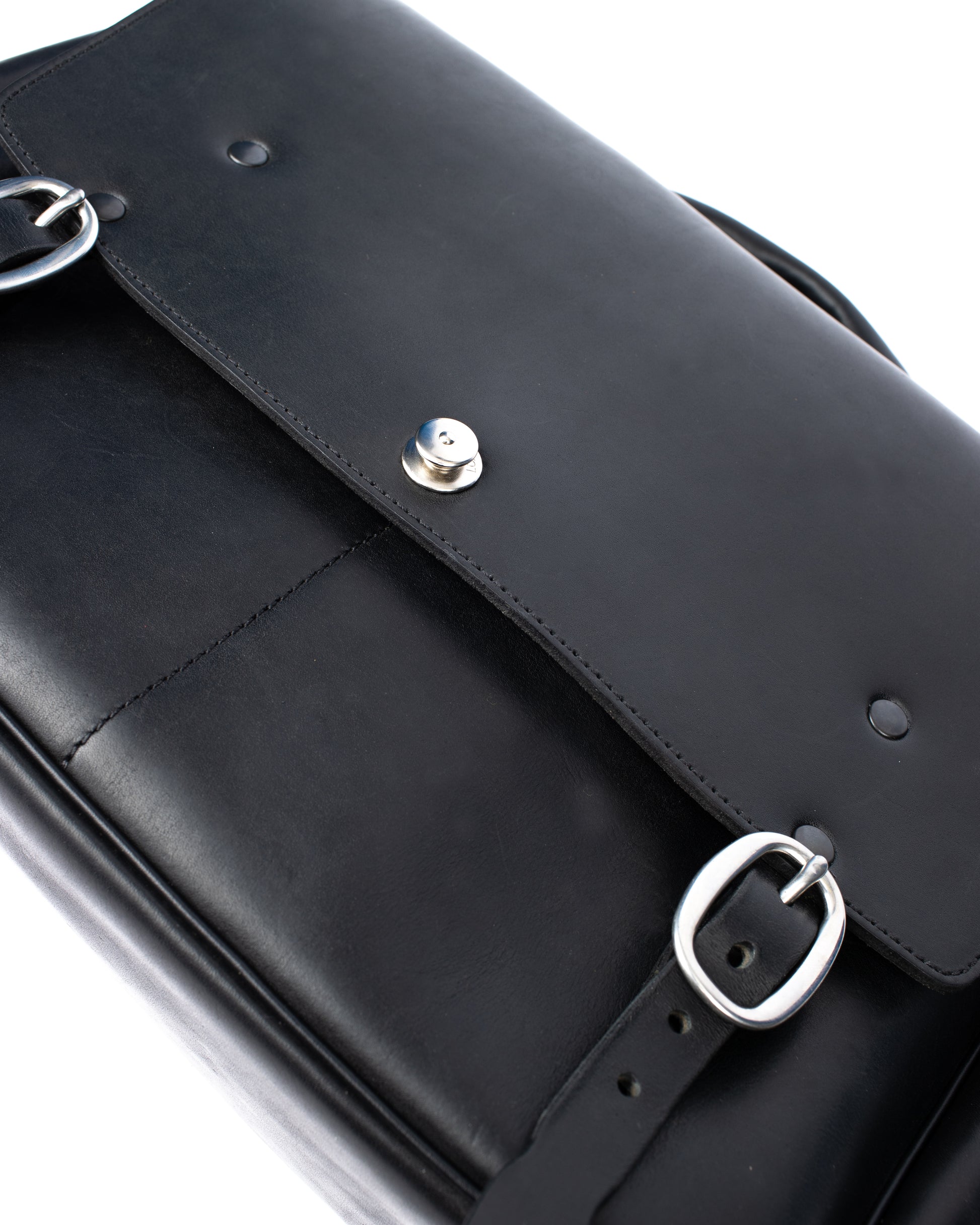 This clean and functional messenger bag features two large front drop pockets as well as a place for a pen or glasses. Inside it has a drop pocket for a phone. There is also a divider at the back that will accommodate a laptop. Full leather construction and reinforced with gunmetal rivets at all the key stress points to ensure years of use. The handle is set to the back of the bag and it comes with the removable T strap that converts the shoulder strap into a backpack in less than 5 seconds. The backpack sits low on the back and off the shoulders, perfect for commuting. The black leather is sourced from USA and has a light waxed finish.