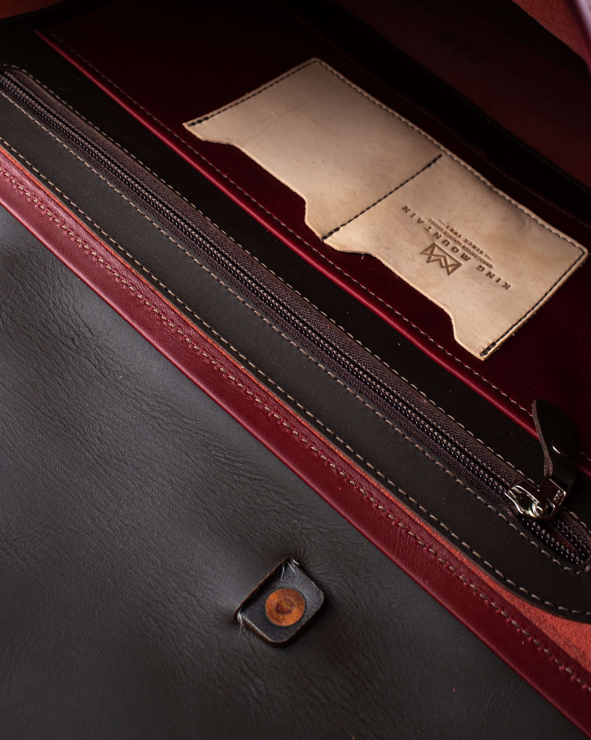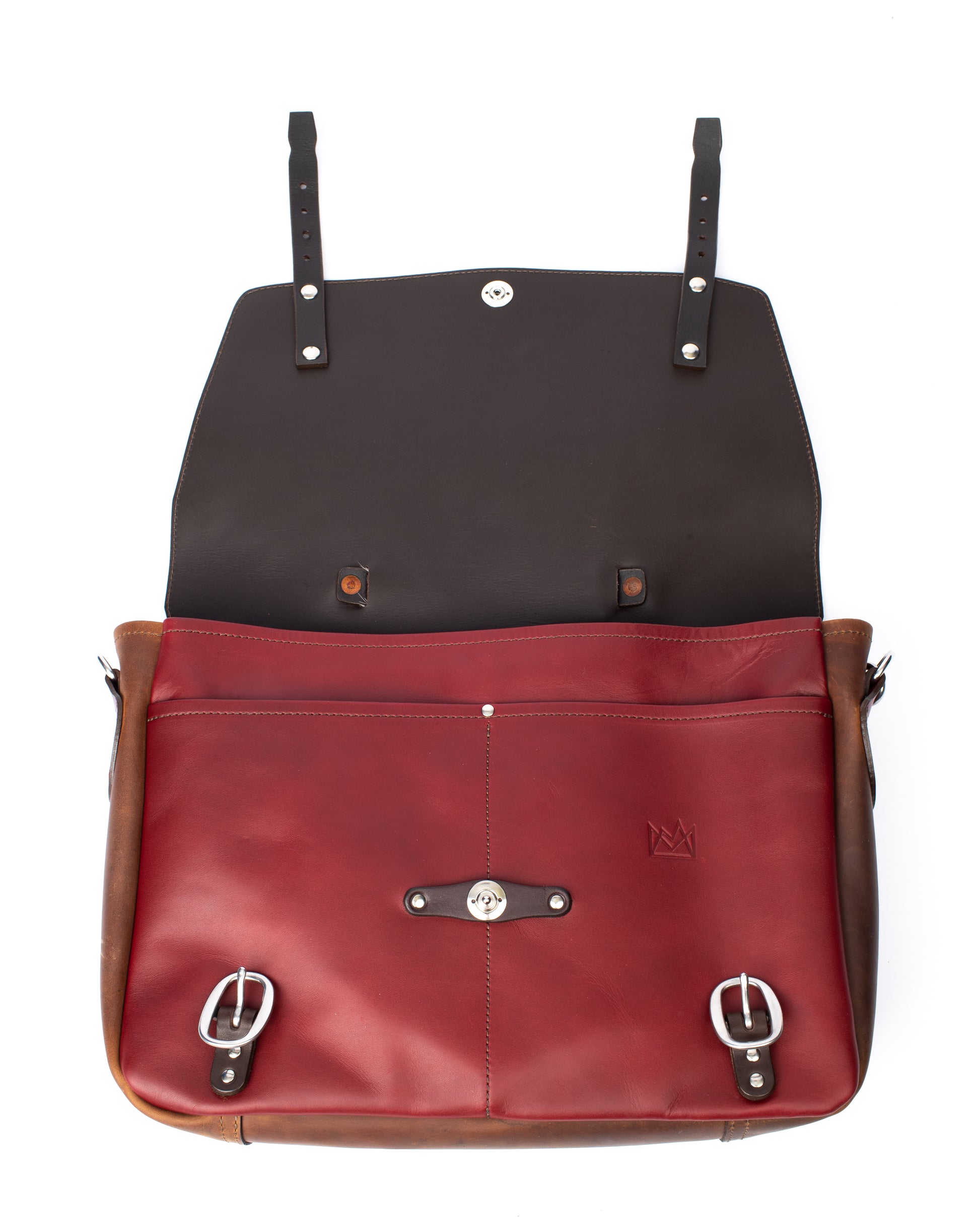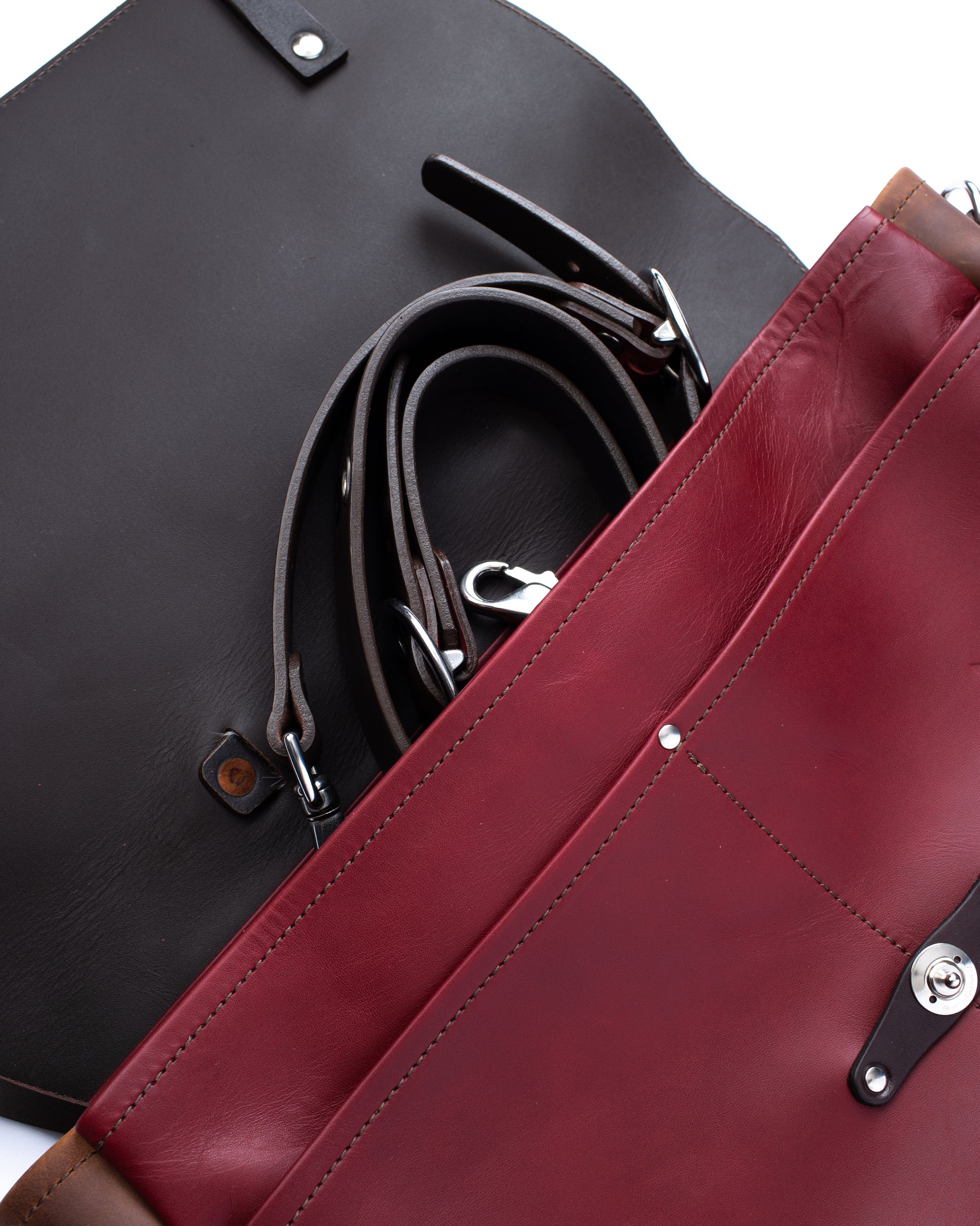 This clean and functional messenger bag features two large front drop pockets as well as a place for a pen or glasses. Inside it has a drop pocket for a phone. There is also a divider at the back that will accommodate a laptop. Full leather construction and reinforced with gunmetal rivets at all the key stress points to ensure years of use. The handle is set to the back of the bag and it comes with the removable T strap that converts the shoulder strap into a backpack in less than 5 seconds. The backpack sits low on the back and off the shoulders, perfect for commuting. The black leather is sourced from USA and has a light waxed finish.