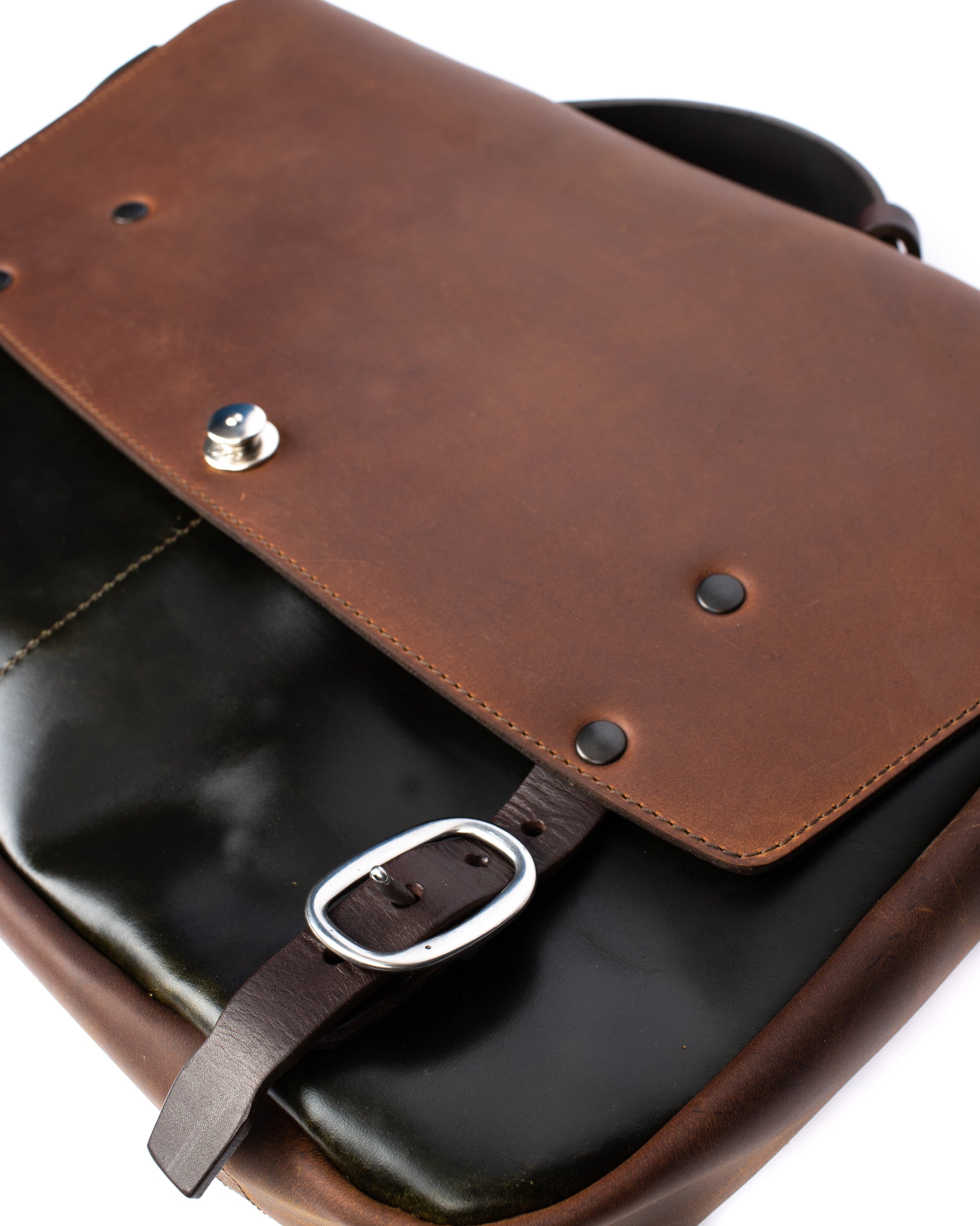 This clean and functional messenger bag features two large front drop pockets as well as a place for a pen or glasses. Inside it has a drop pocket for a phone. There is also a divider at the back that will accommodate a laptop. Full leather construction and reinforced with gunmetal rivets at all the key stress points to ensure years of use. The handle is set to the back of the bag and it comes with the removable T strap that converts the shoulder strap into a backpack in less than 5 seconds. The backpack sits low on the back and off the shoulders, perfect for commuting. The black leather is sourced from USA and has a light waxed finish.