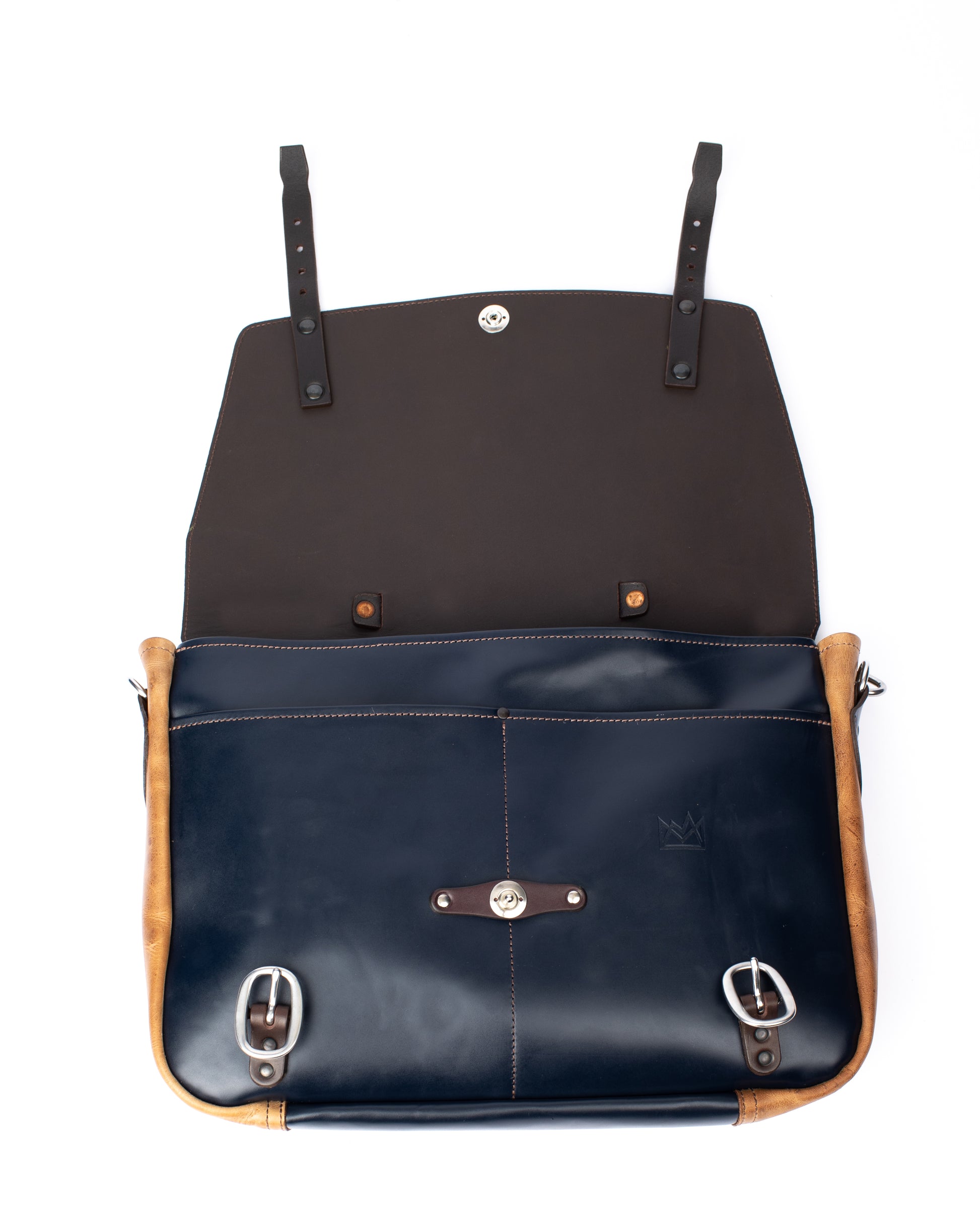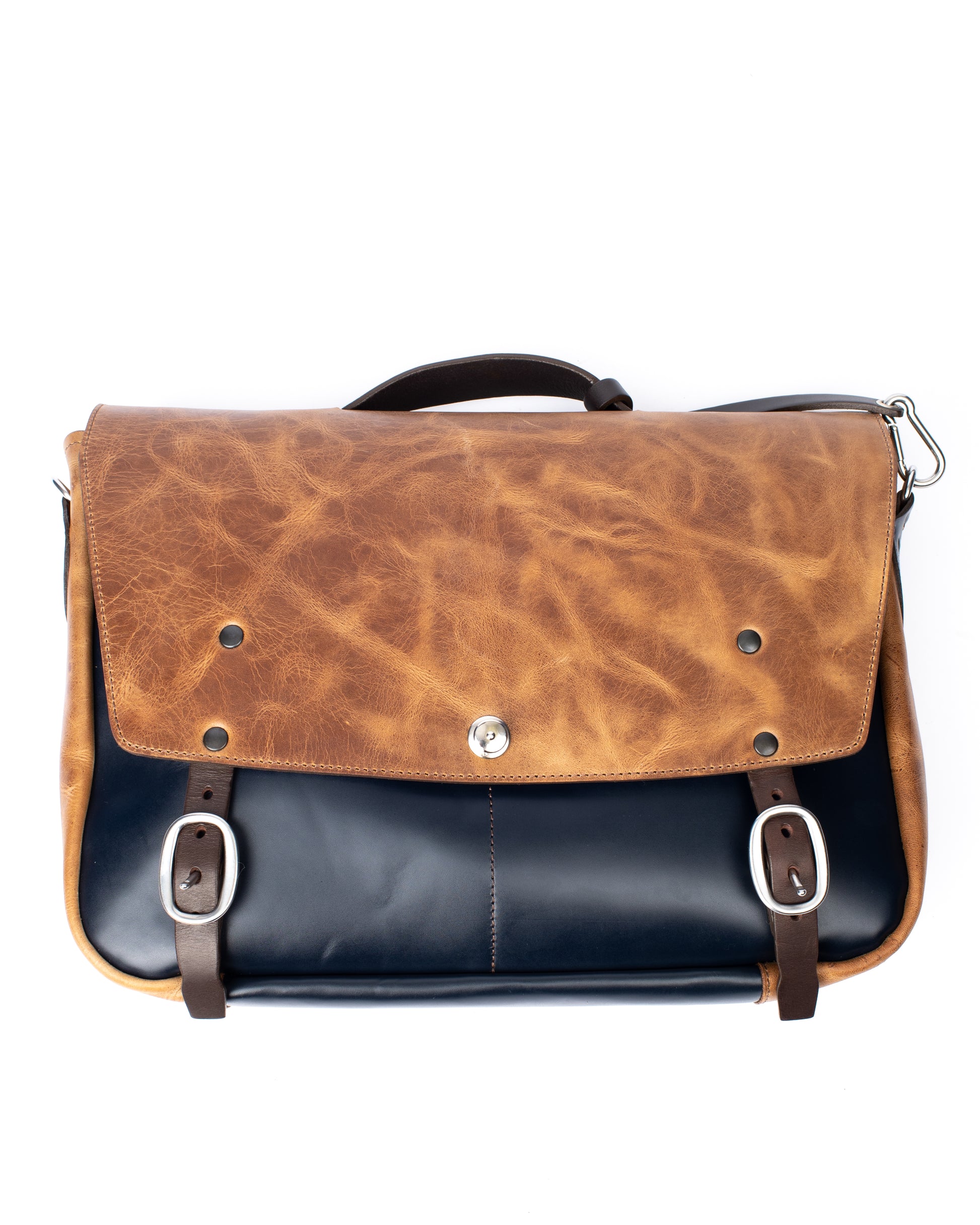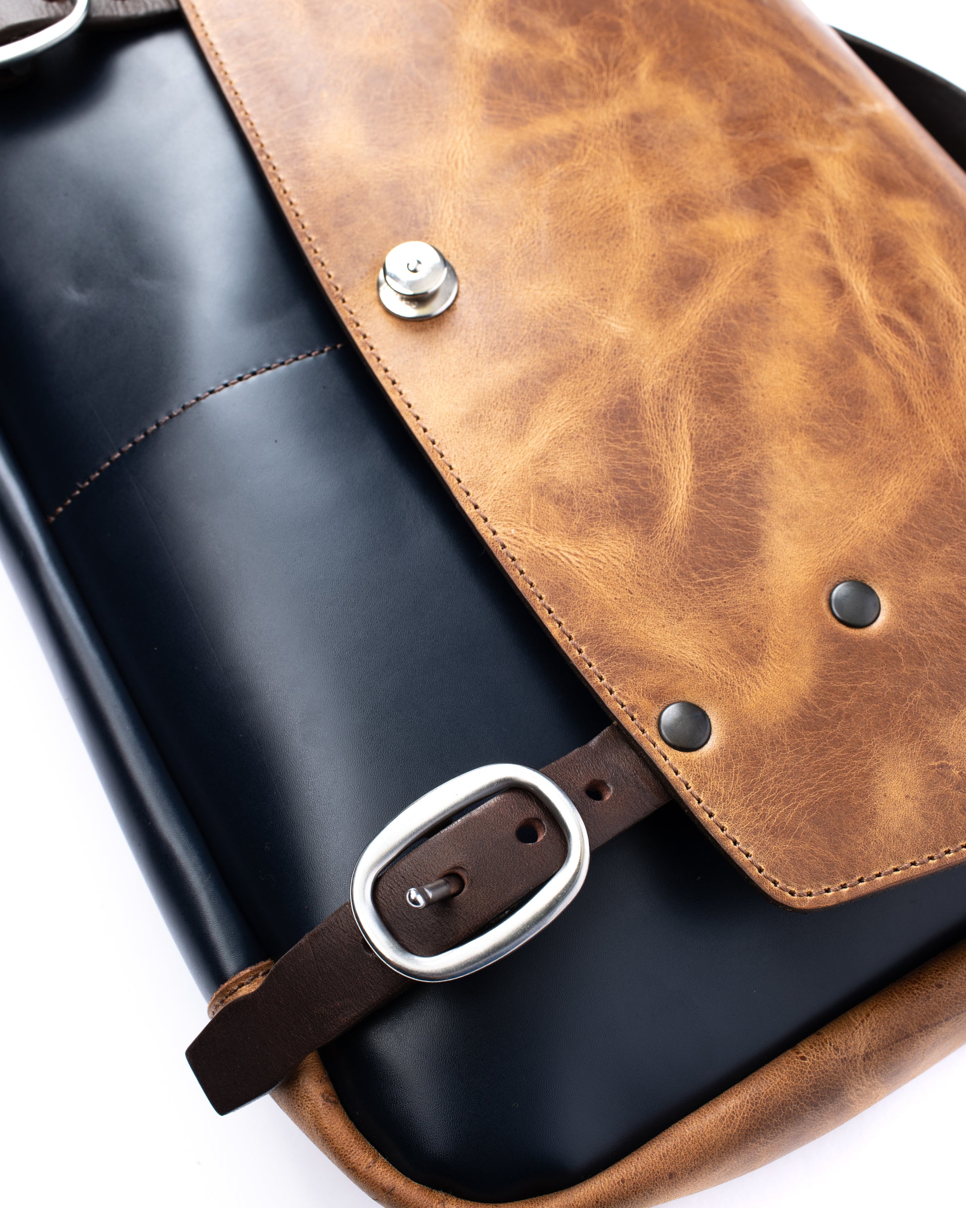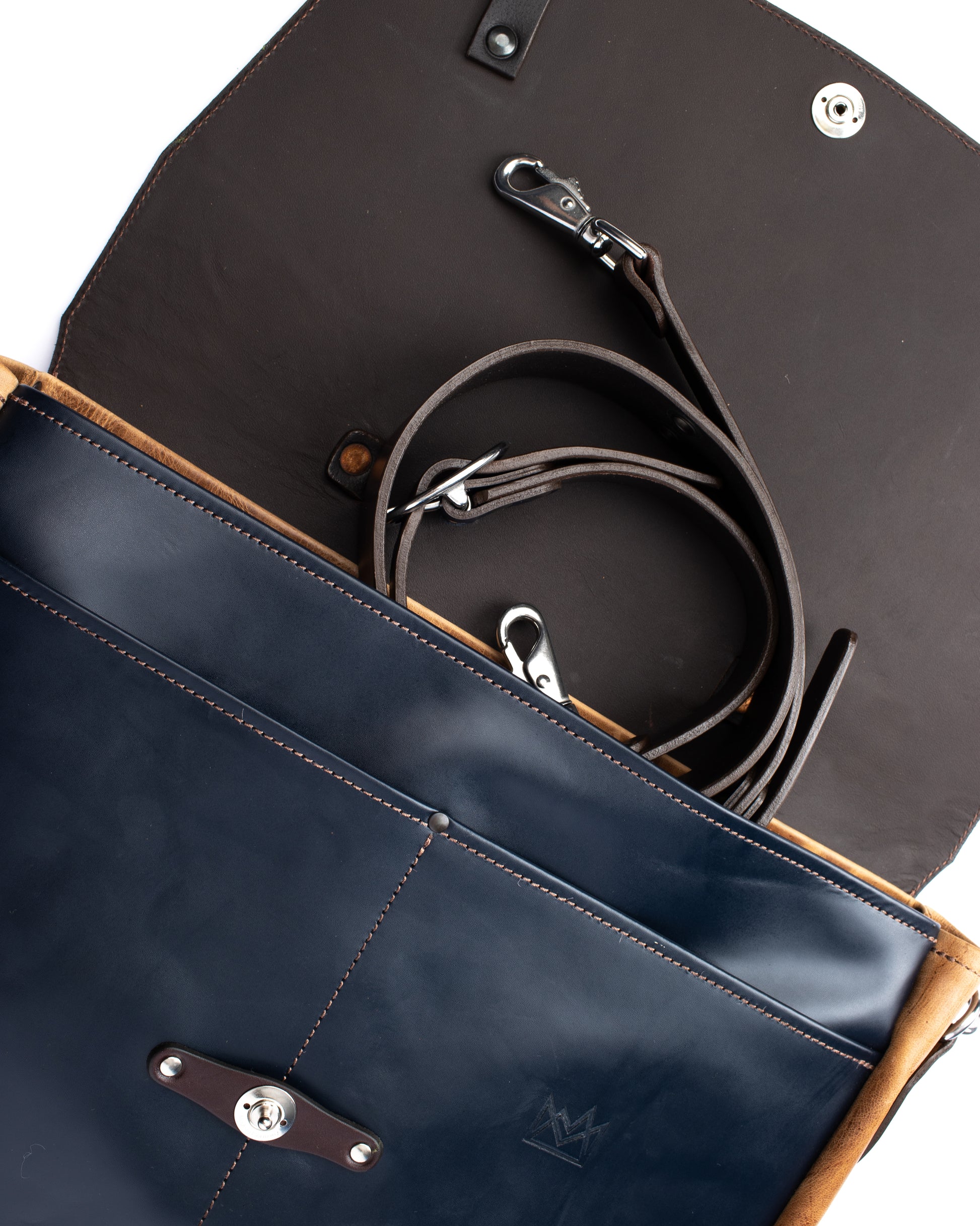 This clean and functional messenger bag features two large front drop pockets as well as a place for a pen or glasses. Inside it has a drop pocket for a phone. There is also a divider at the back that will accommodate a laptop. Full leather construction and reinforced with gunmetal rivets at all the key stress points to ensure years of use. The handle is set to the back of the bag and it comes with the removable T strap that converts the shoulder strap into a backpack in less than 5 seconds. The backpack sits low on the back and off the shoulders, perfect for commuting. The black leather is sourced from USA and has a light waxed finish.