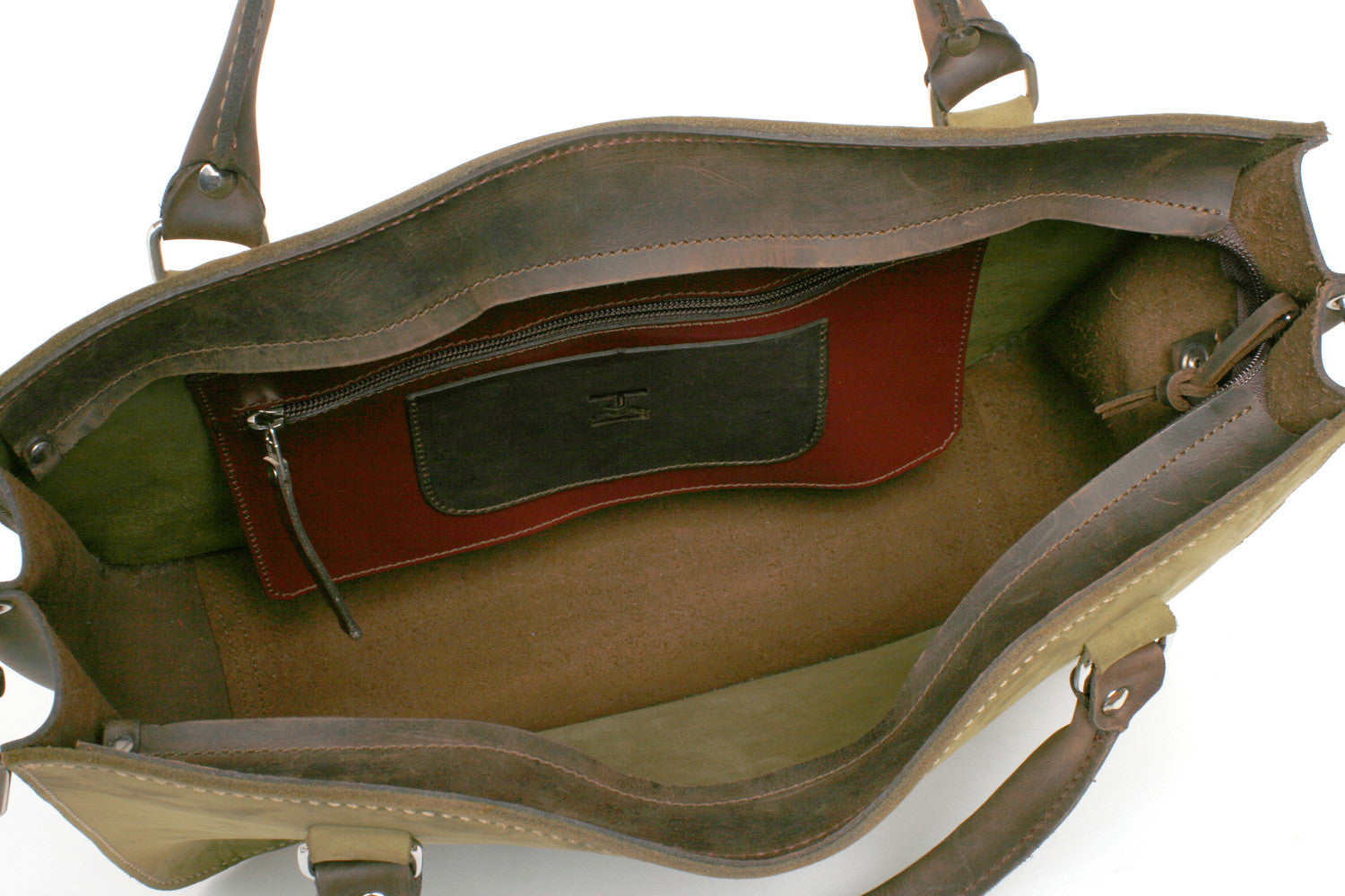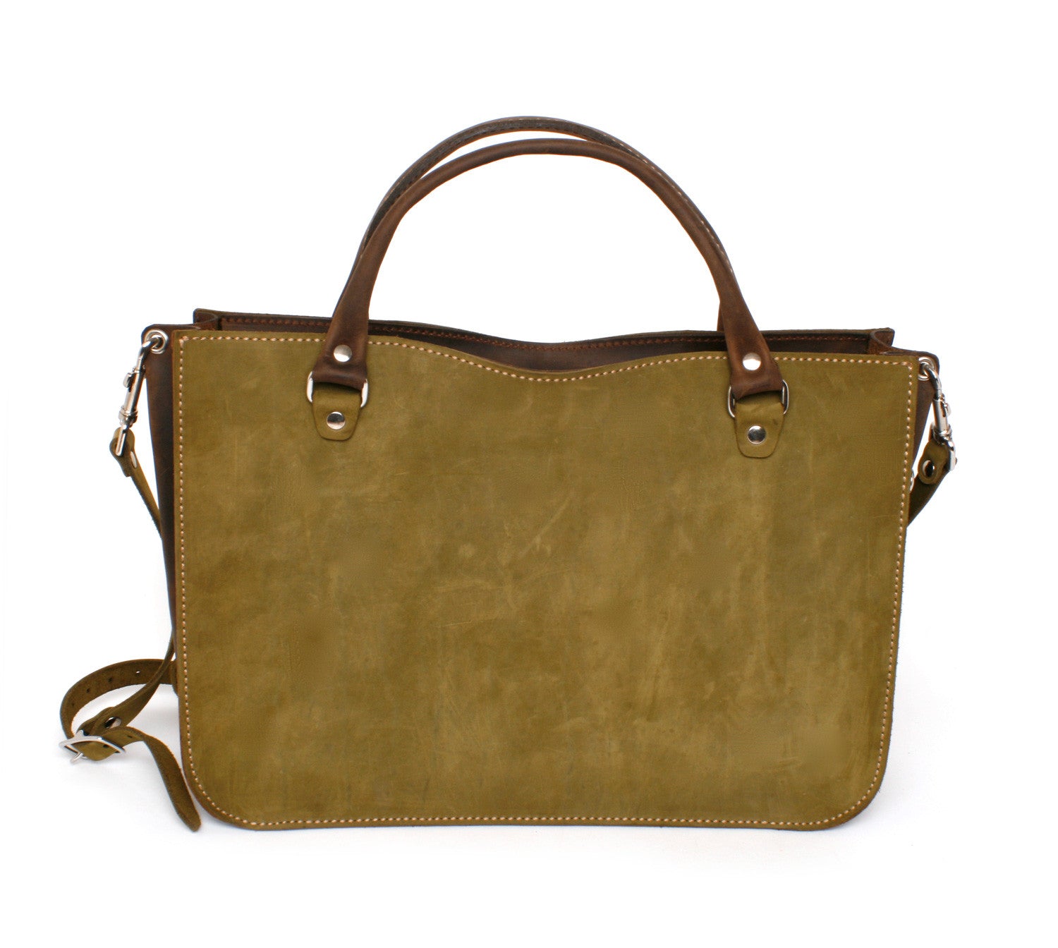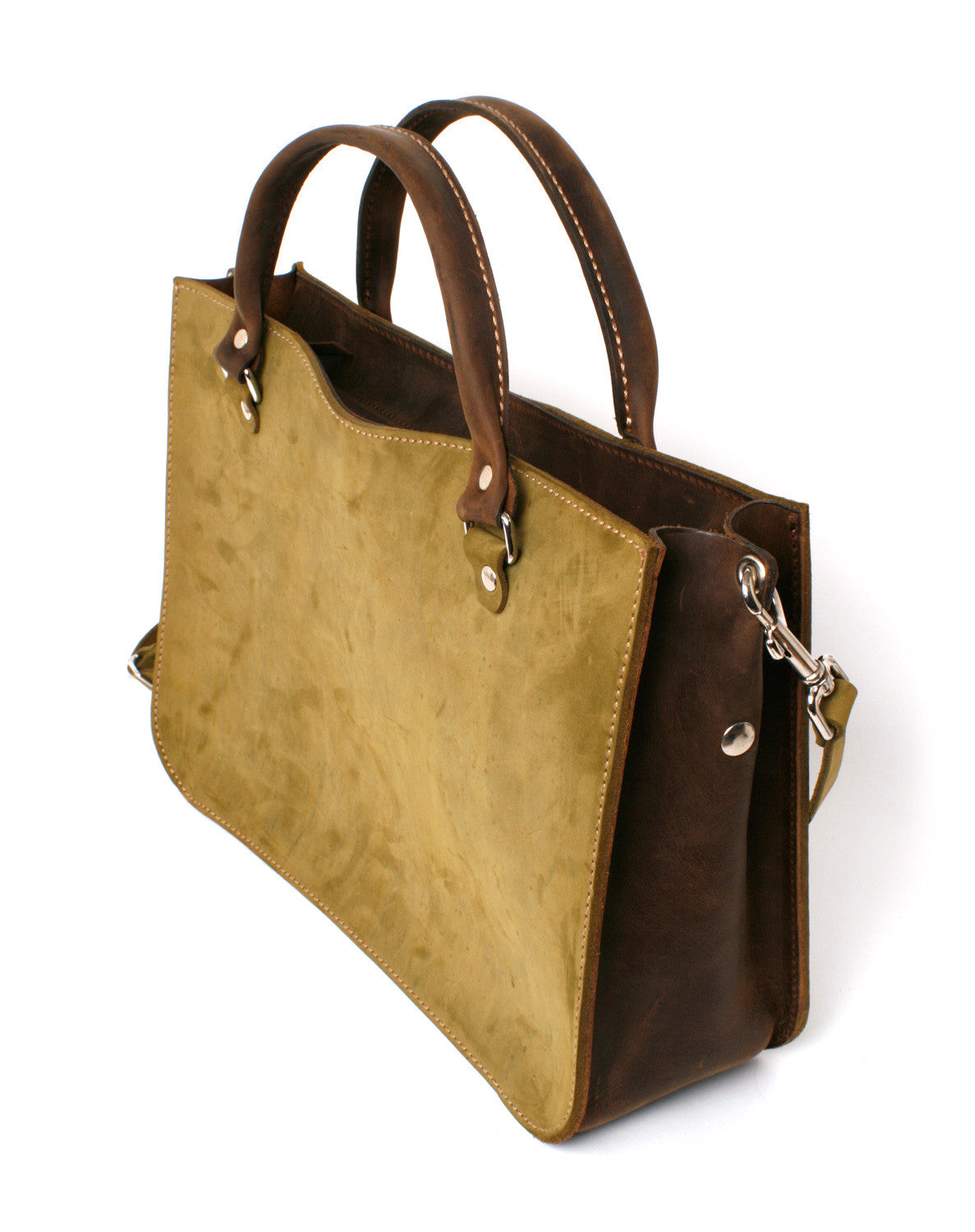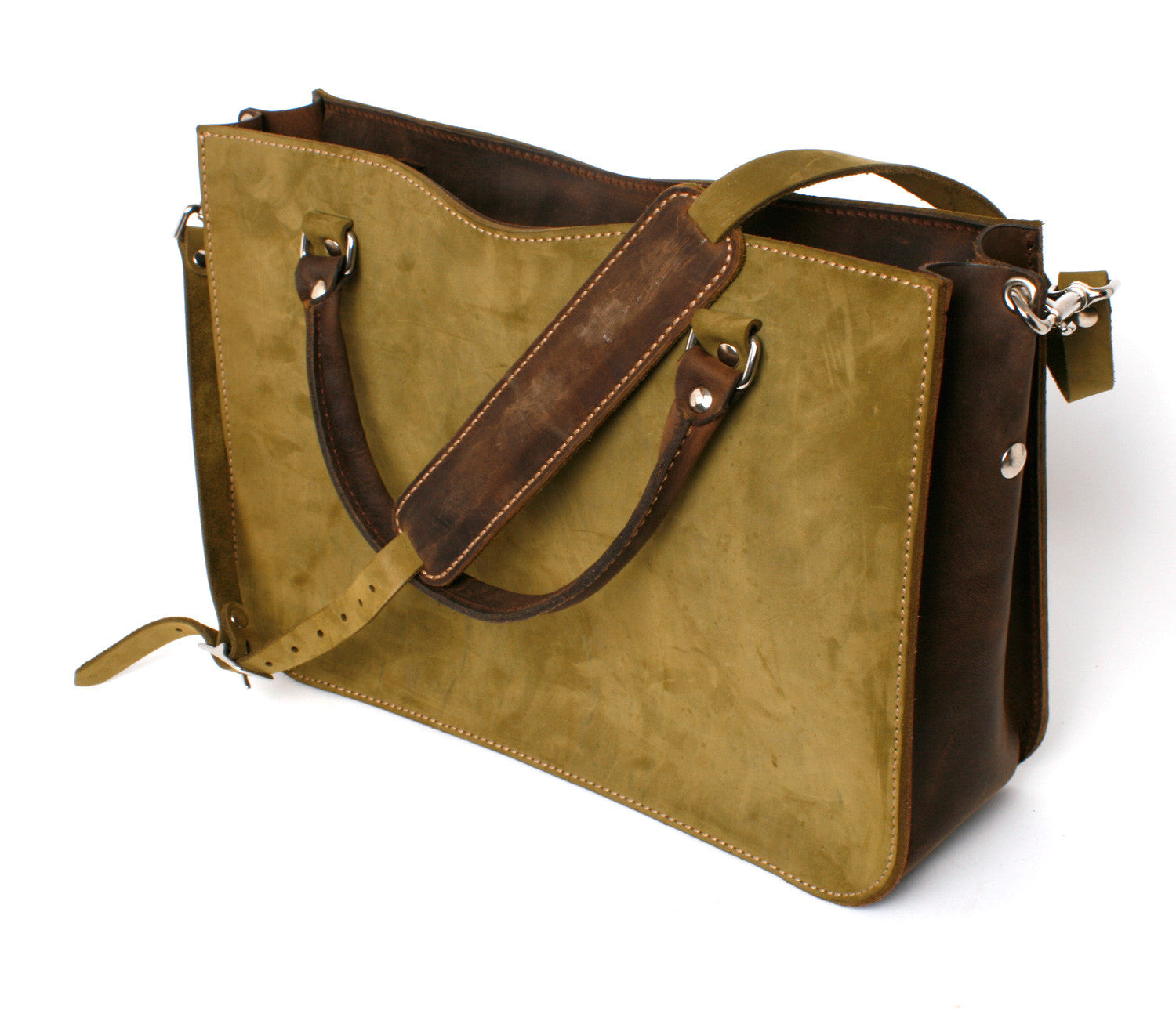 The CHAGA tote is a sleek option for carrying your daily essentials, including documents and gadgets. It is built to endure a lifetime of use and features an interior patch pocket and full leather sleeve pocket. The padded shoulder strap is detachable, allowing for use as a cross-body or tote. The solid cast harness hardware and heavy nylon thread stitching guarantee durability during travel and everyday use. It is made with 10oz. green nubuck and copper brown crazy horse and buffalo leather for the interior pockets.
