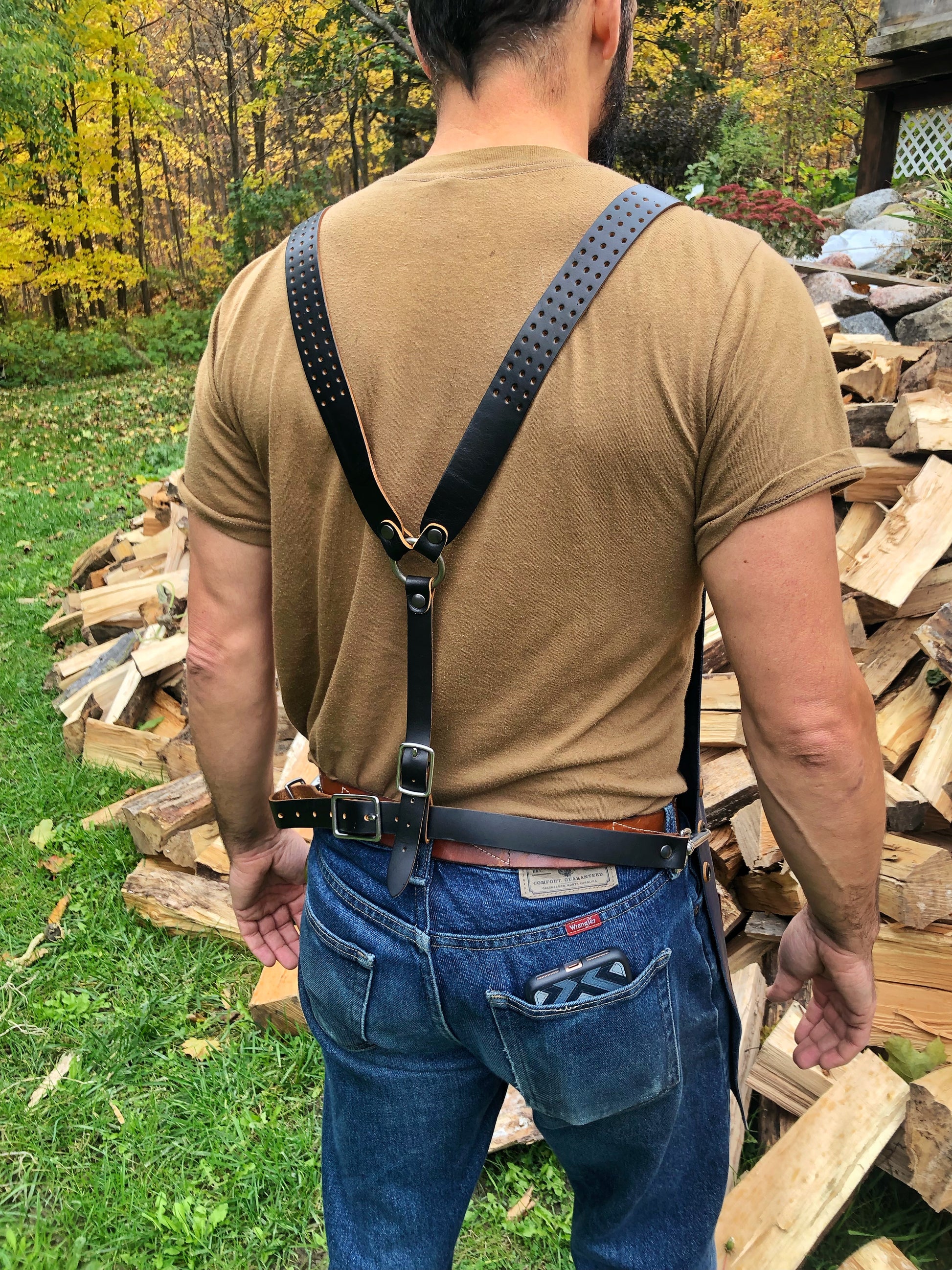 The classic apron is made of one big panel of top grain leather, no seams. The top edge is rolled and glued for firmness and comfort. There are two pockets reinforced with rivets and thick vegetable tanned leather for edge firmness and durability. The apron can be adjusted just the way you like with three sets of grommets on the sides as well as a fully adjustable strap harness system utilizing the Y-strap design, taking needless stress off the neck and placing load on the ventilated shoulder straps. All the hardware is solid stainless steel with exception of the removeable cast brass towel ring.