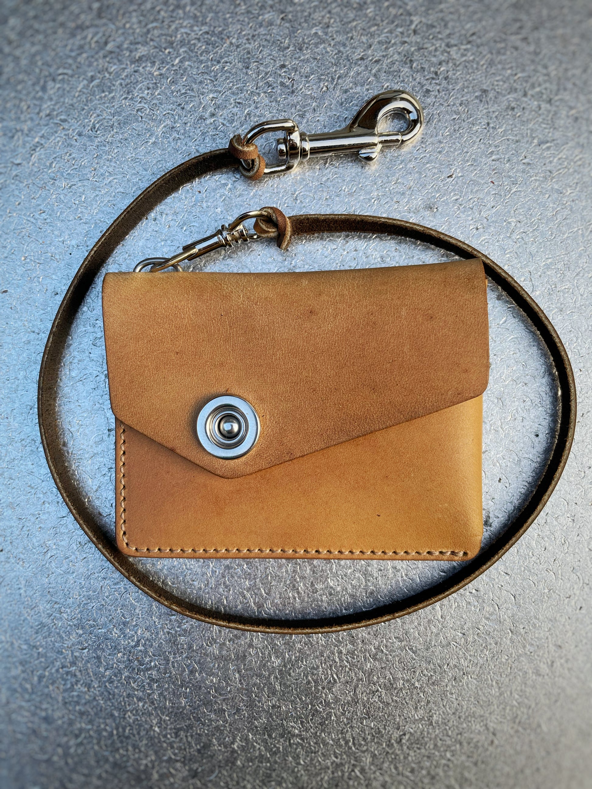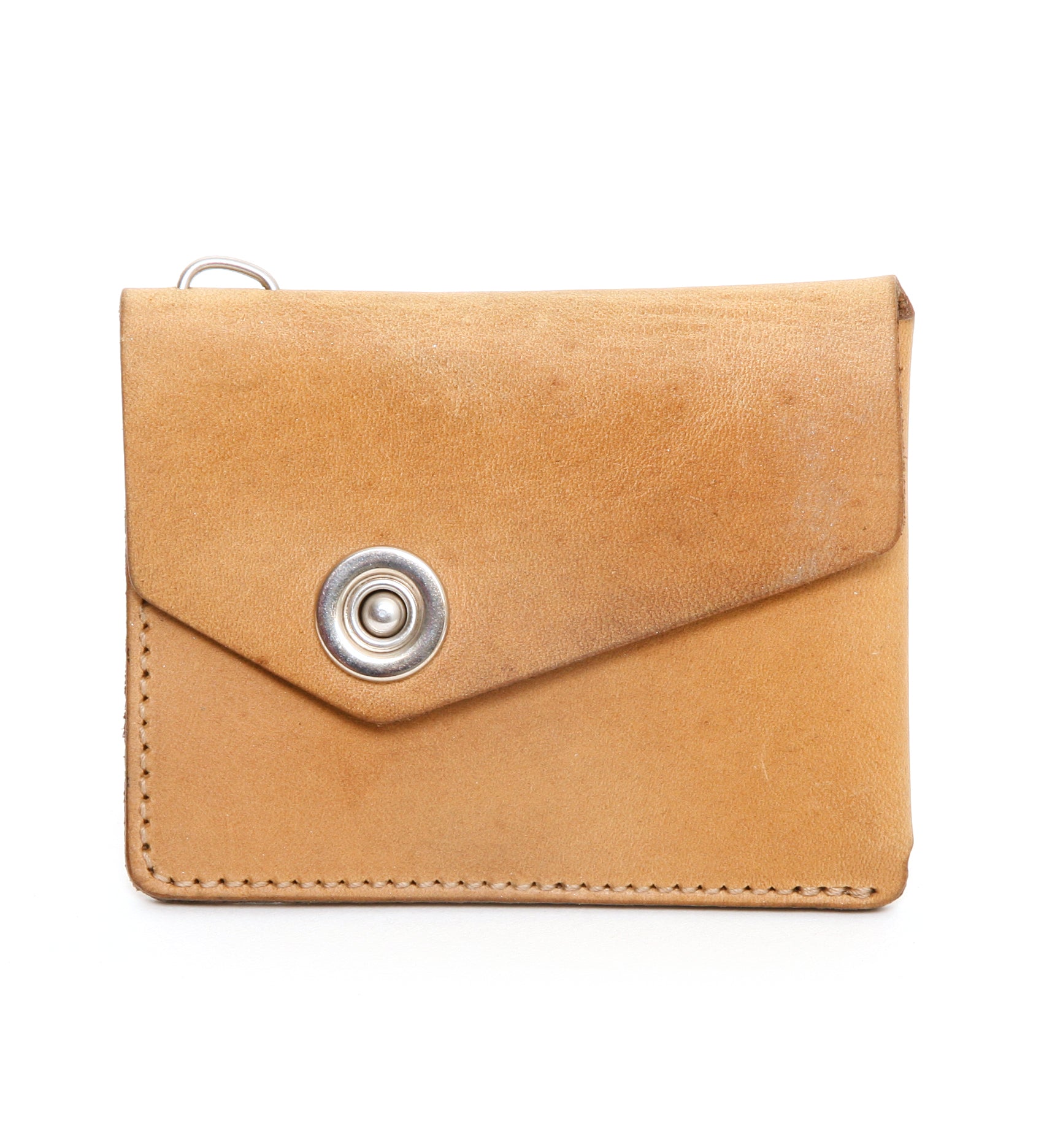 The CODA wallet is made of one piece of 4oz leather and stitched up with heavy nylon thread. It features carefully burnished edges and a solid brass grommet snap from Japan. It has a stainless steel loop integrated to attach the 18" lanyard. Its simplicity and asymmetric design are deceiving to just how much it can hold while keeping your pocket bulk to a minimum.