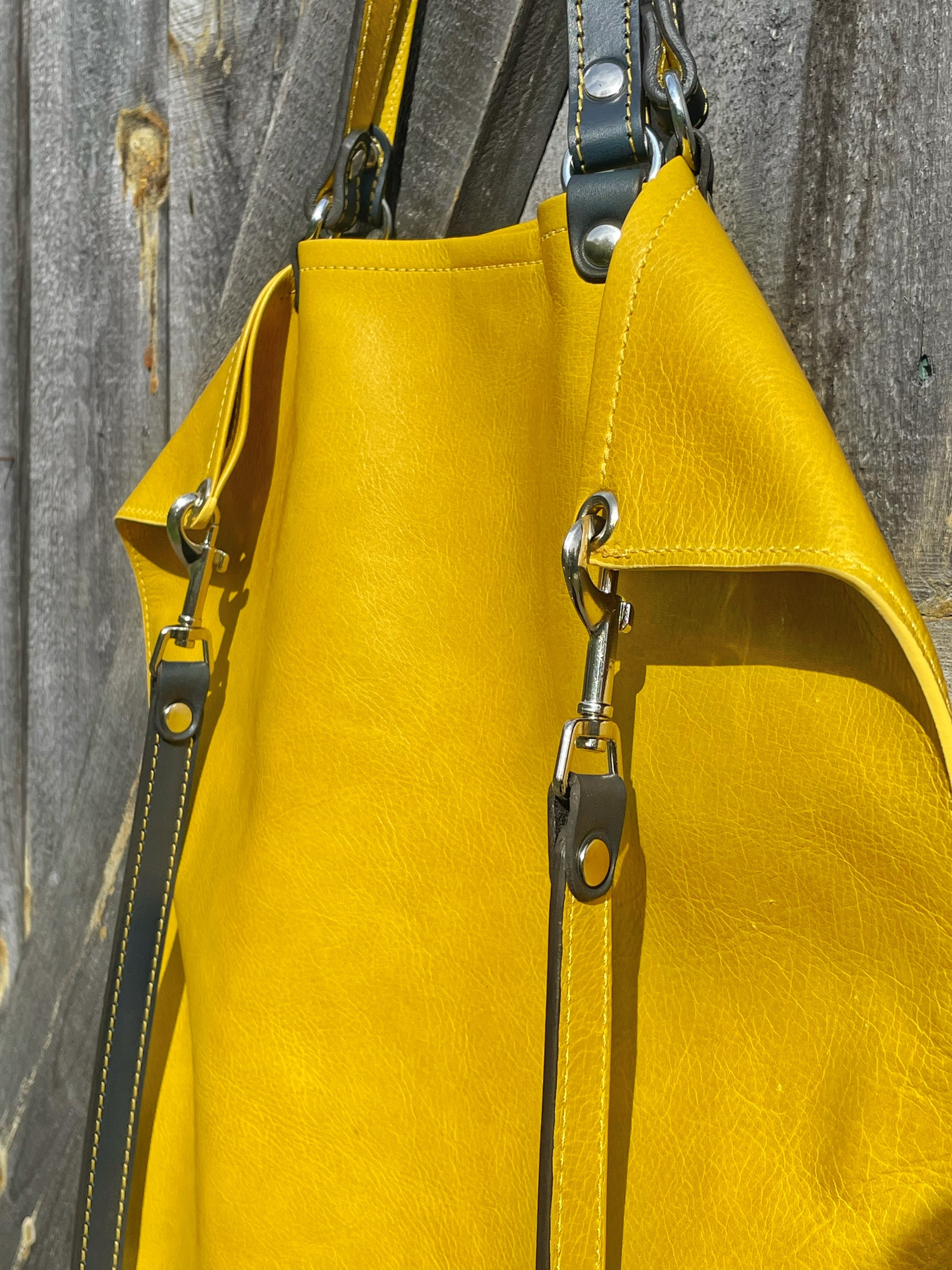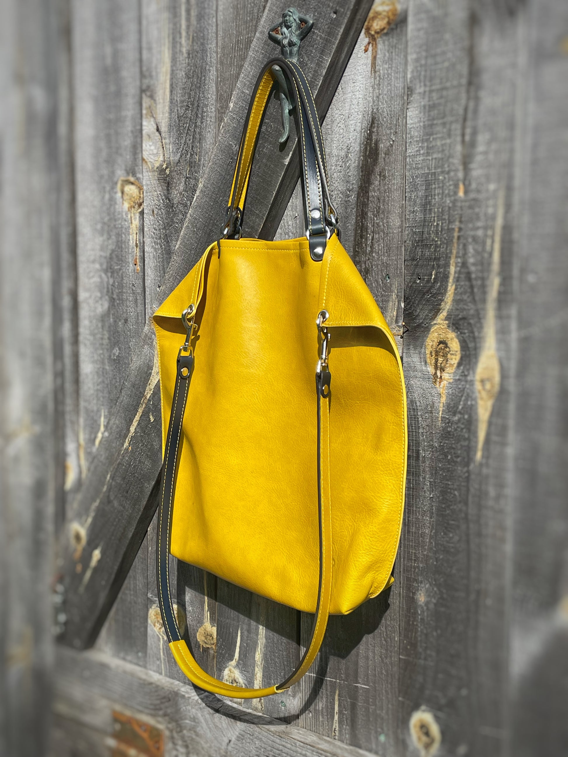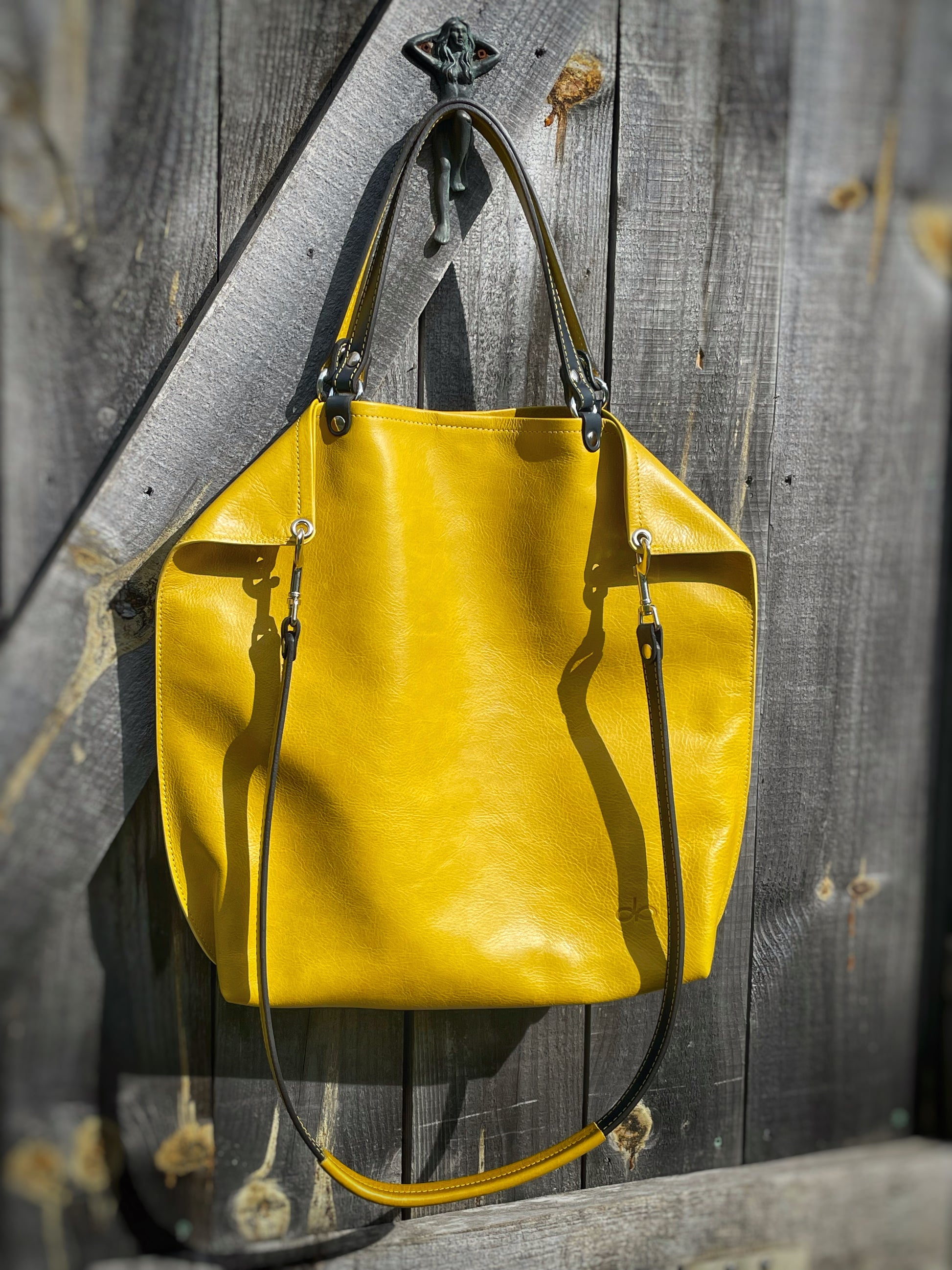 The KIKI is a chic modern tote. It's slim profile make it great for everyday use. There is one large zipper pocket on the interior and a smaller pocket with a cell phone sleeve inside. The cross body strap hangs across the body giving a folded corner look
