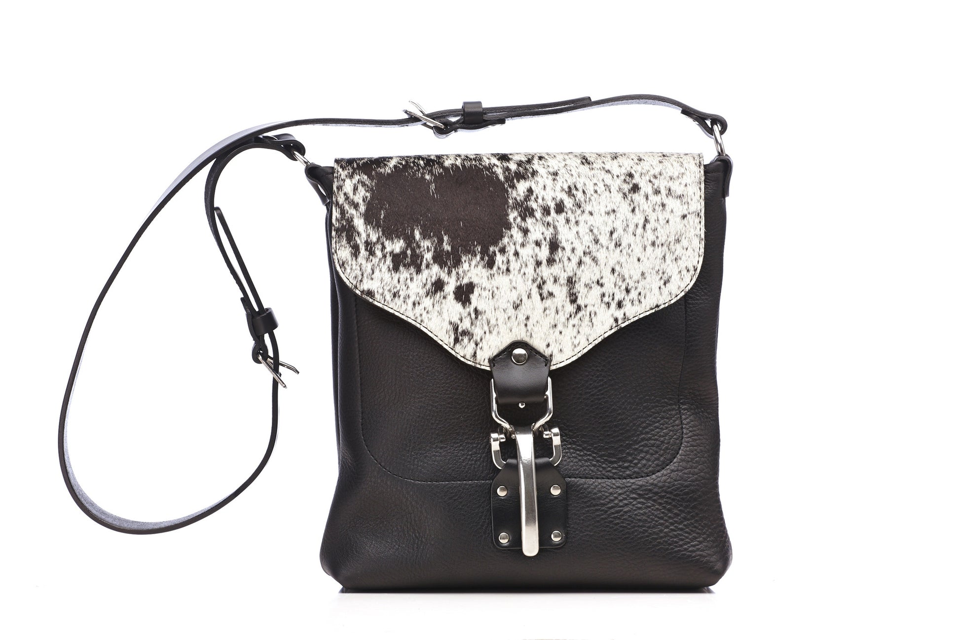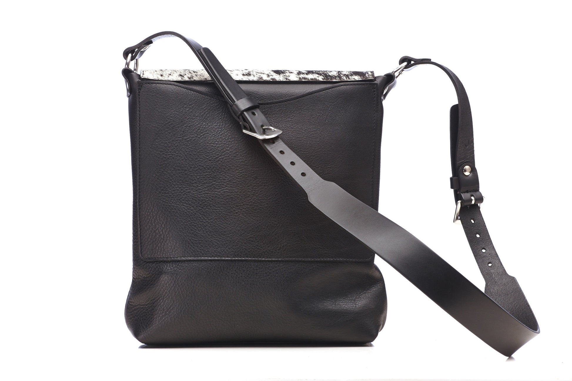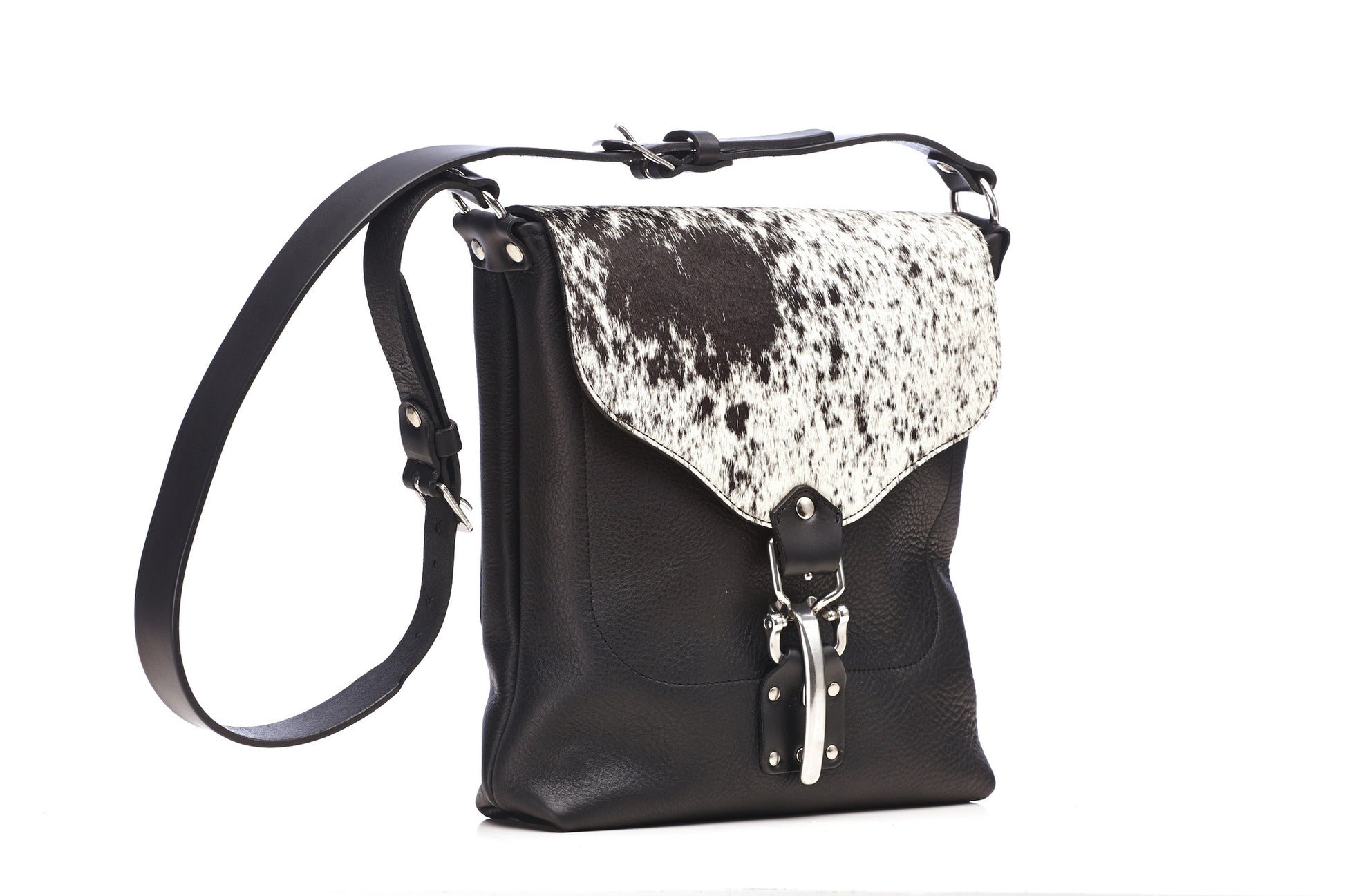 Fully constructed of heavy weight oil tanned leather and riveted at all stress points. The flap is cow hair and strapping are 10oz bridle leather. The Kuuru shoulder bag has several interior pockets and one large zippered external pocket on the front. It features an easy to use closure that has an additional snap strap for added security when needed. The shoulder strap is removable. All hardware is cast stainless steel harness grade. It has a reinforced bottom and metal feet.