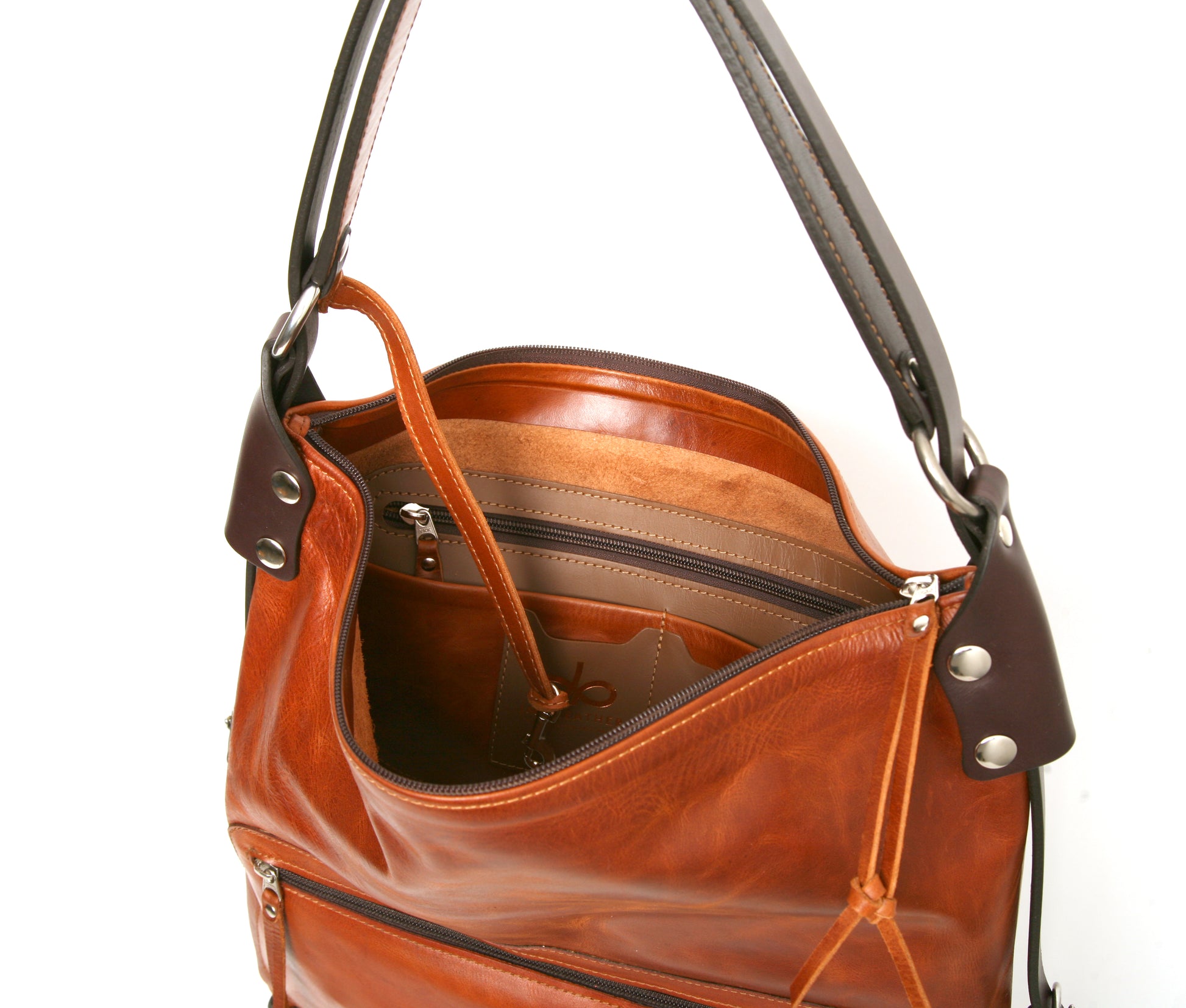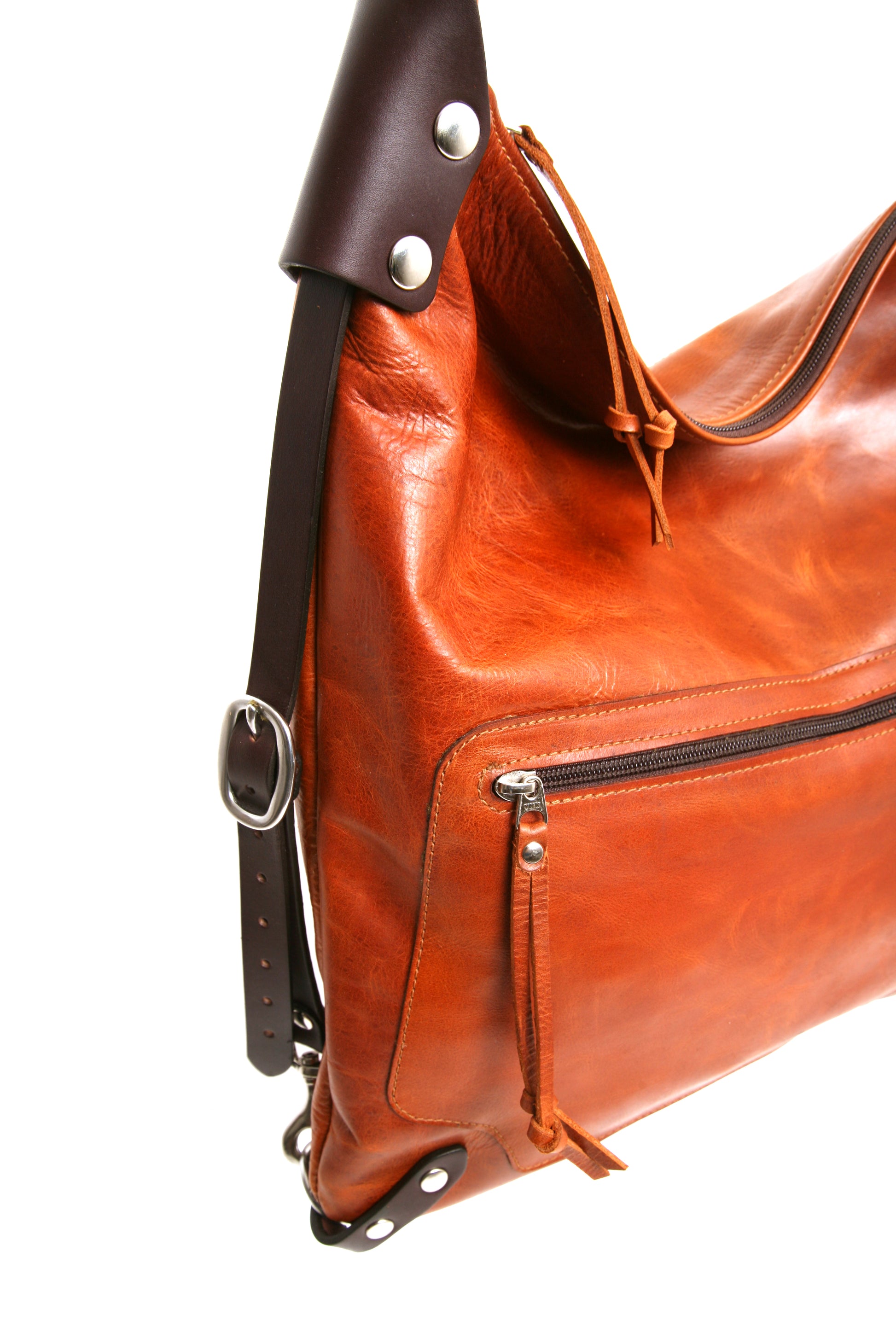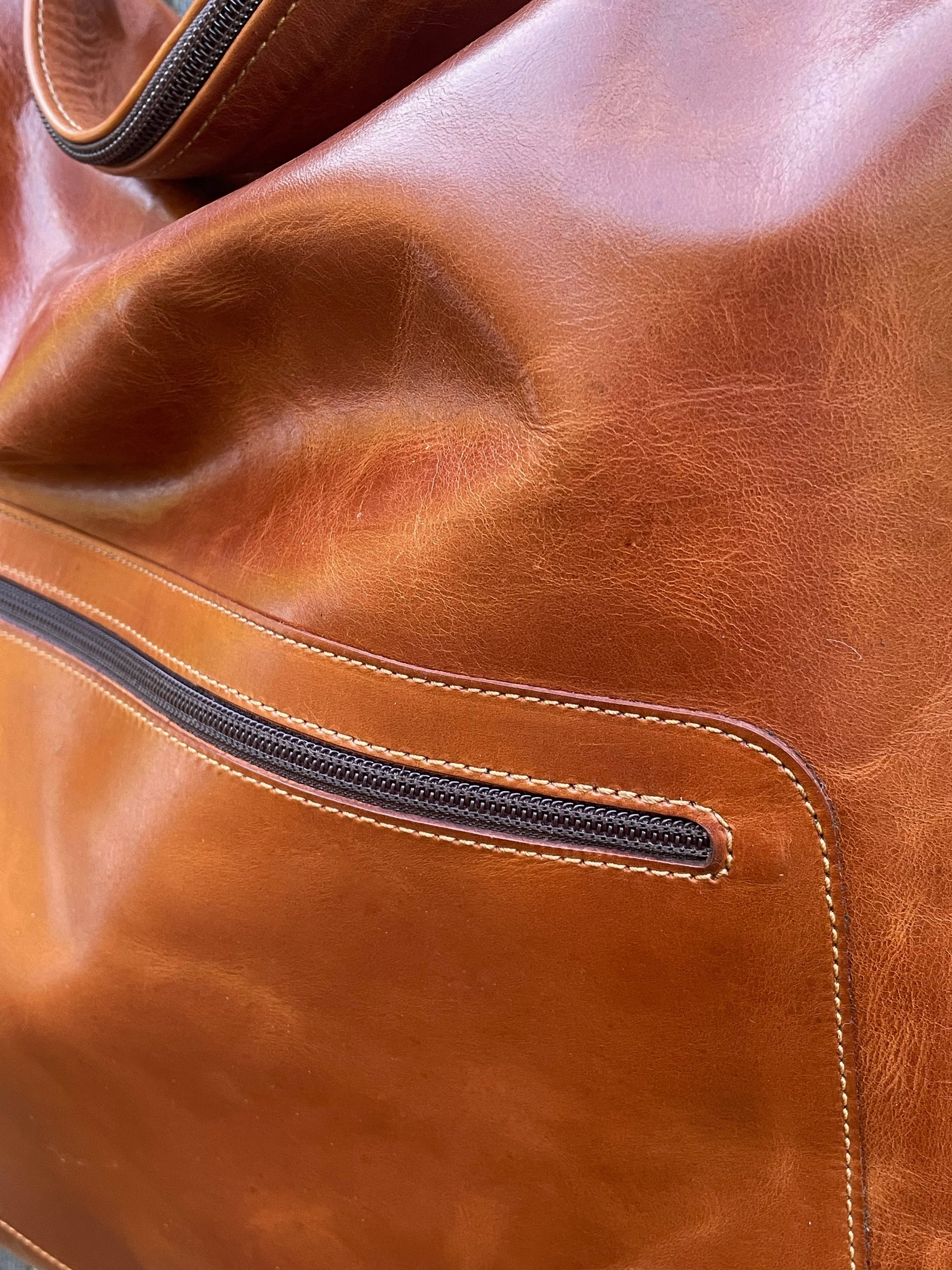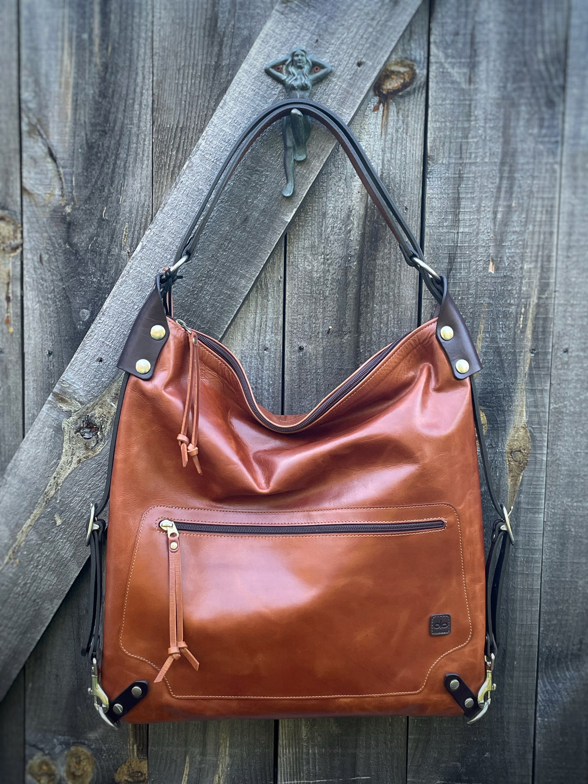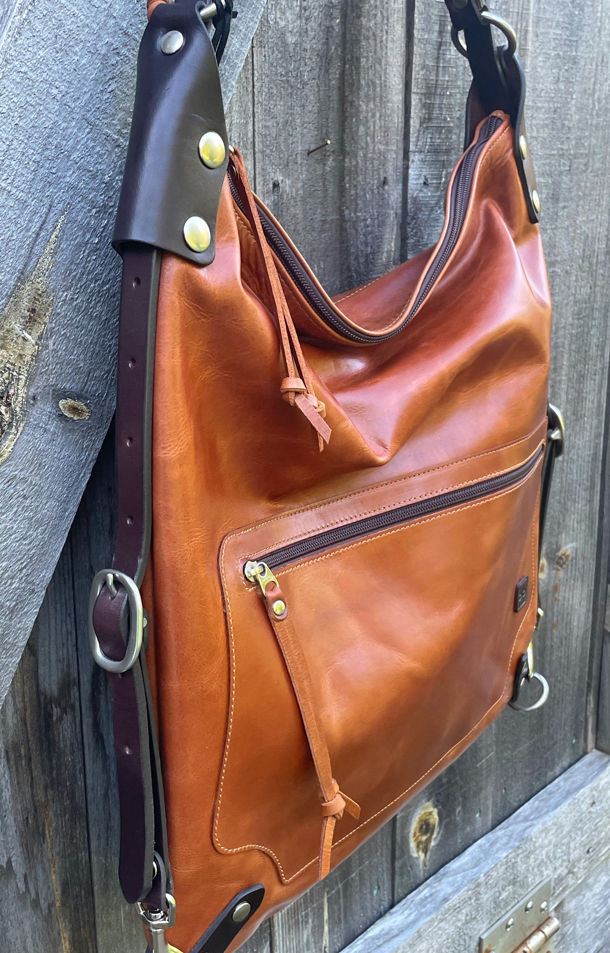 The Villa is a chic backpack and shoulder bag designed all-in-one. It carries a laptop and all your daily necessities with plenty of room to spare. There is one large zipper pocket for quick access on the front of the bag and a large zipper pocket with patch pockets on the upper inside back panel. Securely attached to one of the strap-rings is a long discreet key lanyard that is easily stowed and accessed. The vintage Villa is made of buffalo full grain leather and strapped up with English bridle leather. This leather has a slight pull up look and will soften and mellow with use. The hardware is solid, cast equestrian stainless steel. All the edges are carefully hand finished making this a timeless and functional piece that will serve and age gracefully for many years to come.