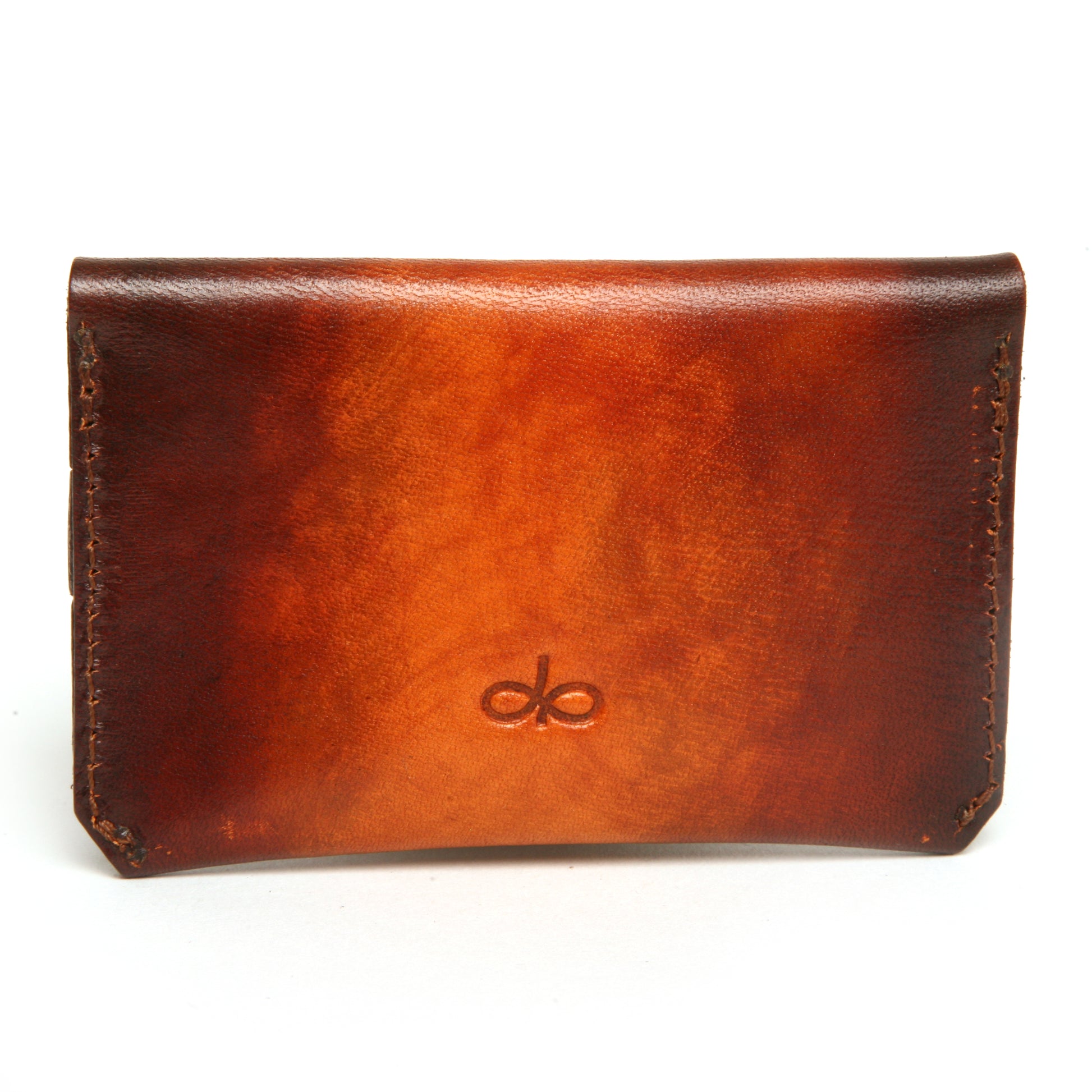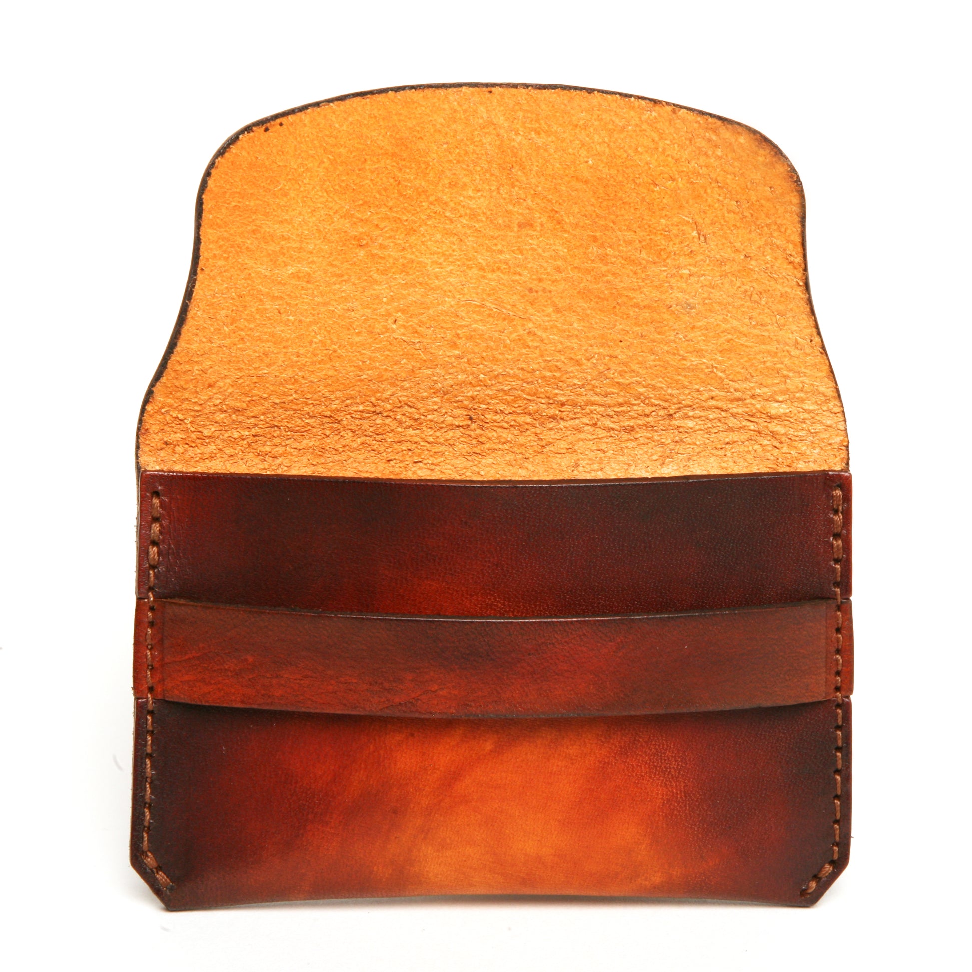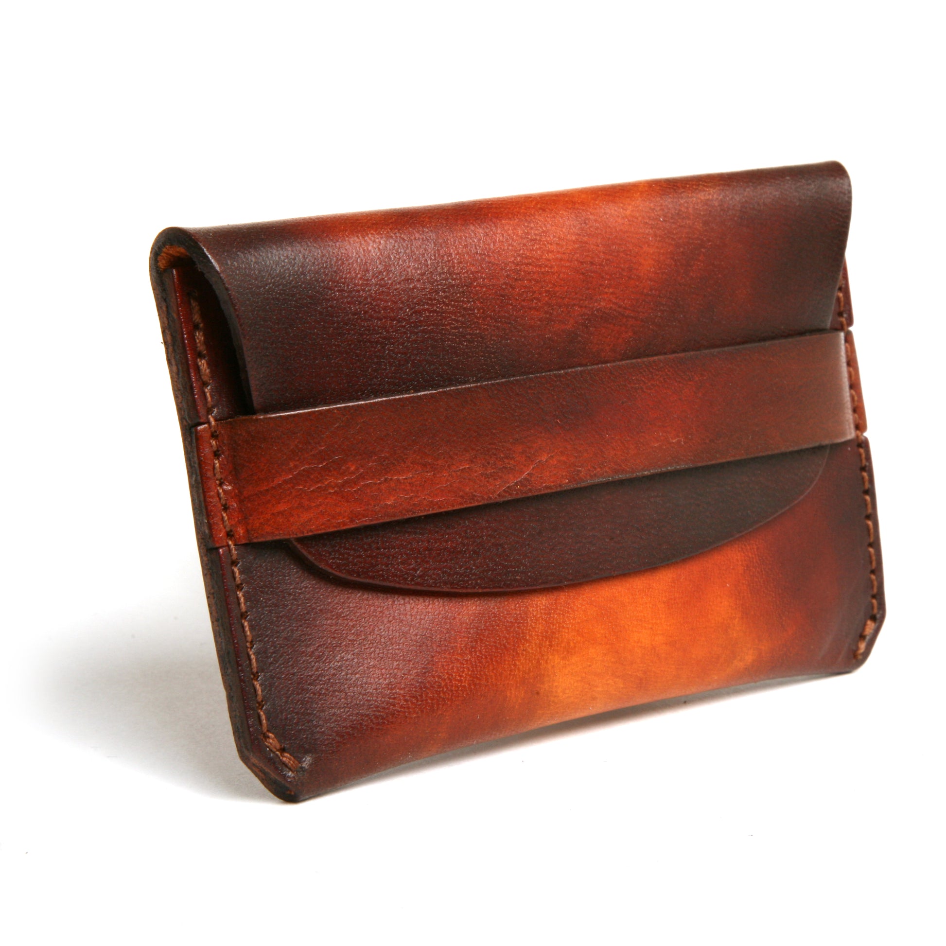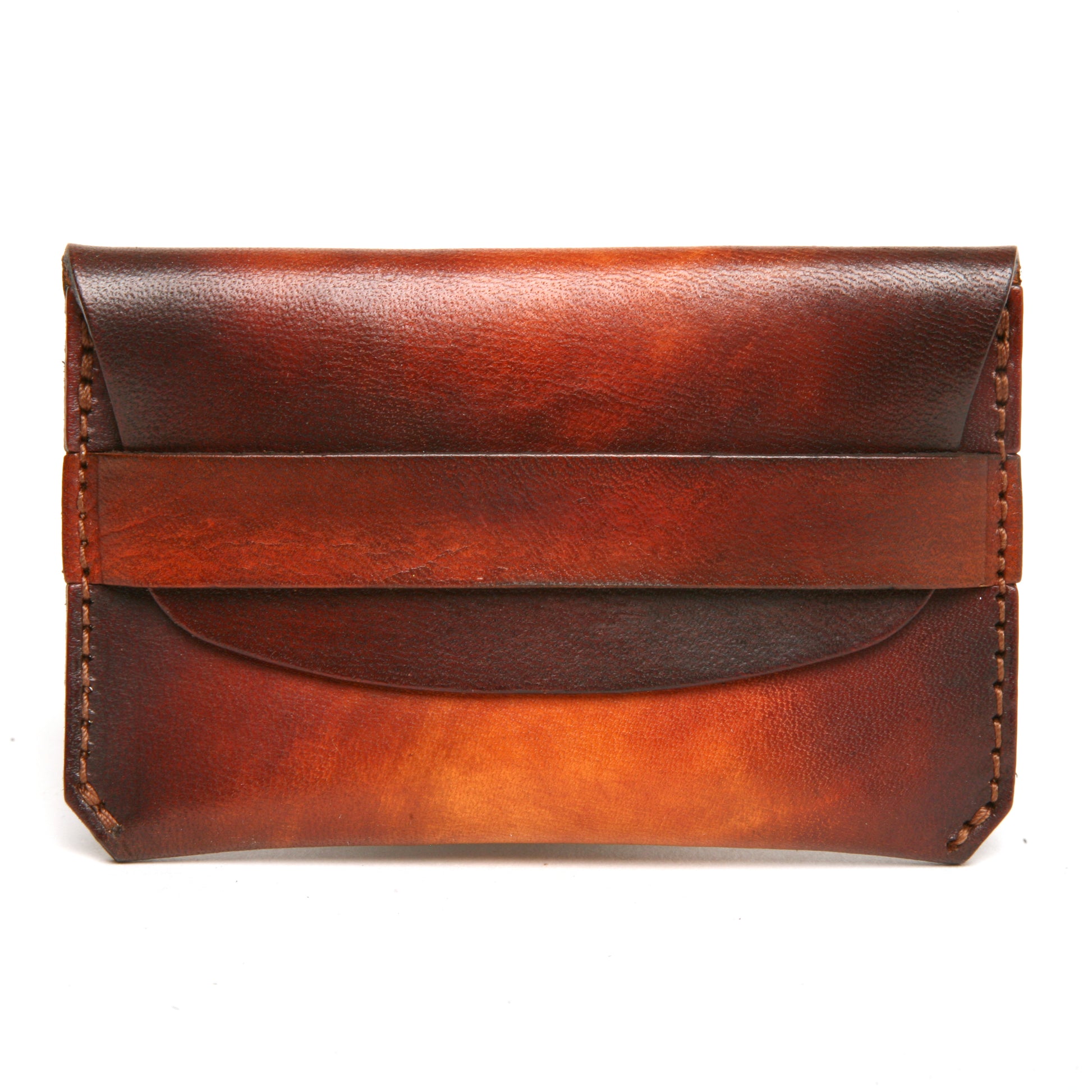 This flap is the perfect front pocket wallet with Its slim design and simple flap closure. 70's sunburst dye job adds character to the classic English bridle leather and finished burnished edges ensure this wallet will age beautifully as its patina grows with time.