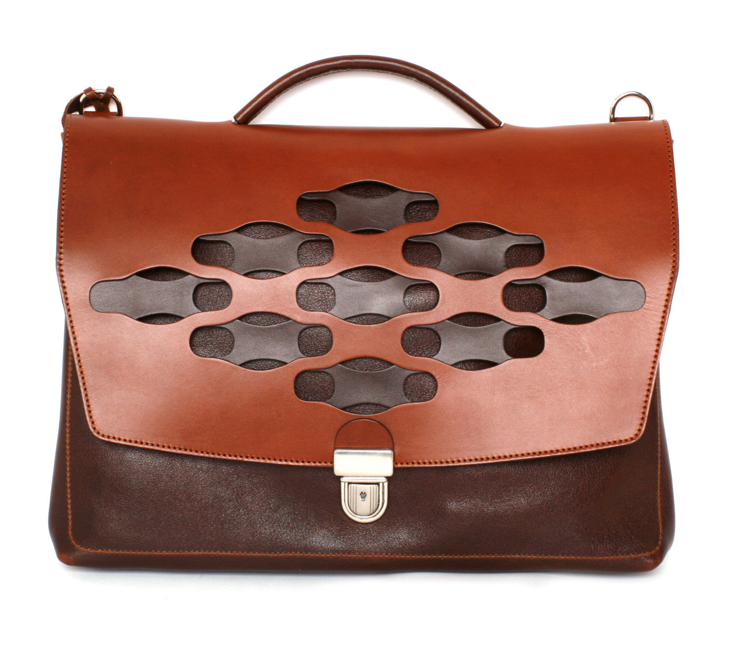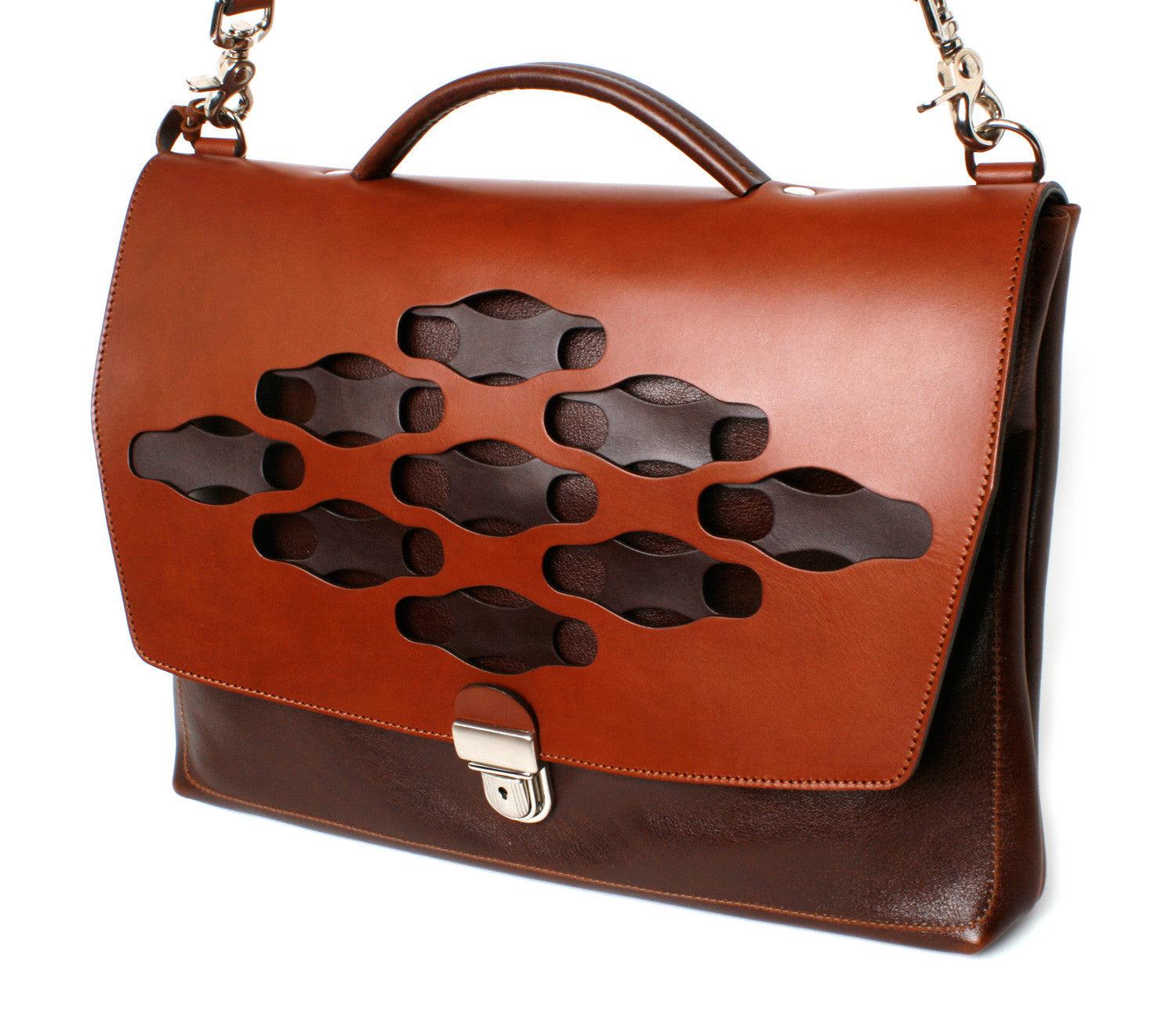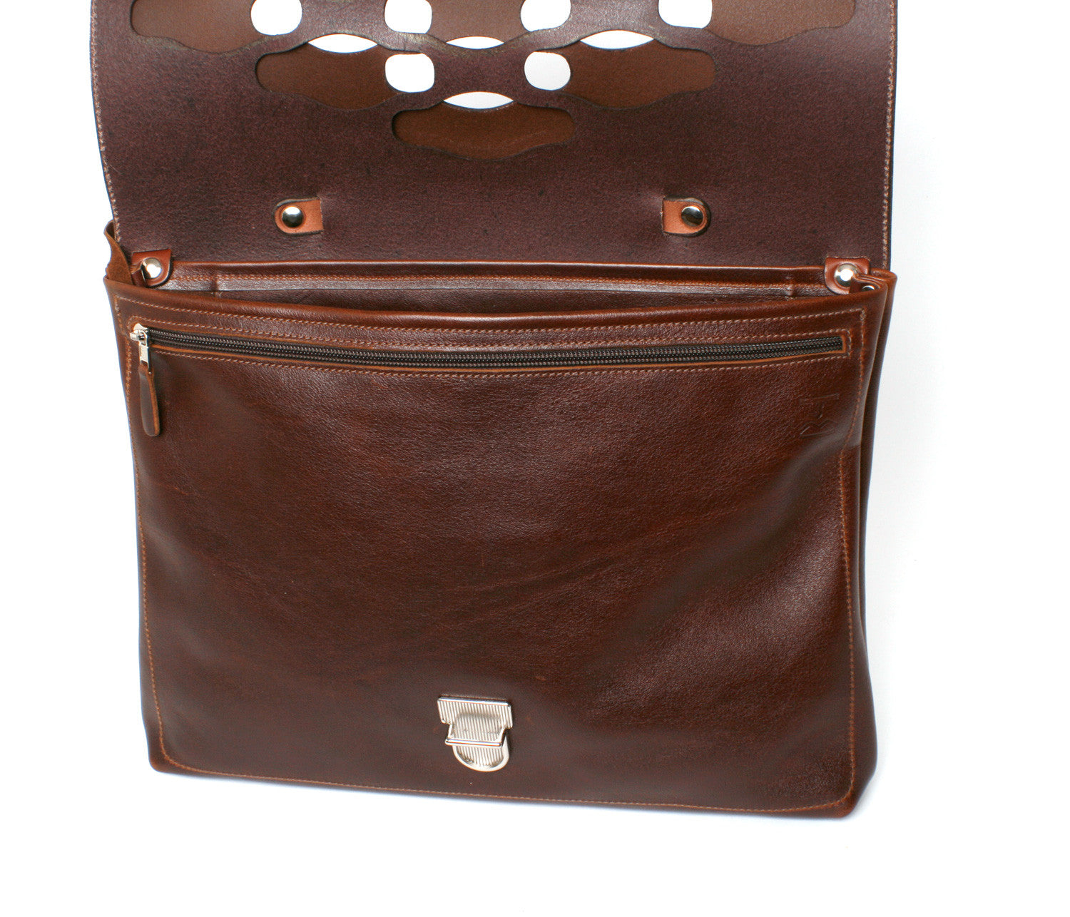 The H Satchel is a slim messenger that securely closes with a solid cast tuck latch. It is stitched up with heavy polyester thread and riveted at all stress points for years of rugged reliable use. It features an external zippered pocket and a patch pocket on the interior for a phone. There is an additional zippered pocket on the interior rear of the bag.The leather is dark brown pull up with medium brown details. the detail leather and strap is Wicket&Craig of USA bridle leather. The shoulder strap is detachable for an attaché' look.