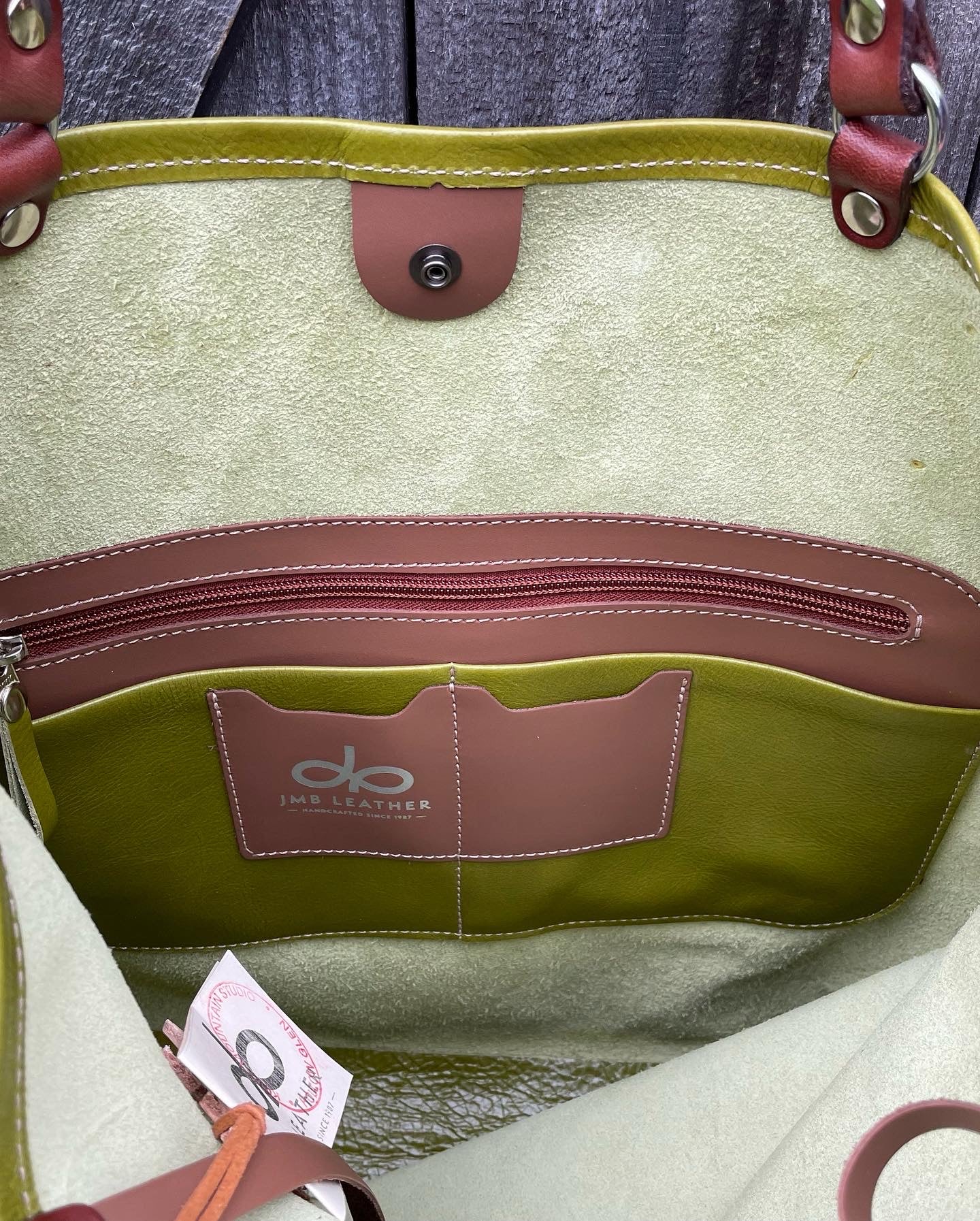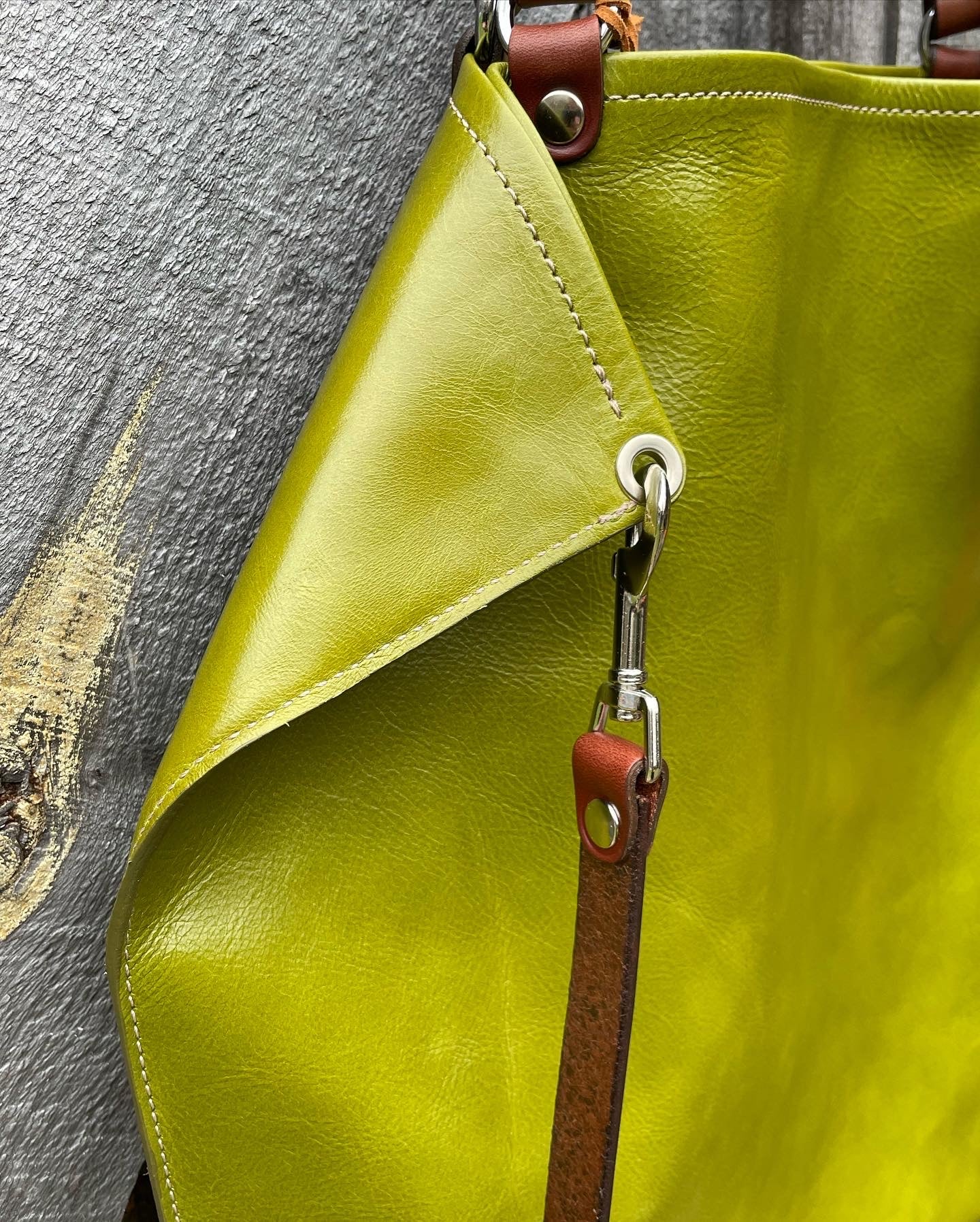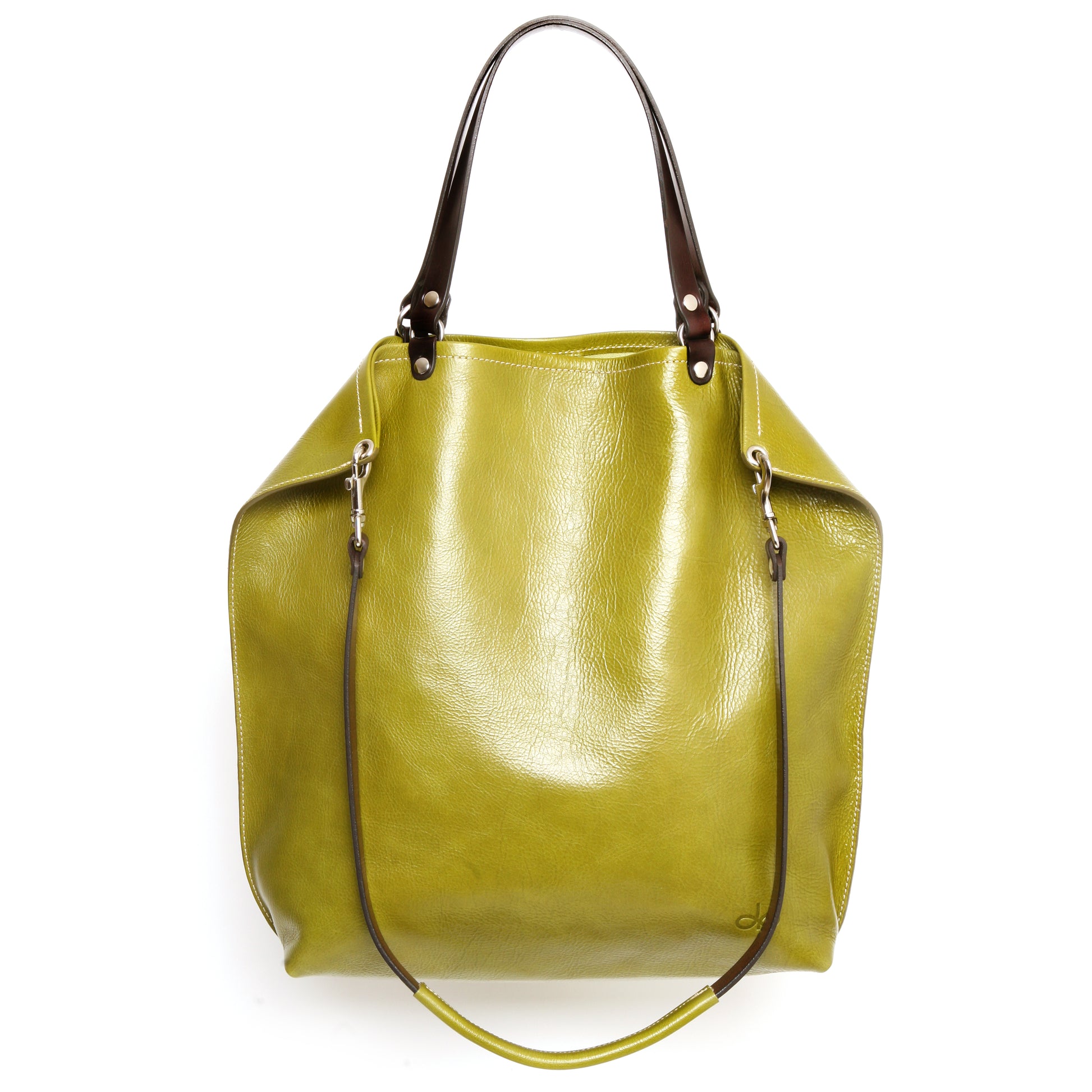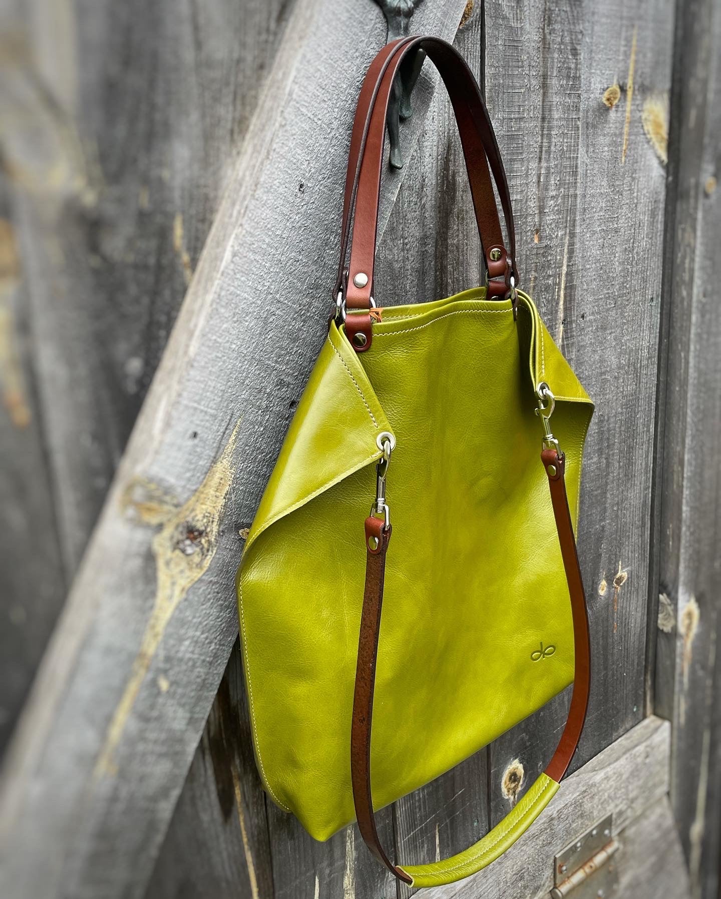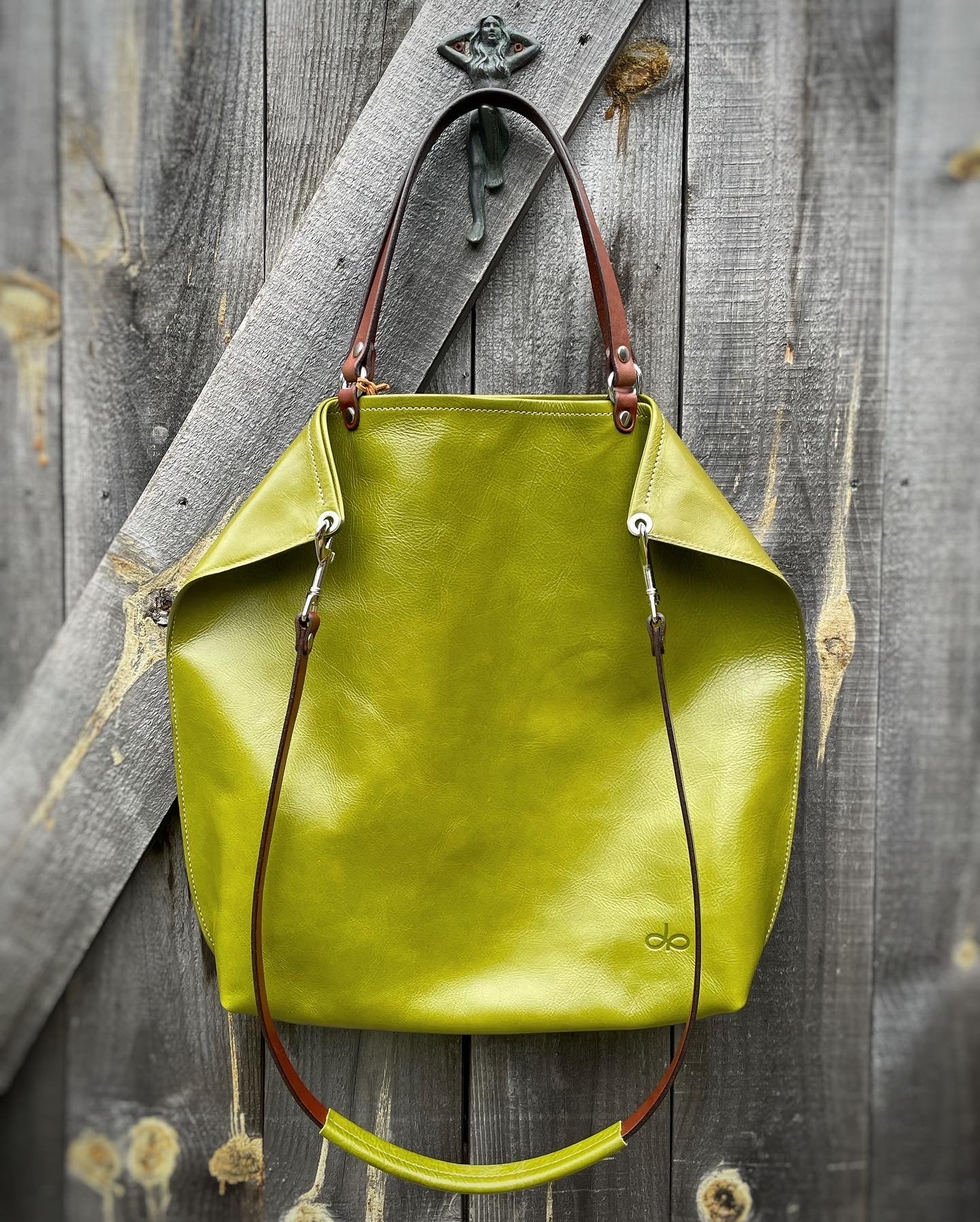 The KIKI is a chic modern tote. It's slim profile make it great for everyday use. There is one large zipper pocket on the interior and a smaller pocket with a cell phone sleeve inside. The cross body strap hangs across the body giving a folded corner look