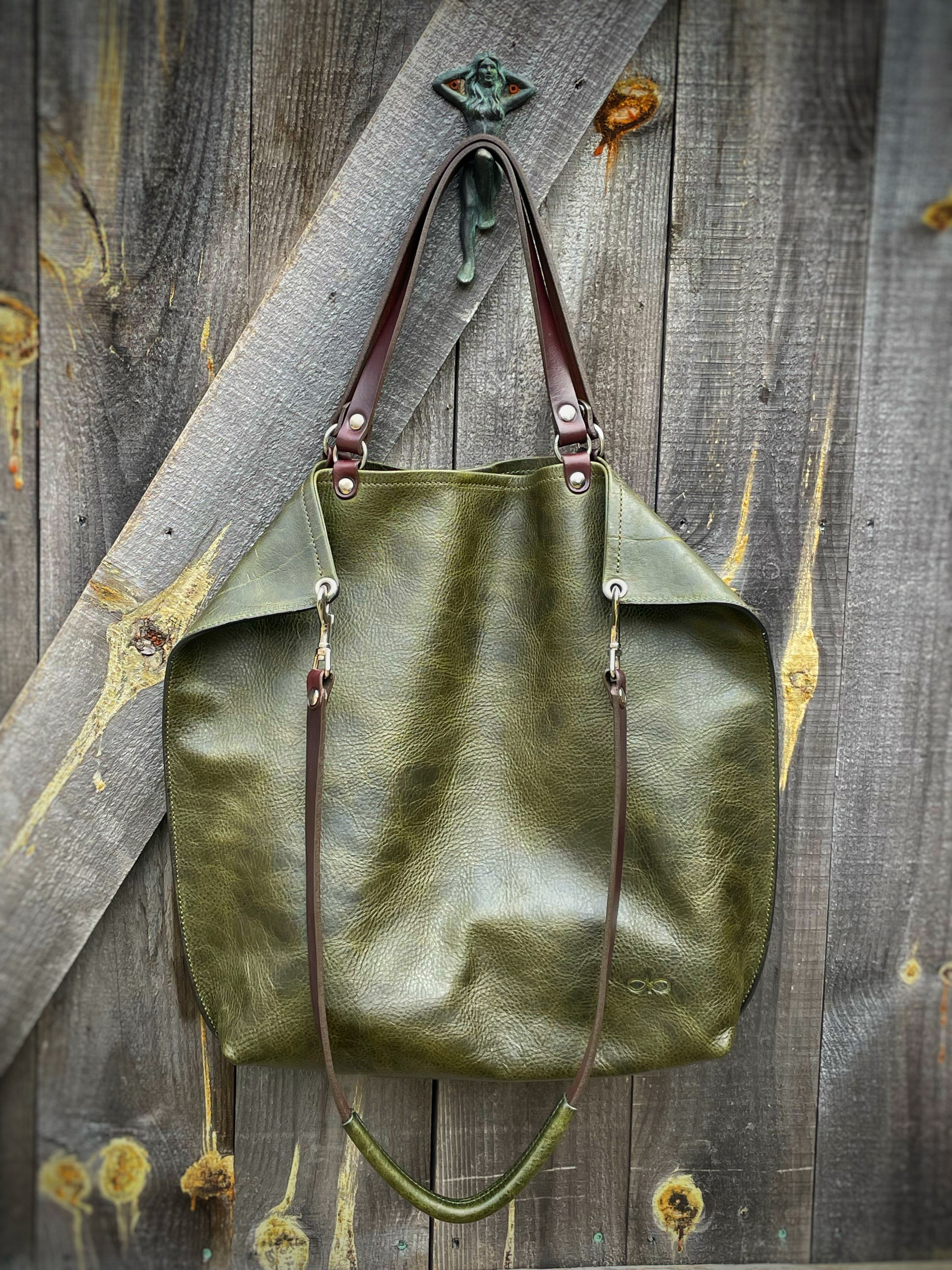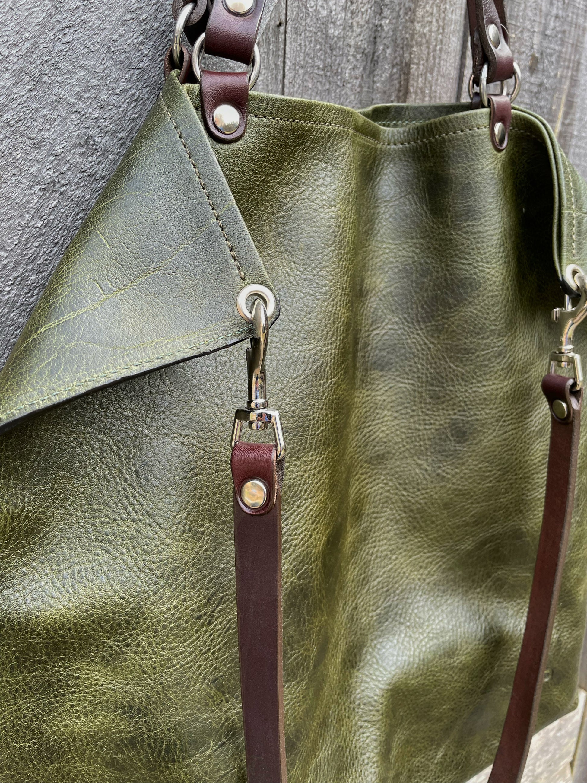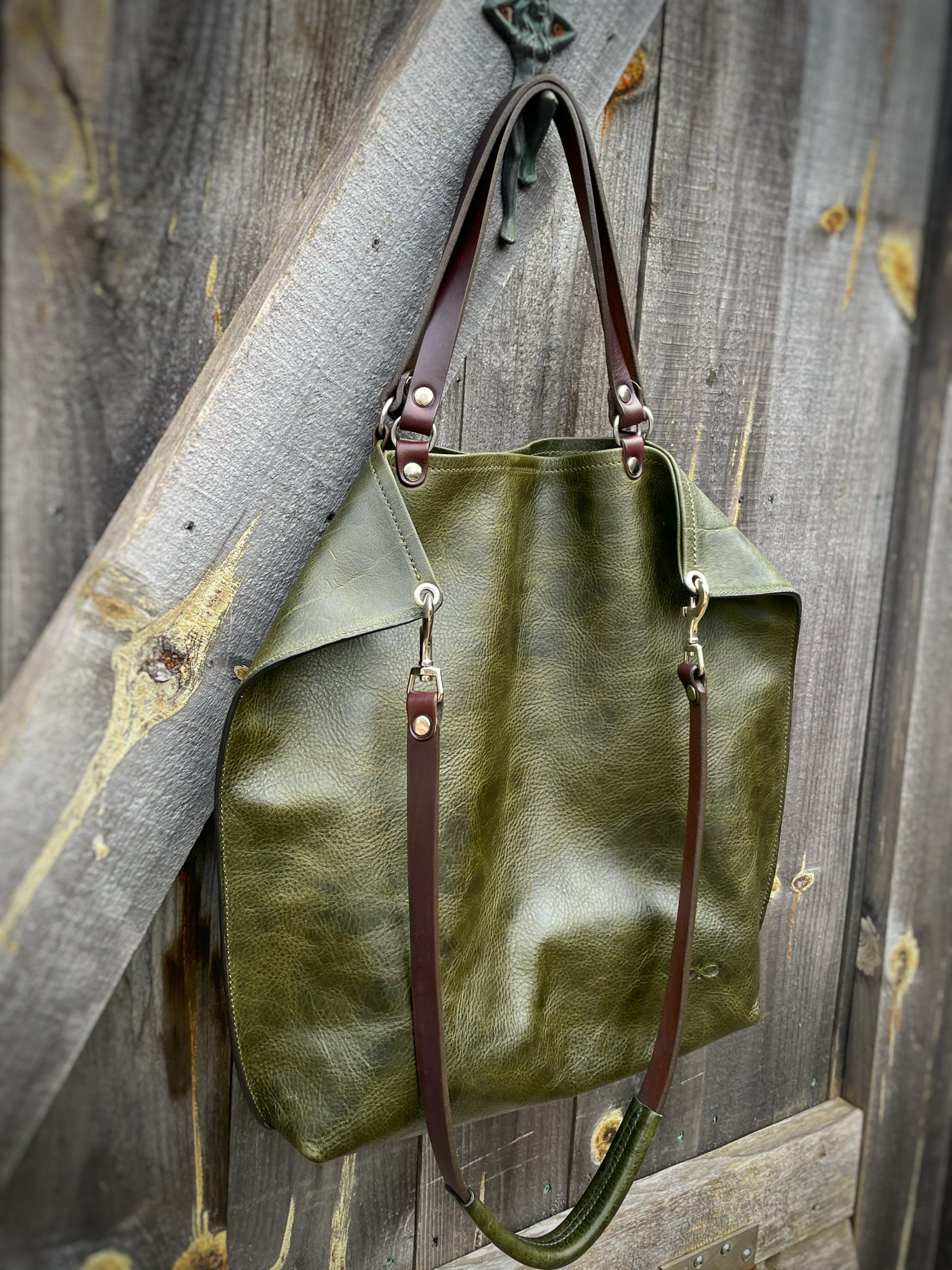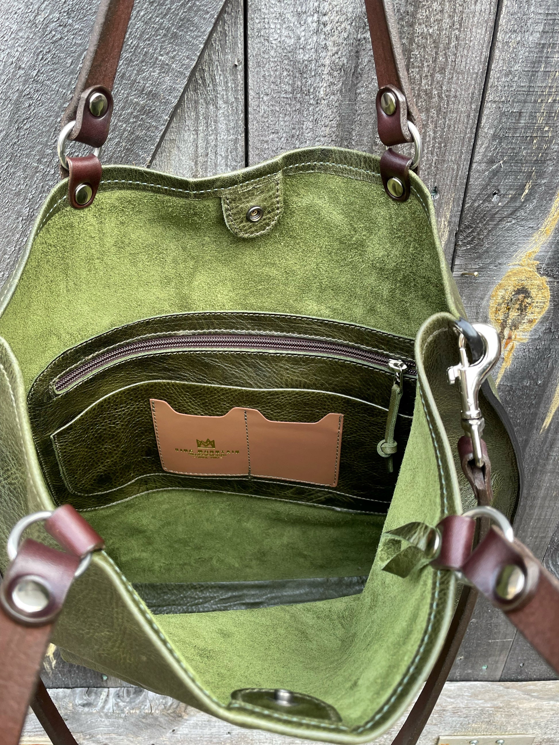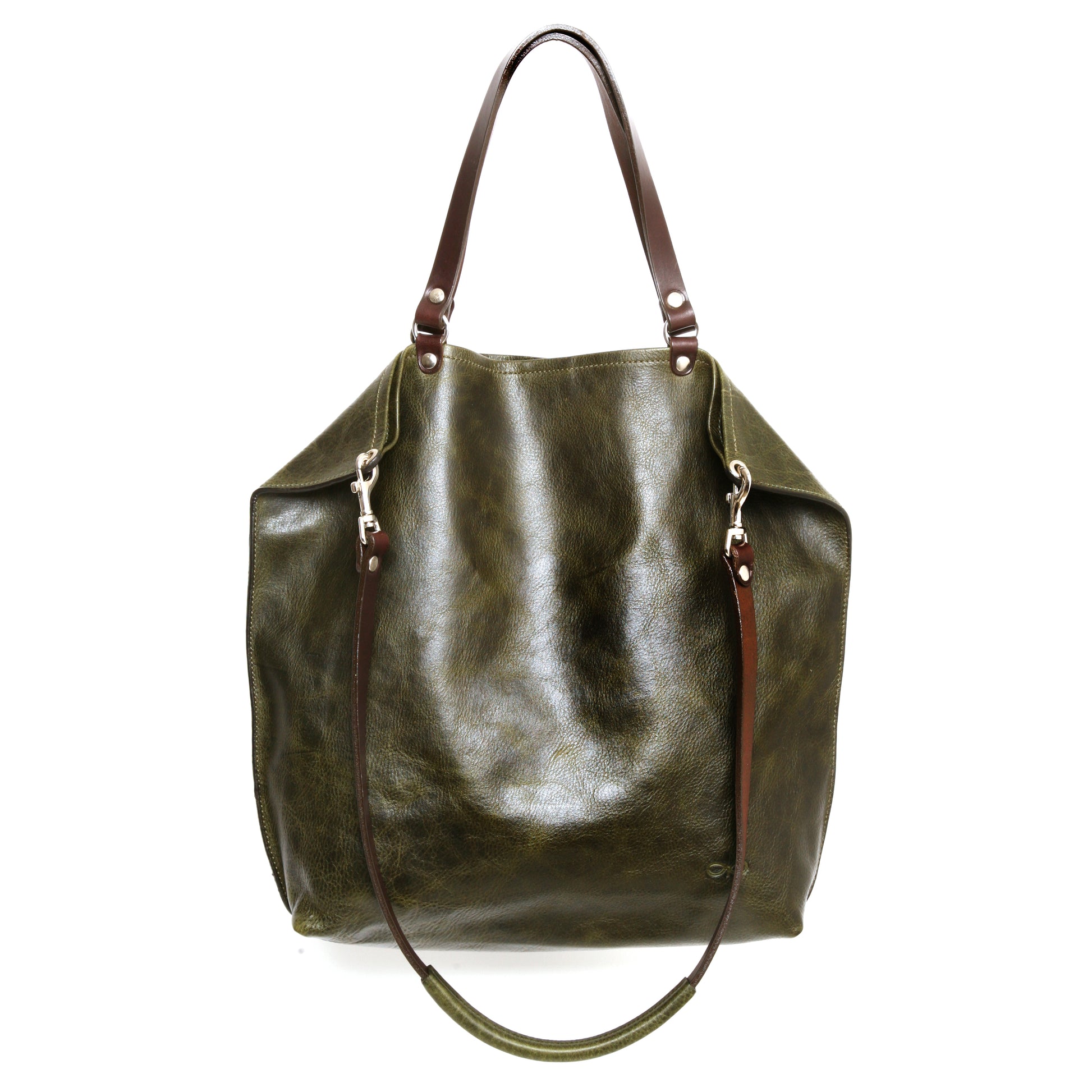 The KIKI is a chic modern tote. It's slim profile make it great for everyday use.There is one large zipper pocket on the interior and a smaller pocket with a cell phone sleeve inside.The cross body strap hangs across the body giving a folded corner look