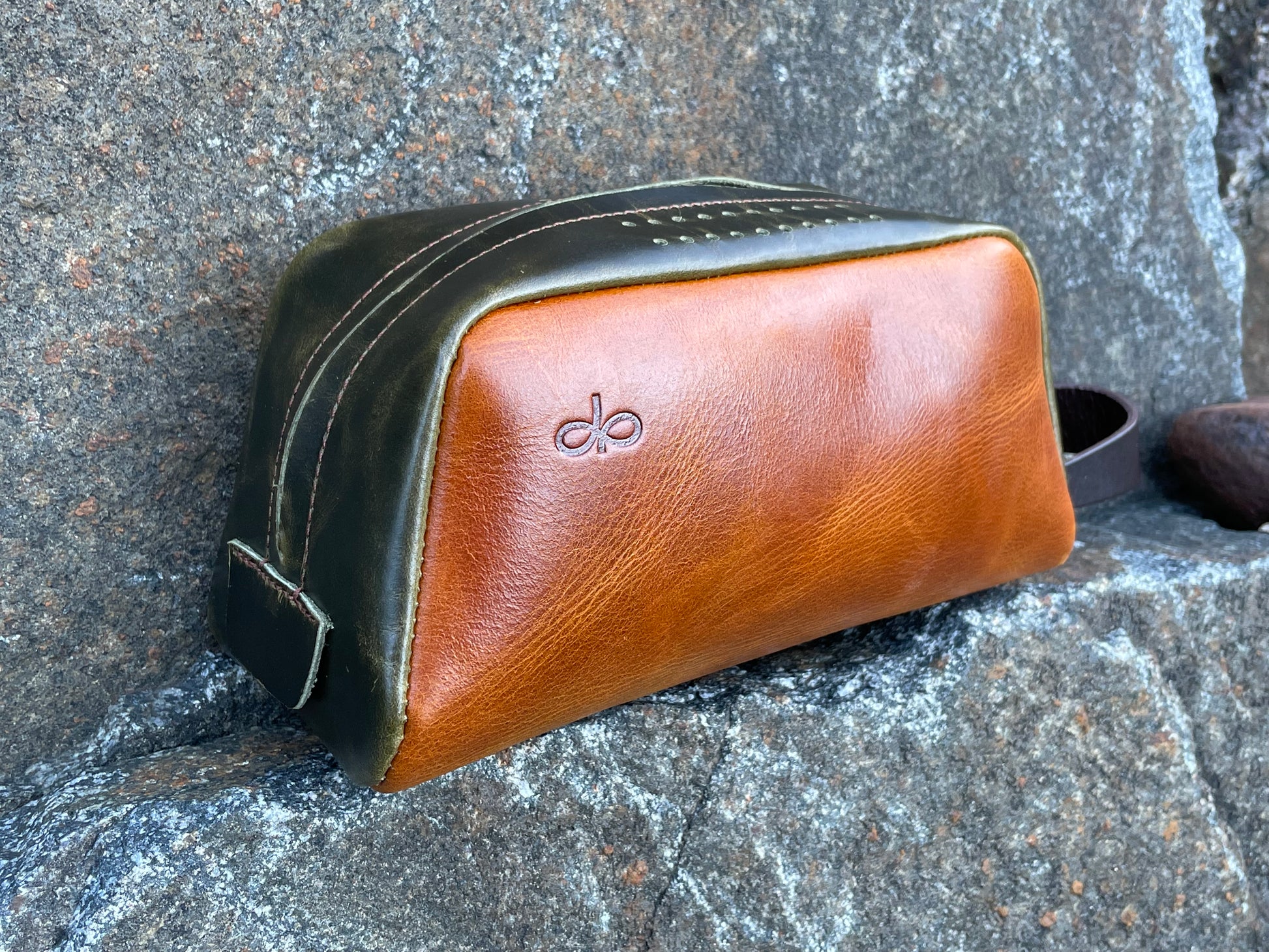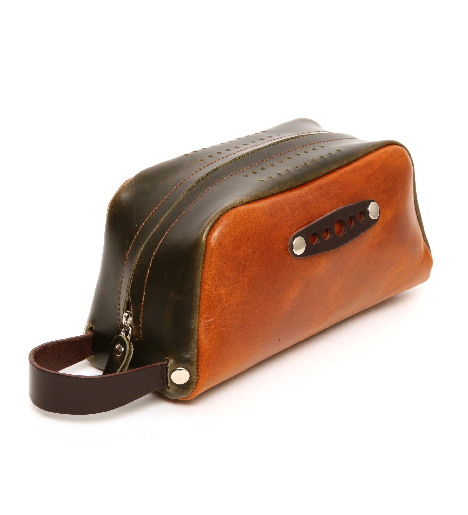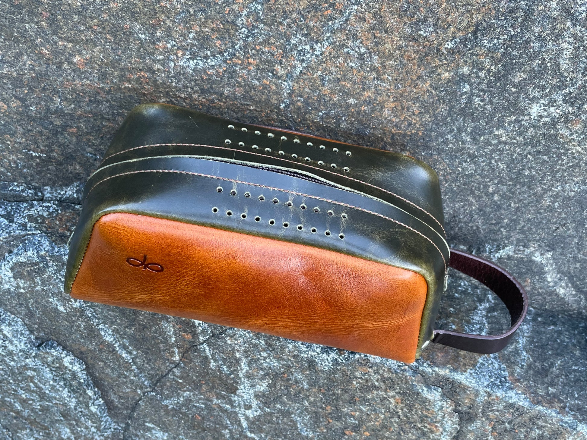 The KONA travel and toiletry bag is lightweight and loaded with style and features. It's fully constructed of leather and lined with a synthetic washable liner. The generous handle makes it easy to carry and hang up. The YKK coil zipper is very durable and non abrasive and is further protected by leather concealing it when closed. The tab on the front is designed to give you a spot to tuck in your razor and tooth brush. The Kona has a series of ventilation holes on the top adding to its timeless style.