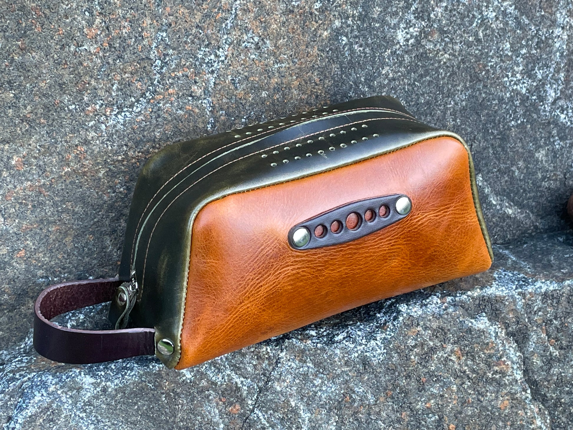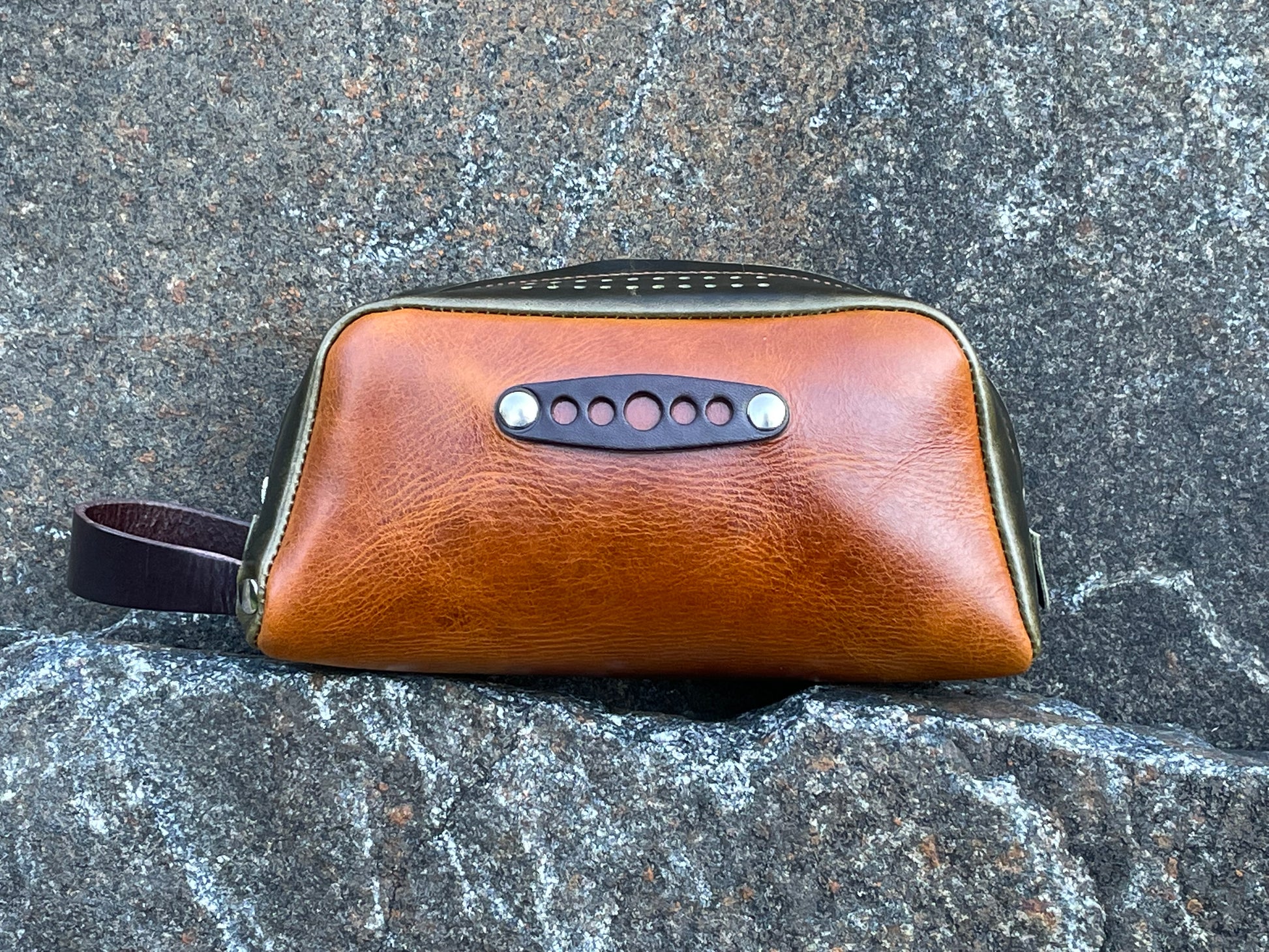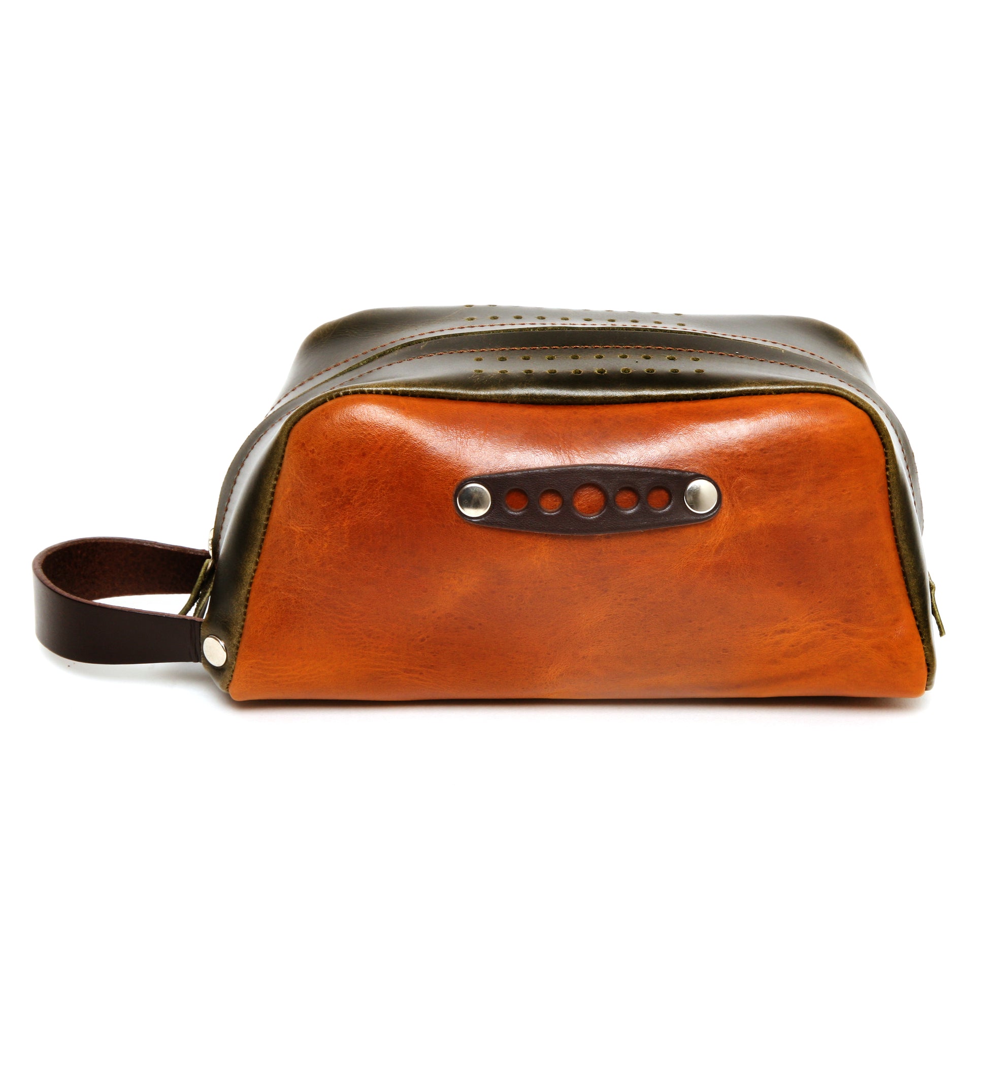 The KONA travel and toiletry bag is lightweight and loaded with style and features. It's fully constructed of leather and lined with a synthetic washable liner. The generous handle makes it easy to carry and hang up. The YKK coil zipper is very durable and non abrasive and is further protected by leather concealing it when closed. The tab on the front is designed to give you a spot to tuck in your razor and tooth brush. The Kona has a series of ventilation holes on the top adding to its timeless style.