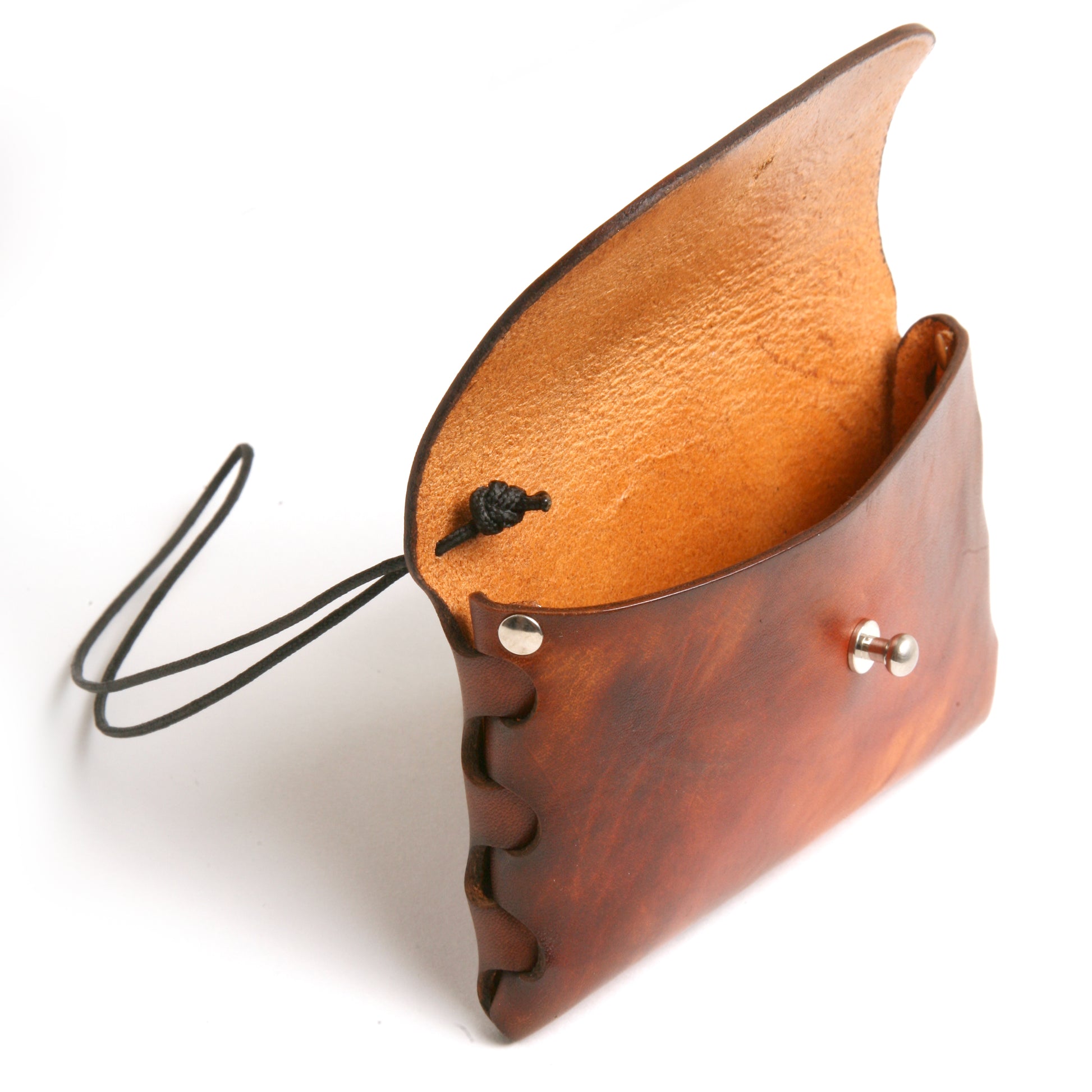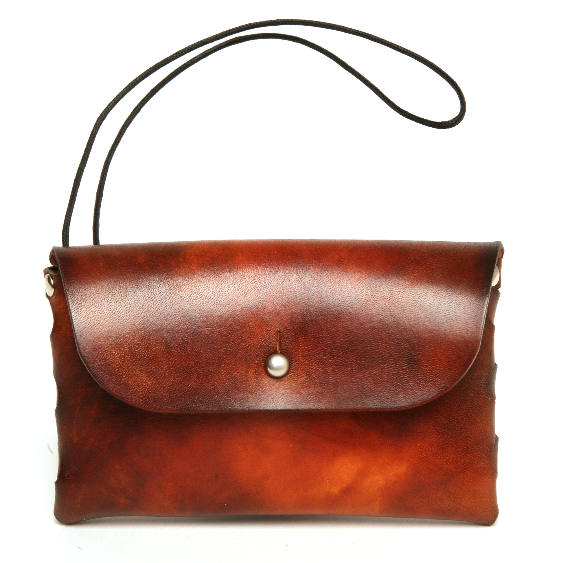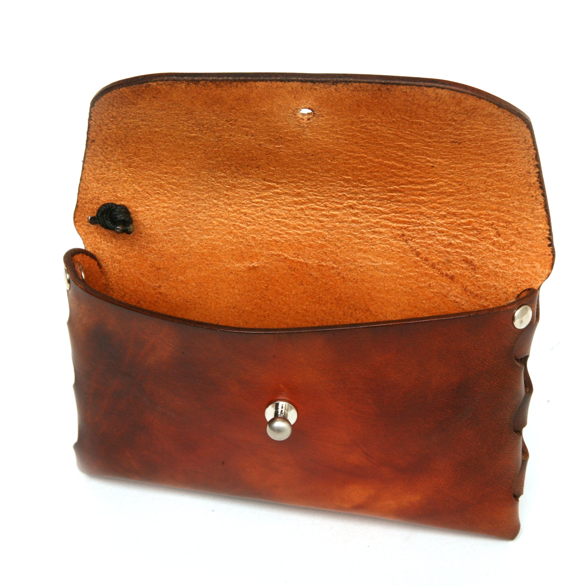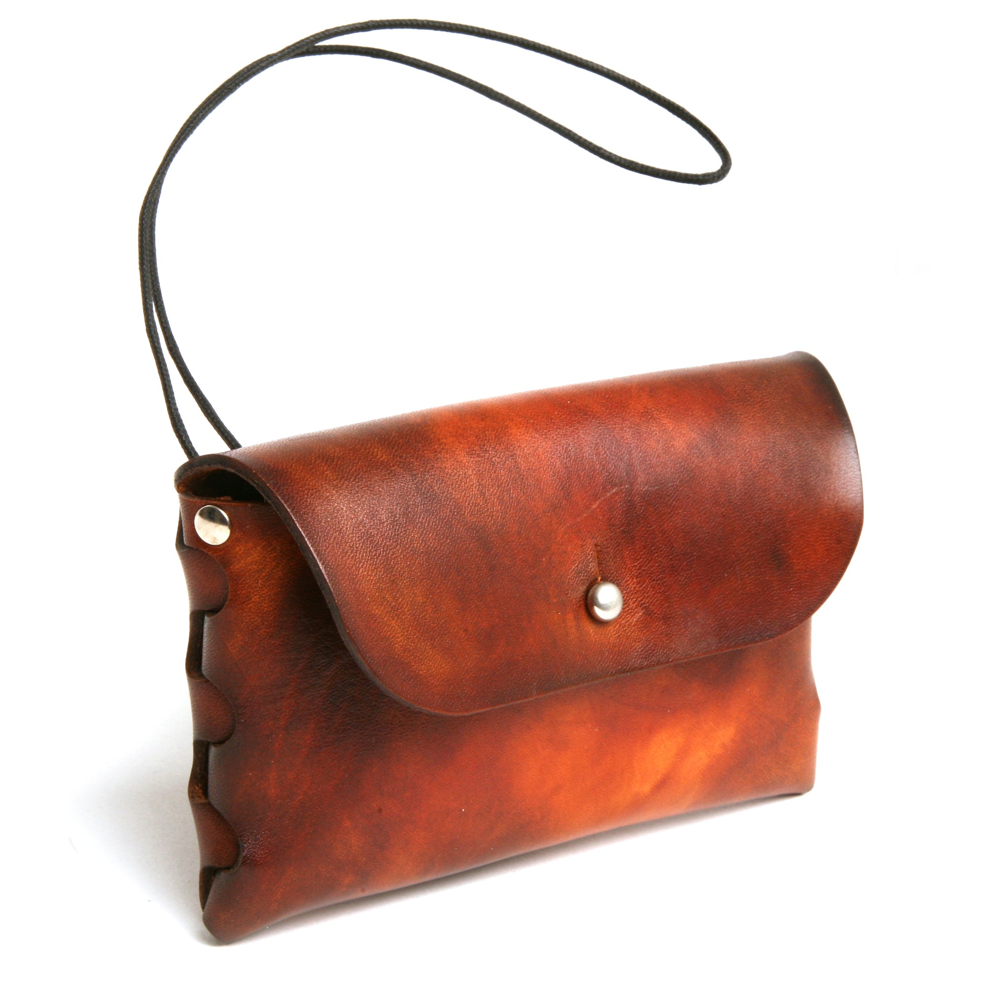 This LINKED pouch is the perfect travel companion. It's slim design, woven gusset, and 70's sunburst dye job adds character to the classic English bridle leather. Finished with burnished edges and a metal button closure, this pouch also includes a lanyard for easy carrying of nick knacks.