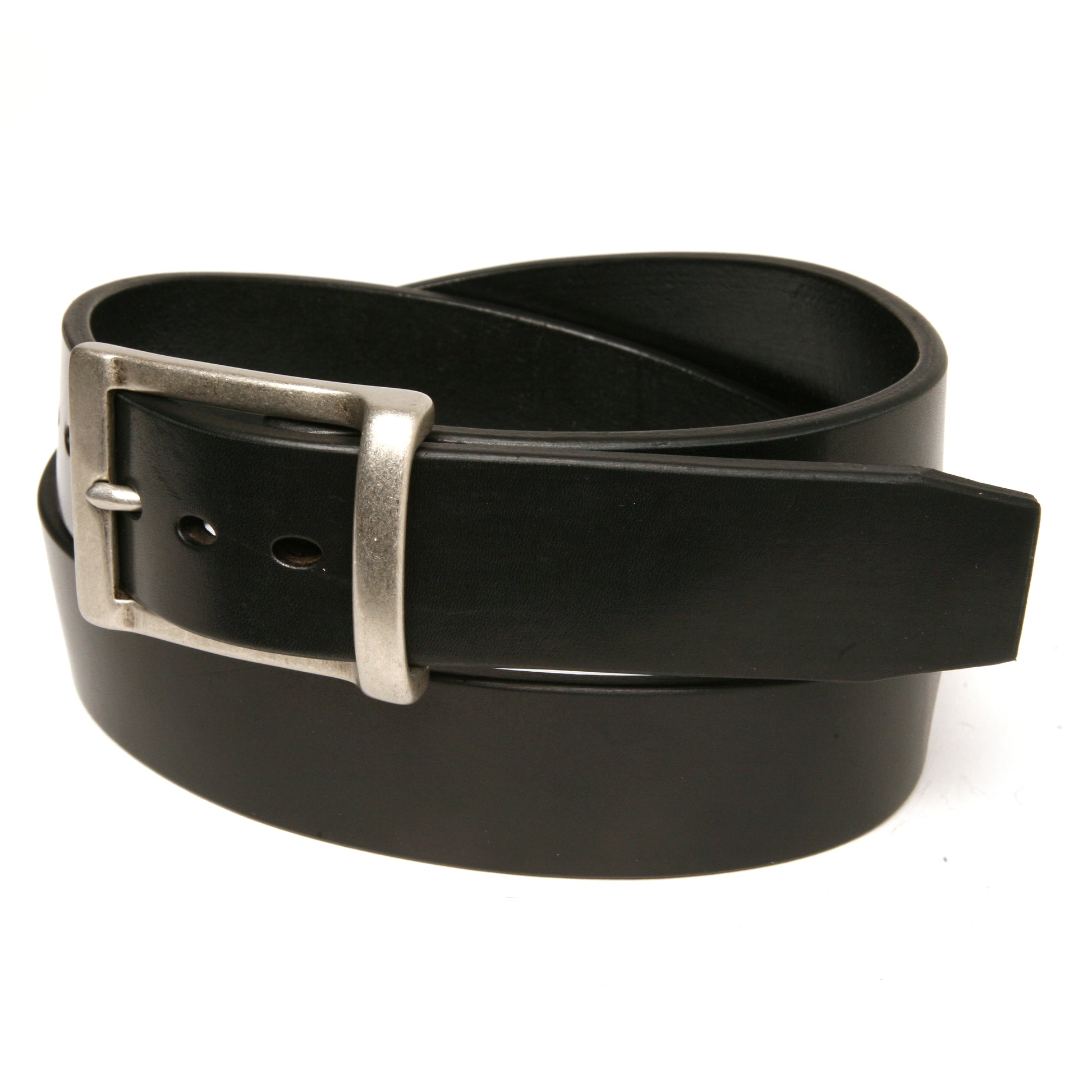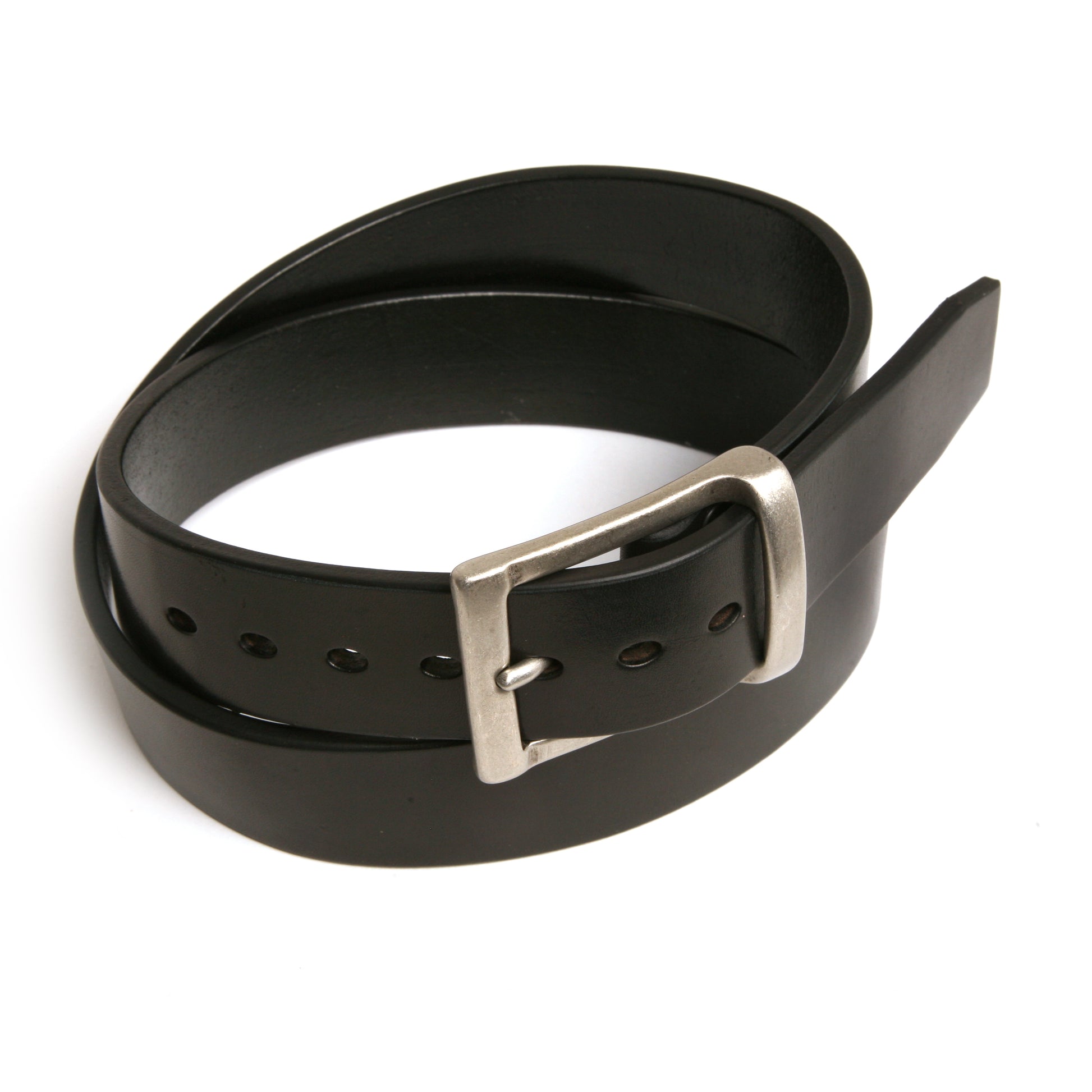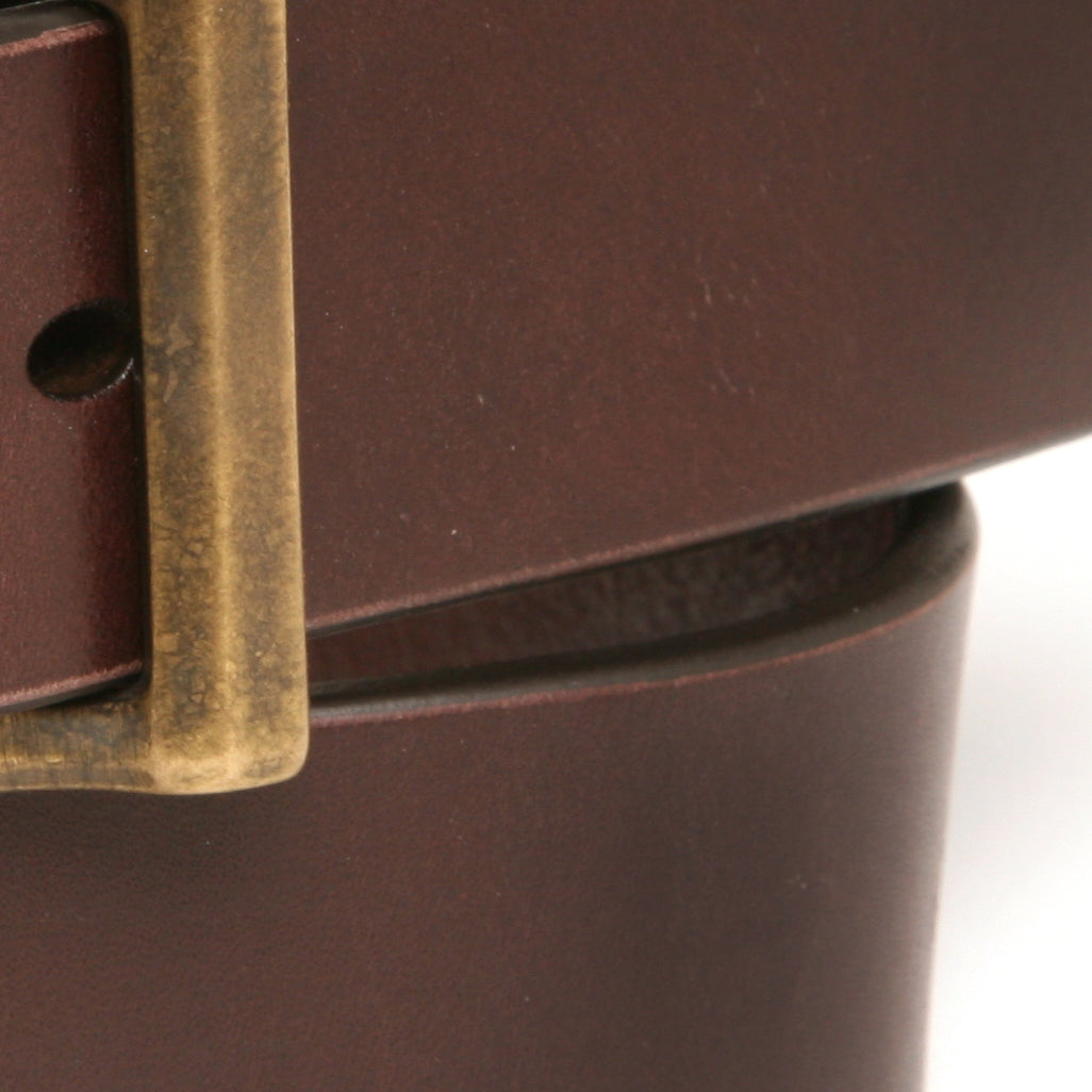 The REKKER belt is crafted from 13OZ English bridle leather with a cast 40mm solid brass buckle and riveted construction for durability. Its chunky design lies flat and has a timeless look that reflects its quality. It features hand-finished edges, made with a six-step process. A long-lasting accessory that gets better with age. As with all our belts, your size should be the same as your comfortable jean size, allowing for a few holes' adjustment either way. It is available in antiqued silver or antiqued brass.