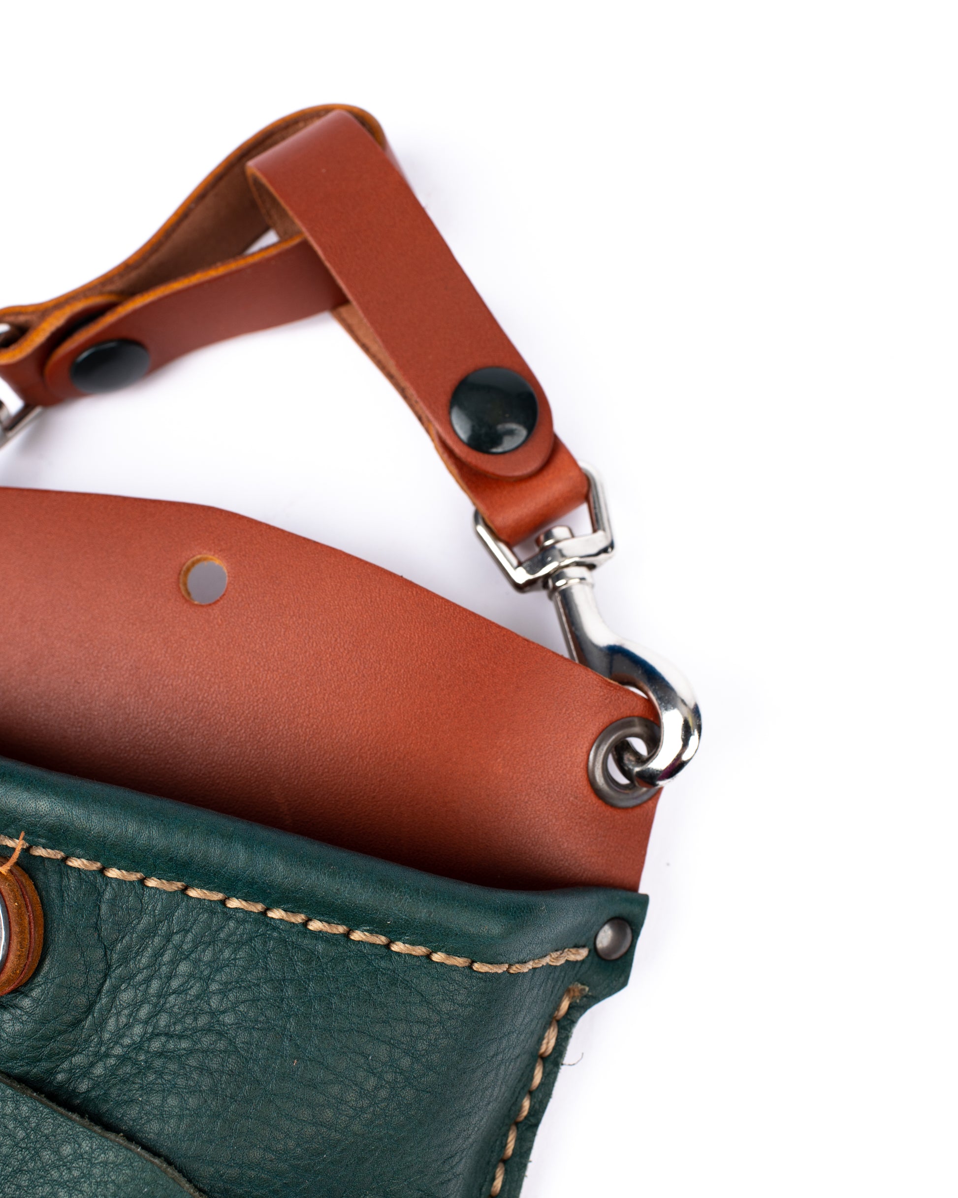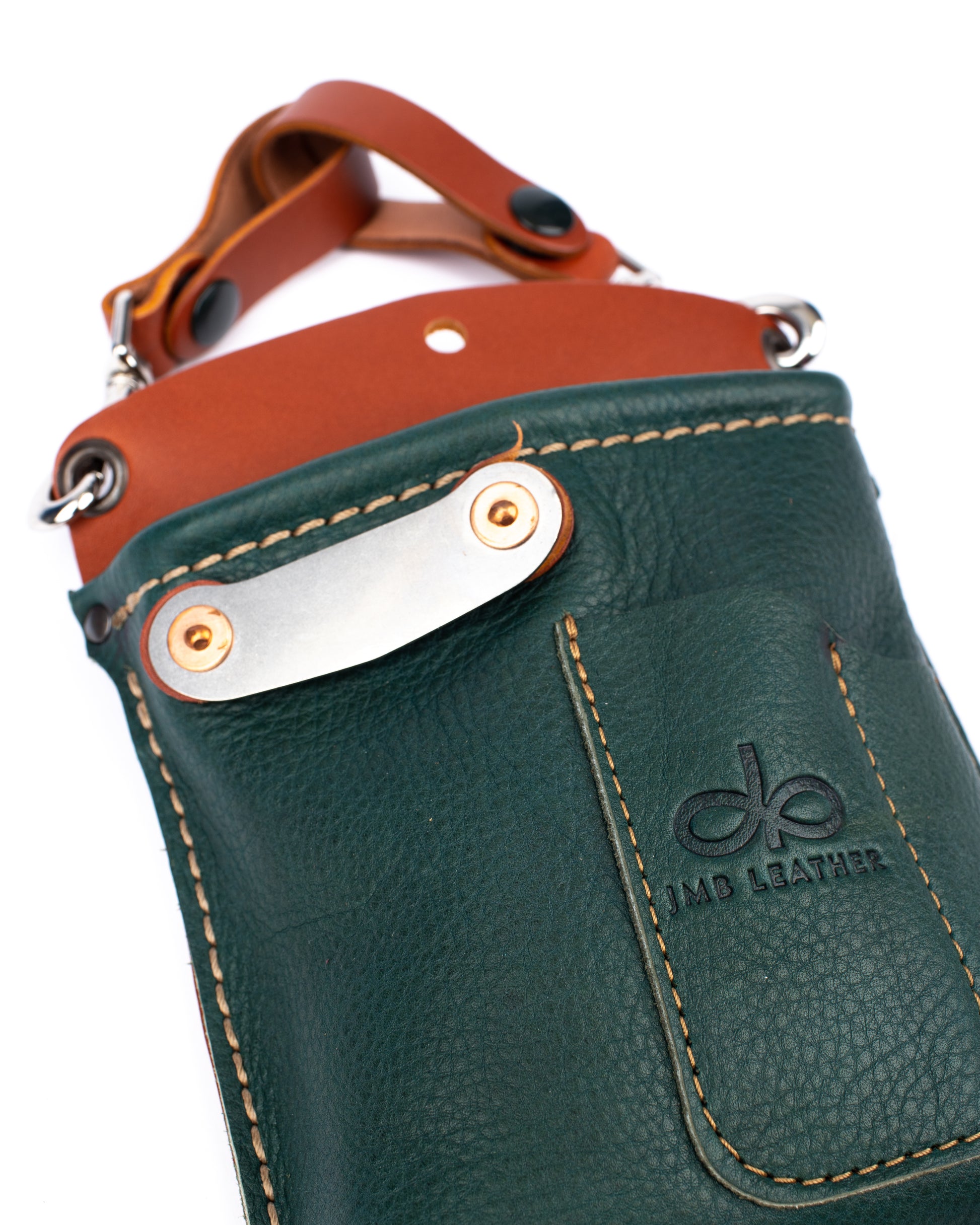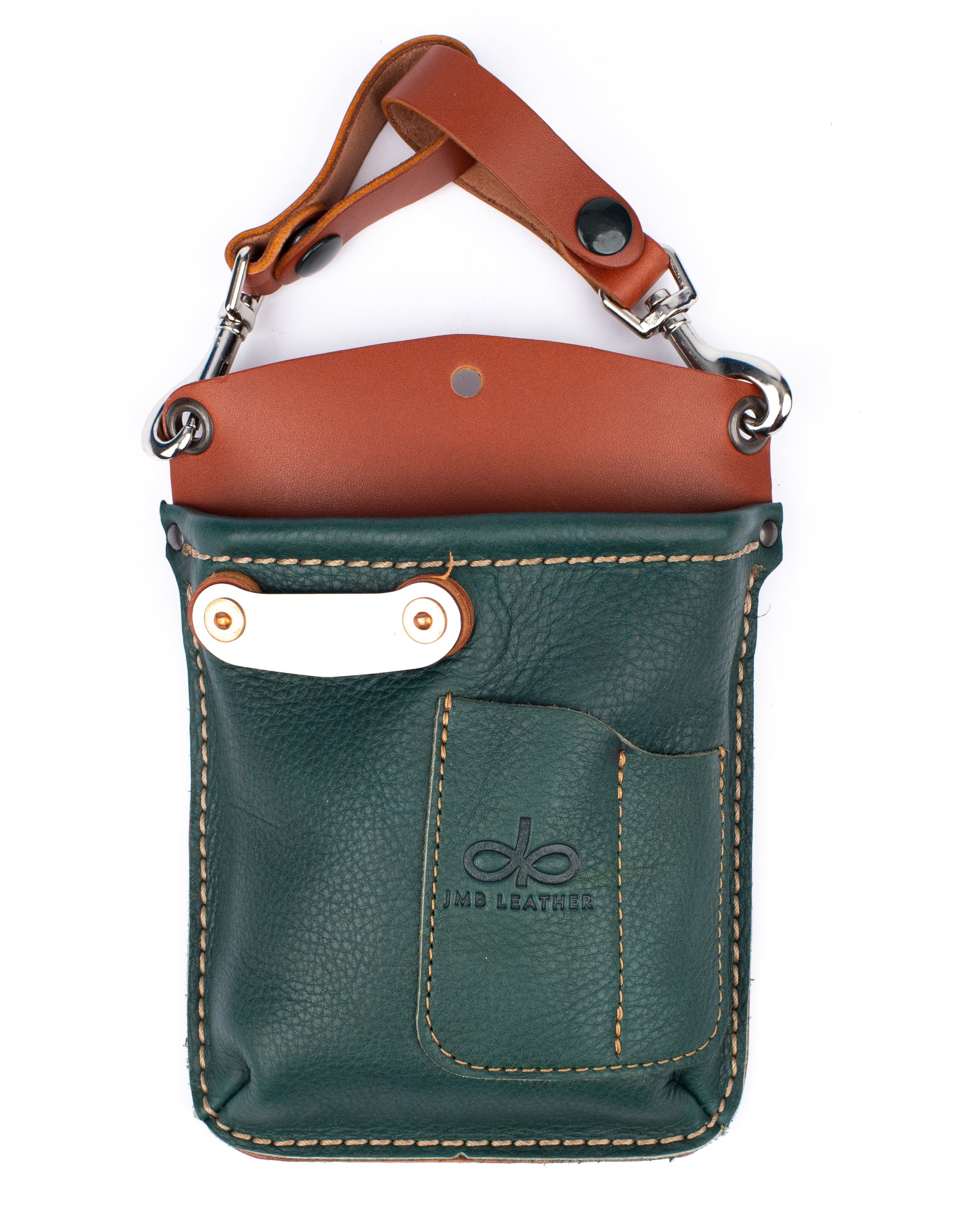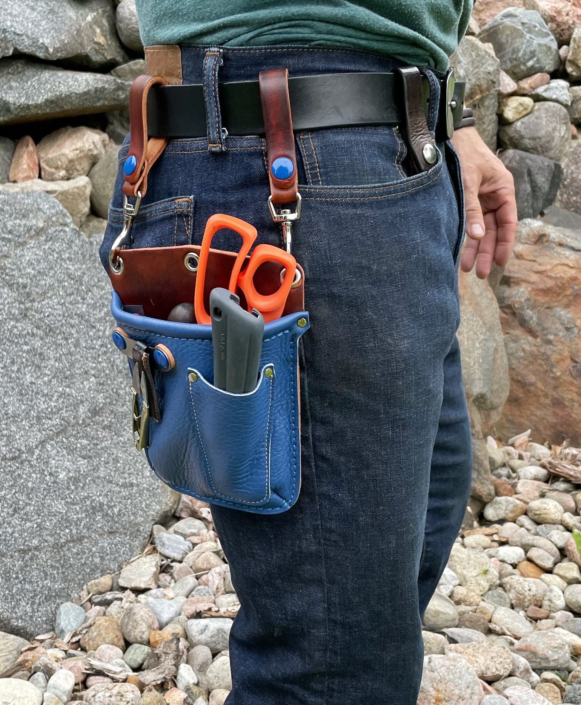 This structured low-profile pouch will hold a few essential tools comfortably out of the way while sitting or standing. It is made with full grain leather, harness hardware and riveted at key stress points making it a lifetime tool pouch.