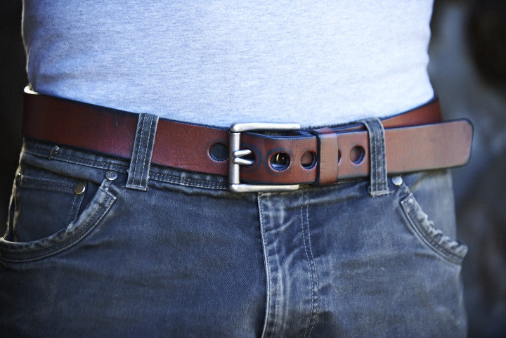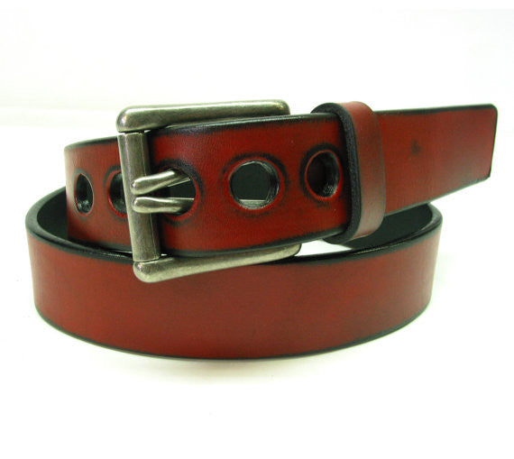 Suma is 1.5" wide and features a five step distress and burnished finish. The leather is thick 11oz vegetable tanned bridle leather that is hot stuffed. The buckle is raw cast stainless steel with two tongues in one large hole. It also is available in black and dark brown. Please mention colour choice if different than the vintage red shown.