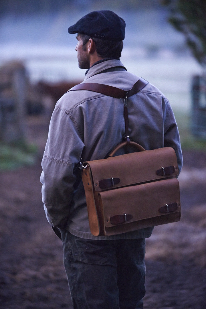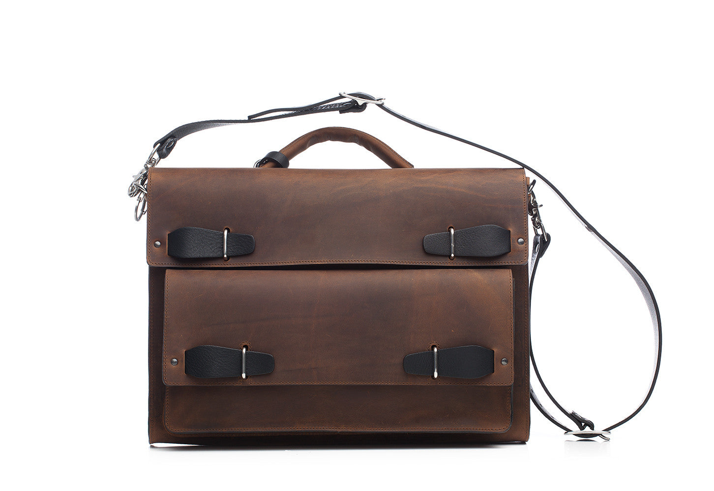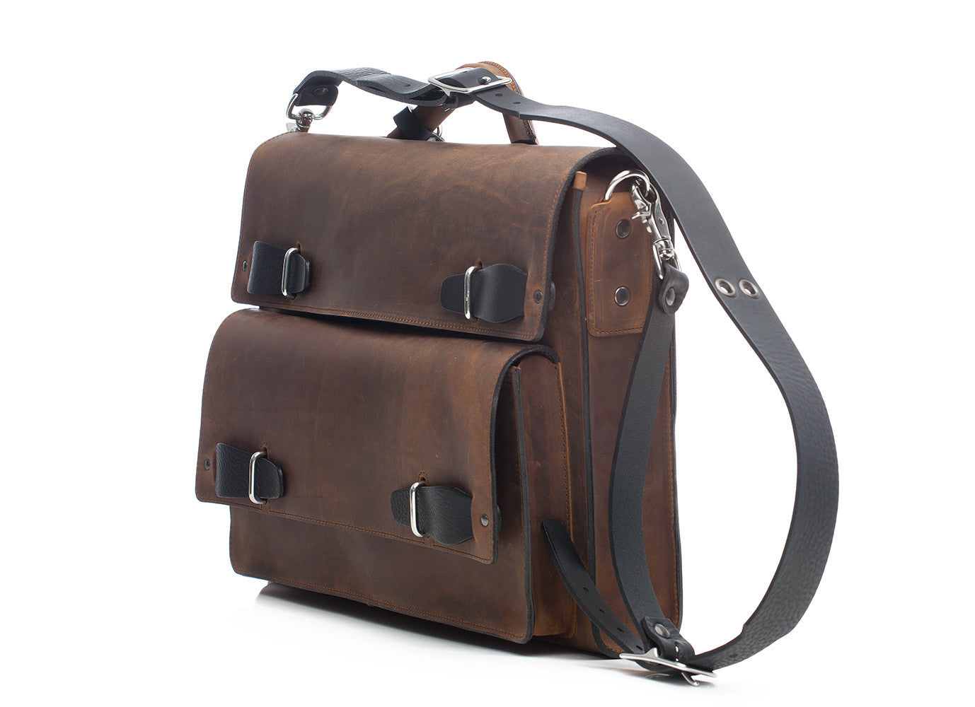 The URBA is an evolution towards a messenger bag and a briefcase that convert to a backpack for unlimited versatility. Slim and sleek with to main compartments allowing for easy separation of smaller bulky items like chargers, cameras and portable drives. The interior flap is lined with corduroy black pigskin adding class and structure. It features a large zippered drop pocket on the interior front main compartment for easy access. An elastic sleeve hold your computer firmly to the back of the bag. The closures are simple and sturdy. Attached to the handle is the T strap that clips to the shoulder strap to convert the URBA into a low profile backpack that is supported on the lower back instead of up high on the shoulders like classic designs. All the hardware is harness stainless steel ,designed for heavy use and durability. All major stress points are reinforced with leather and rivets. The leather is from USA, chrome tanned oiled bark brown with black vegetable tanned details making this bag work with almost any wardrobe.