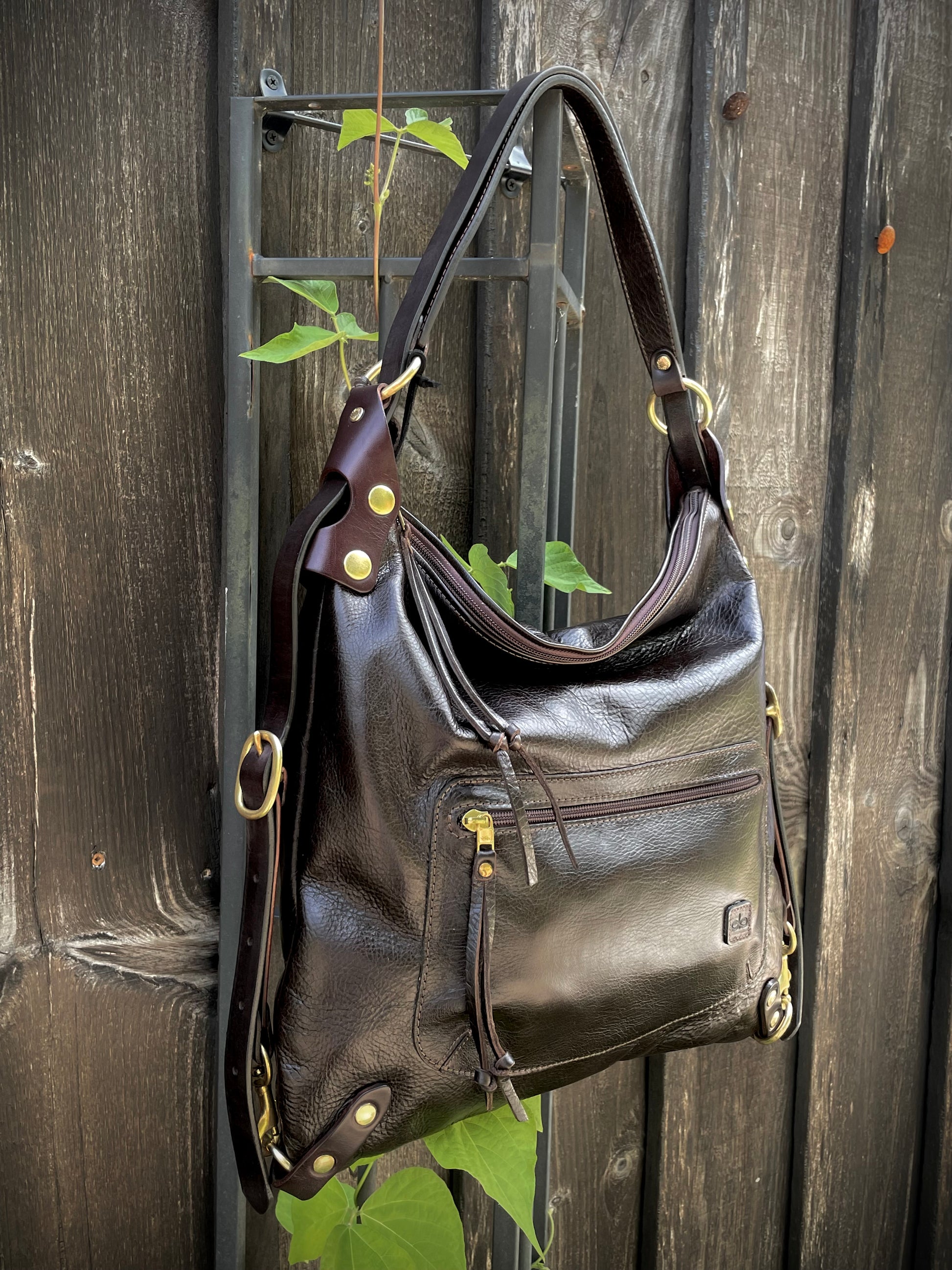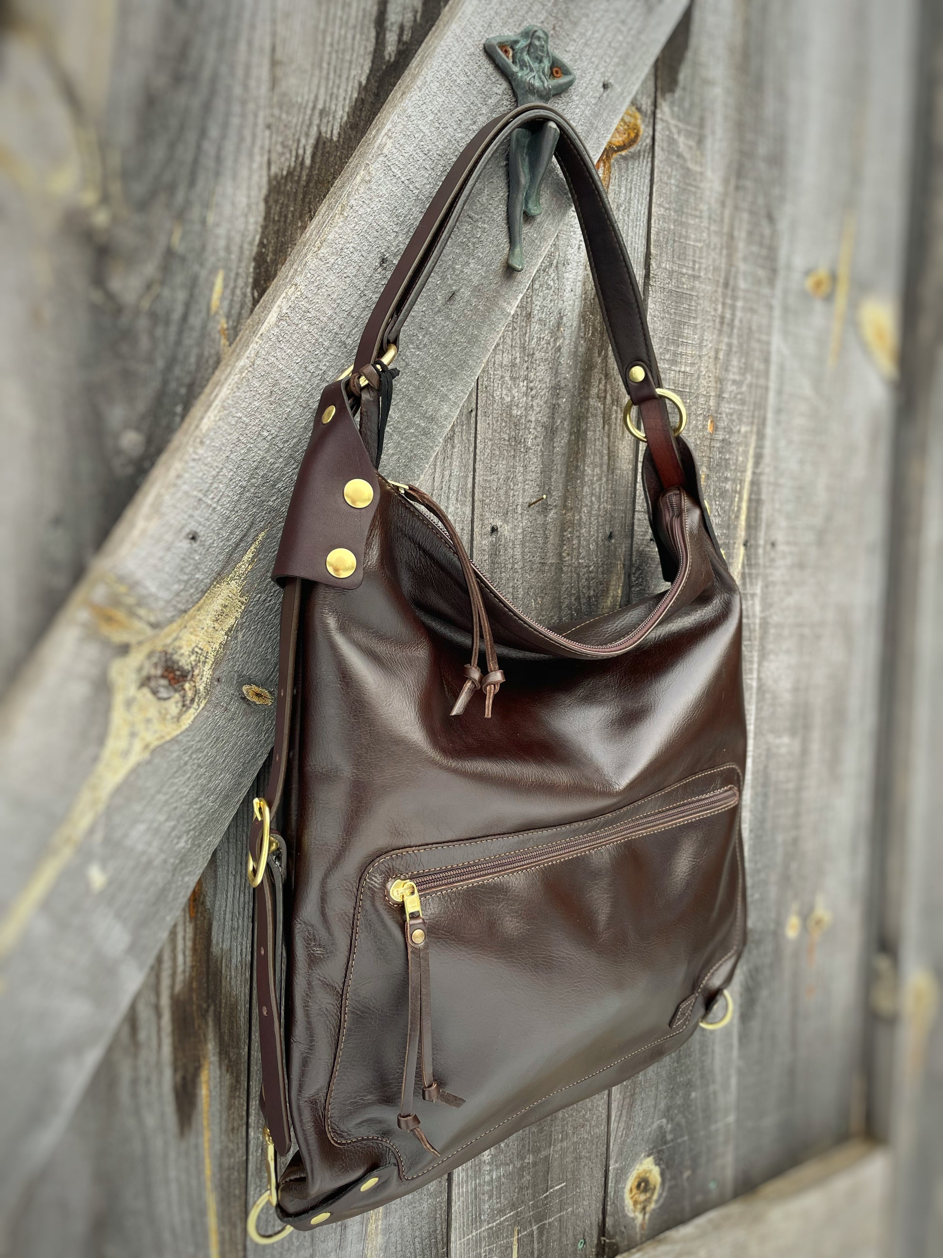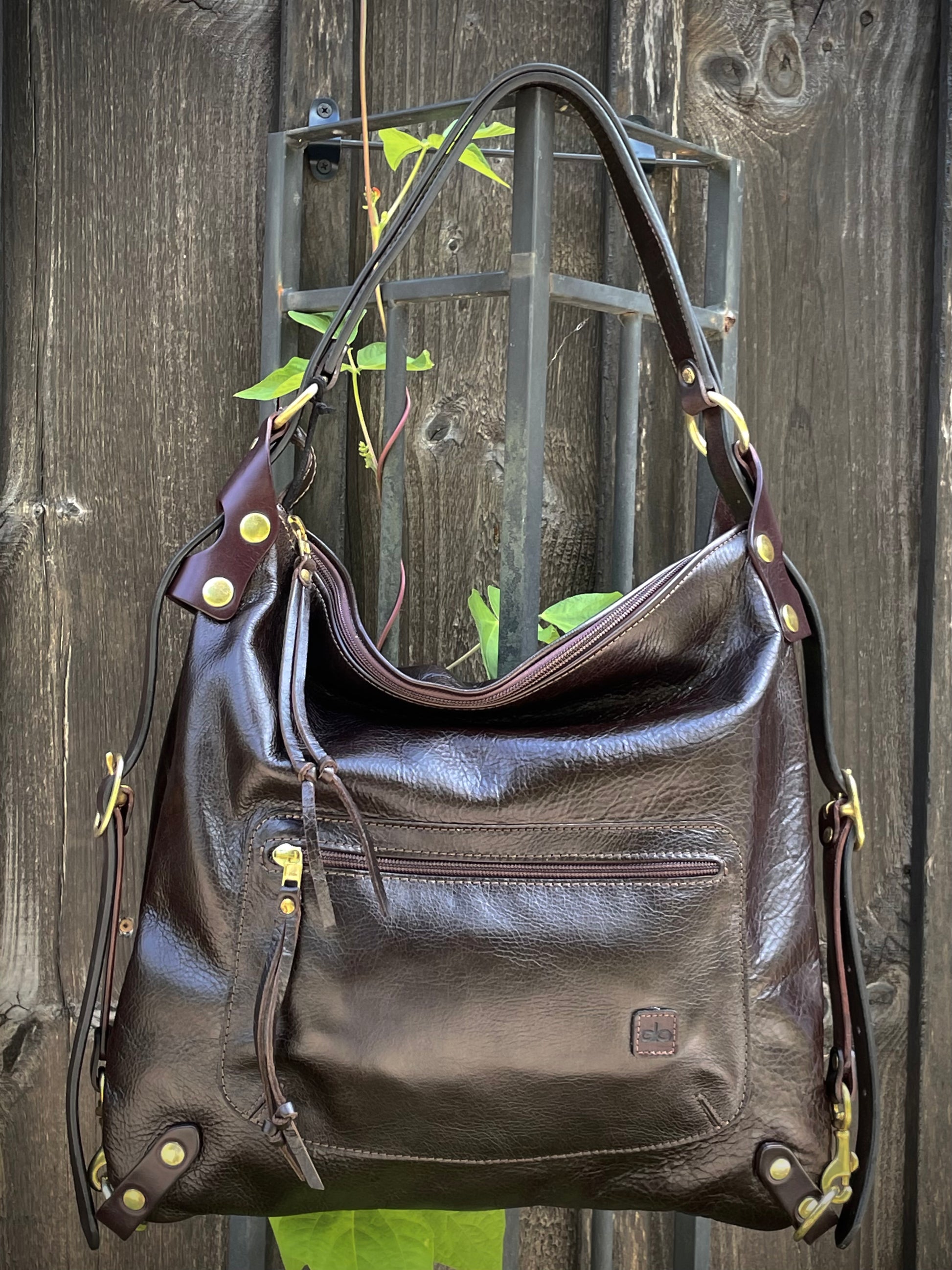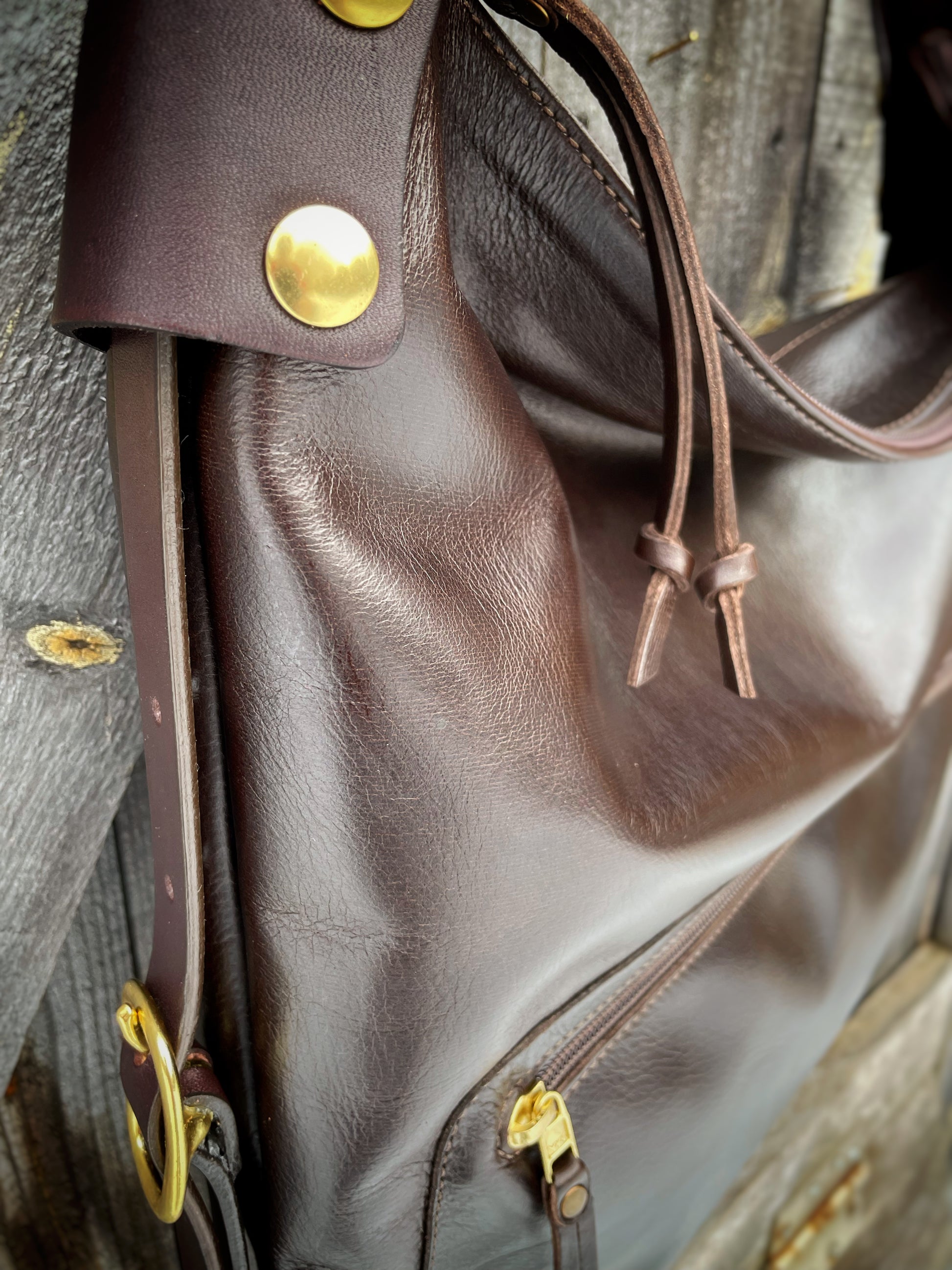 The Villa is a chic backpack and shoulder bag designed all-in-one. It carries a laptop and all your daily necessities with plenty of room to spare. There is one large zipper pocket for quick access on the front of the bag and a large zipper pocket with patch pockets on the upper inside back panel. Securely attached to one of the strap-rings is a long discreet key lanyard that is easily stowed and accessed. The Villa is made of Italian full grain leather and strapped up with English bridle leather. The hardware is solid, cast equestrian brass. All the edges are carefully hand finished making this a timeless and functional piece that will serve and age gracefully for many years to come.