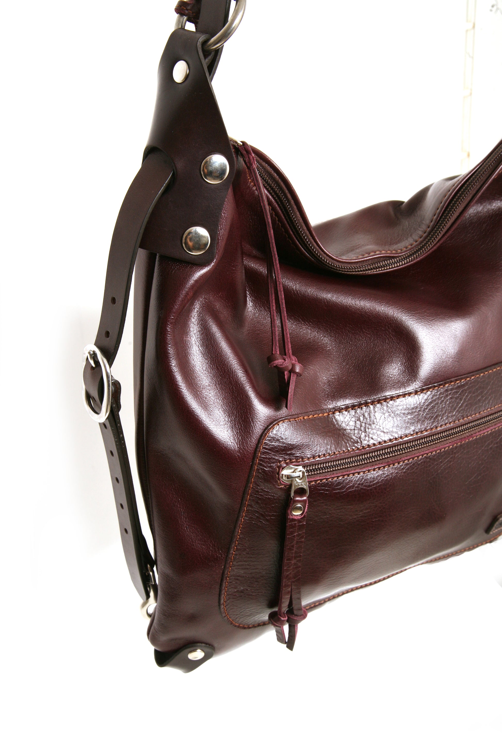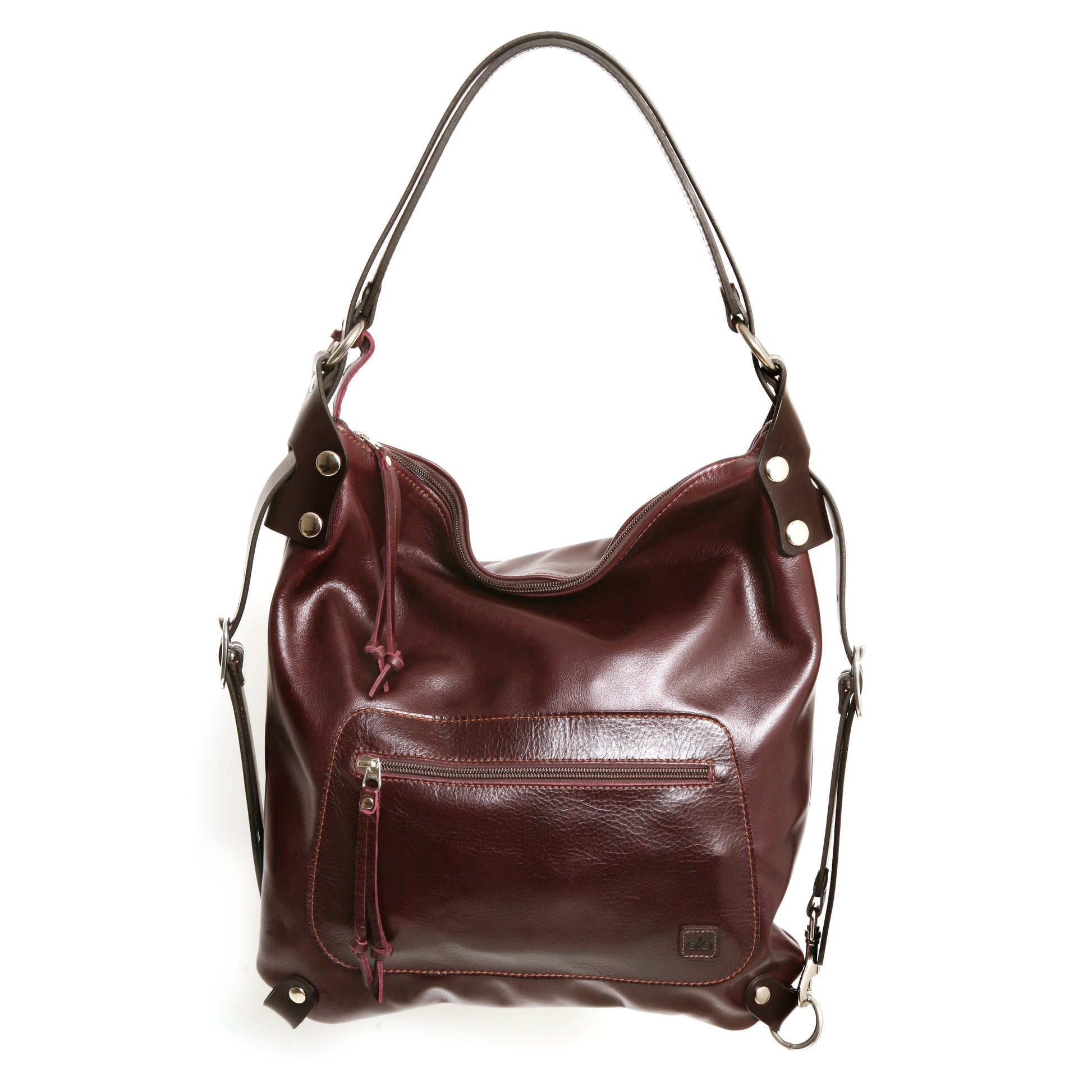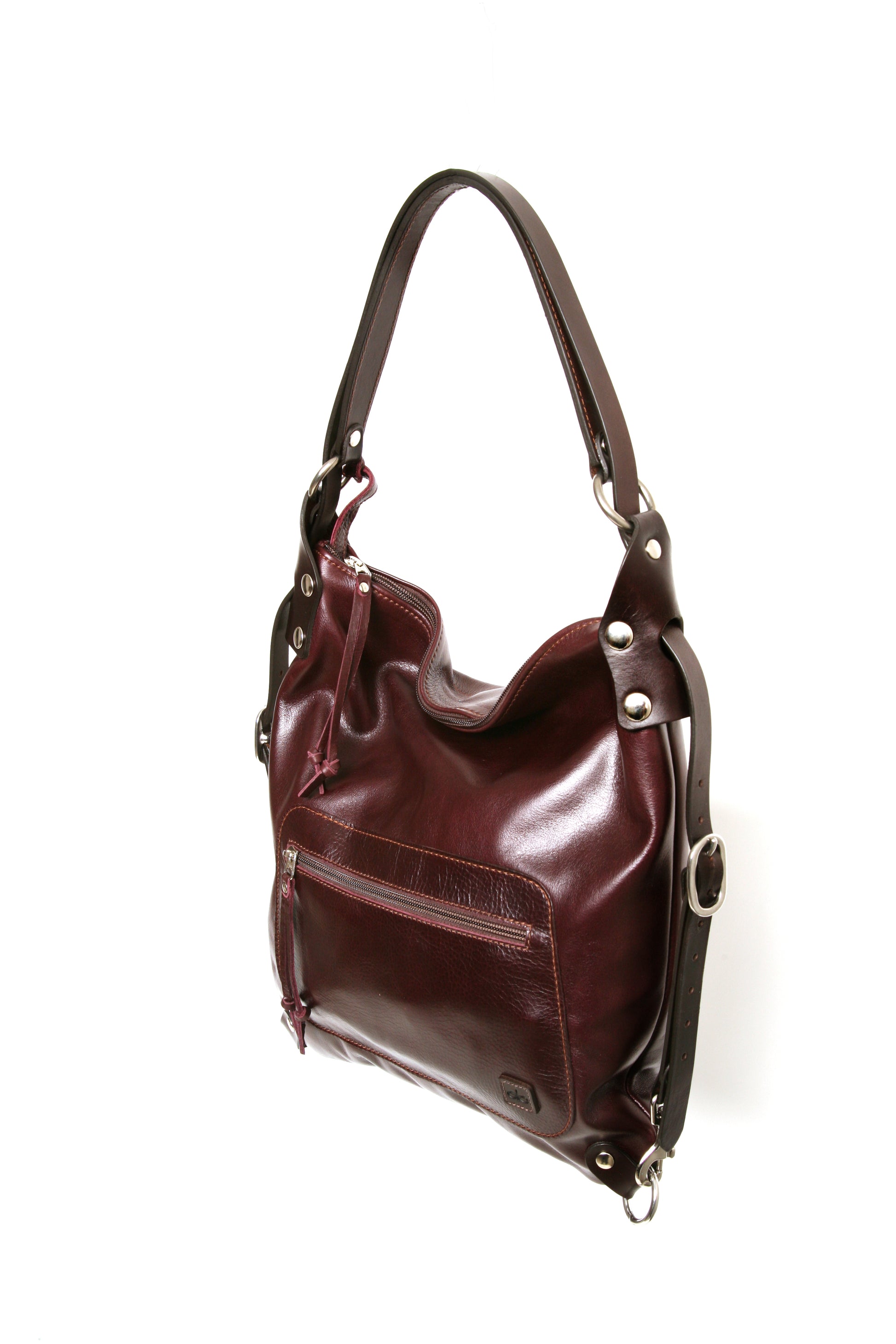 There is one large zipper pocket for quick access on the front of the bag and a large zipper pocket with patch pockets on the upper inside back panel. Securely attached to one of the strap-rings is a long discreet key lanyard that is easily stowed and accessed. The Villa is made of buffalo full grain leather and strapped up with English bridle leather. The vintage leather has a pull up look and will soften and mellow with use. The hardware is solid, cast equestrian stainless steel. All the edges are carefully hand finished making this a timeless and functional piece that will serve and age gracefully for many years to come.