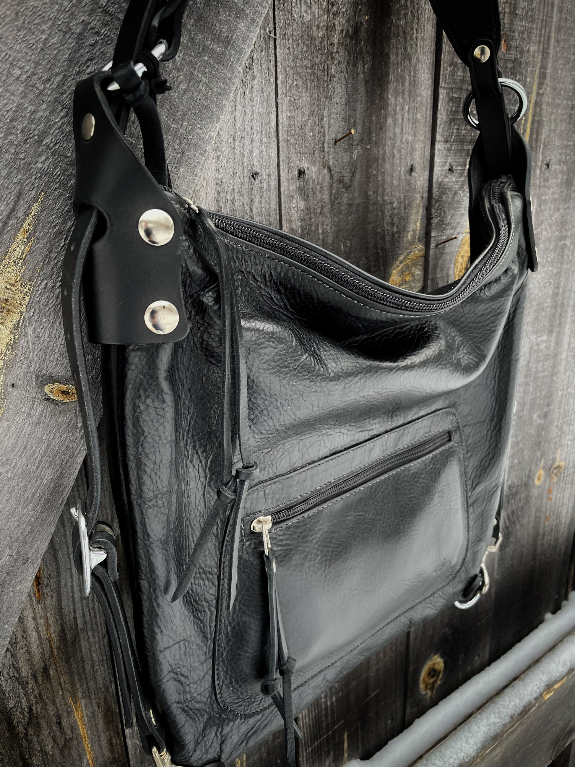 There is one large zipper pocket for quick access on the front of the bag and a large zipper pocket with patch pockets on the upper inside back panel. Securely attached to one of the strap-rings is a long discreet key lanyard that is easily stowed and accessed. The Villa is made of Italian full grain leather and strapped up with English bridle leather. The hardware is solid, cast equestrian brass or stainless steel. All the edges are carefully hand finished making this a timeless and functional piece that will serve and age gracefully for many years to come.
