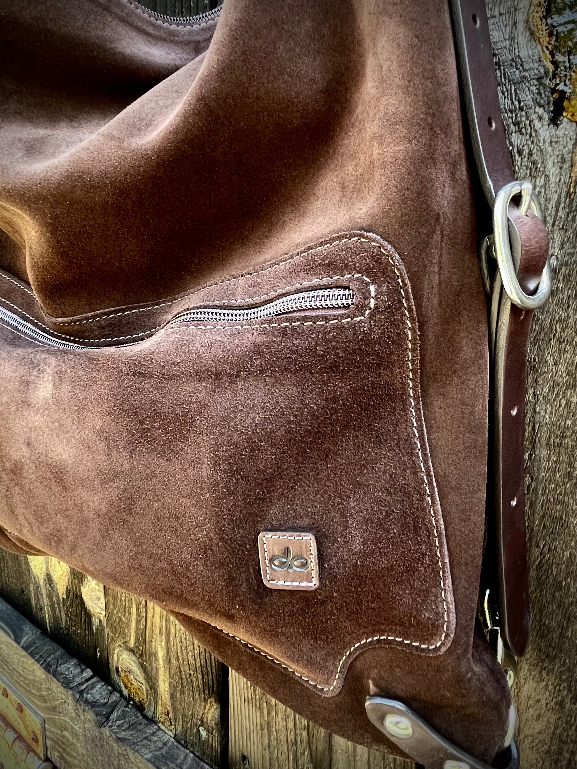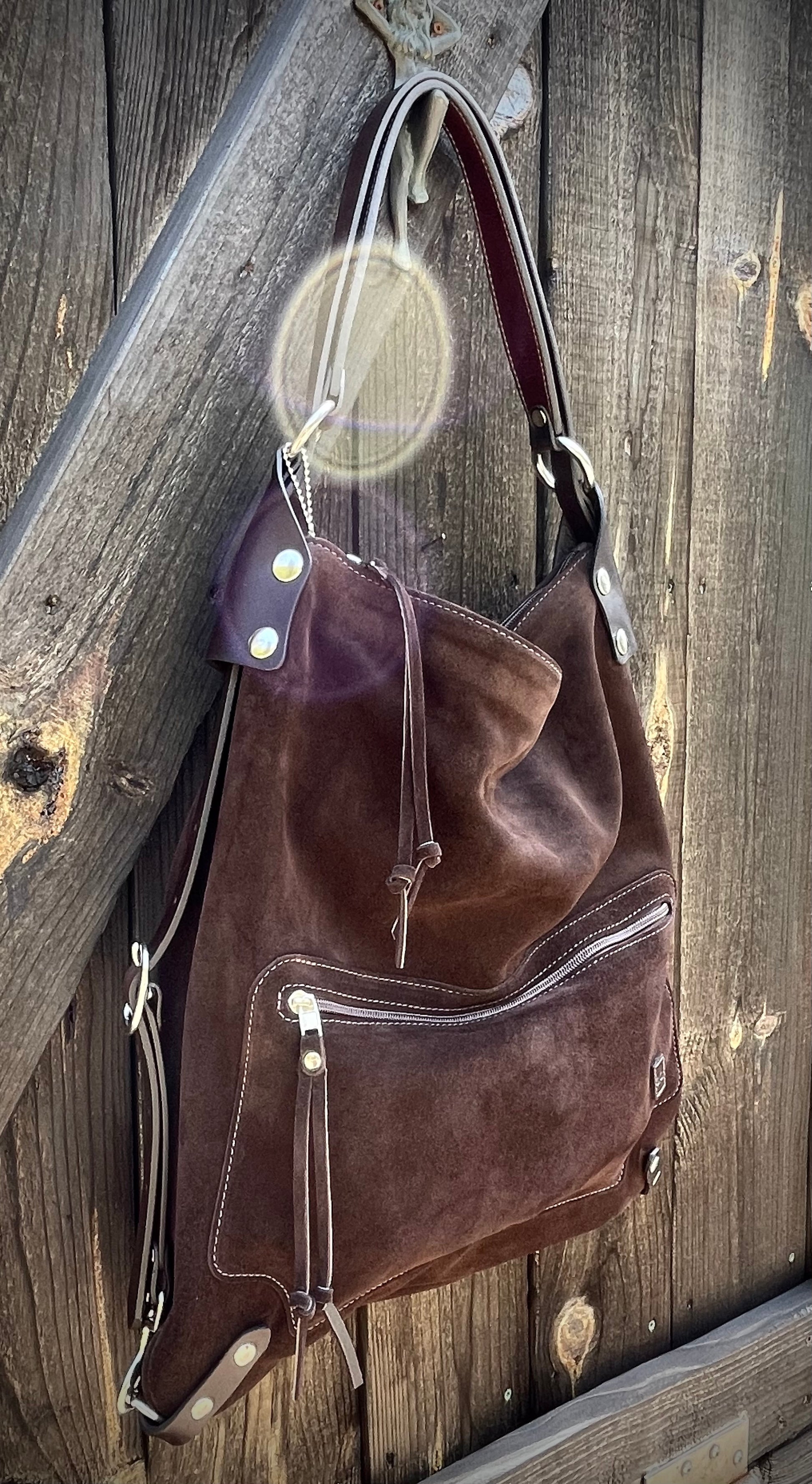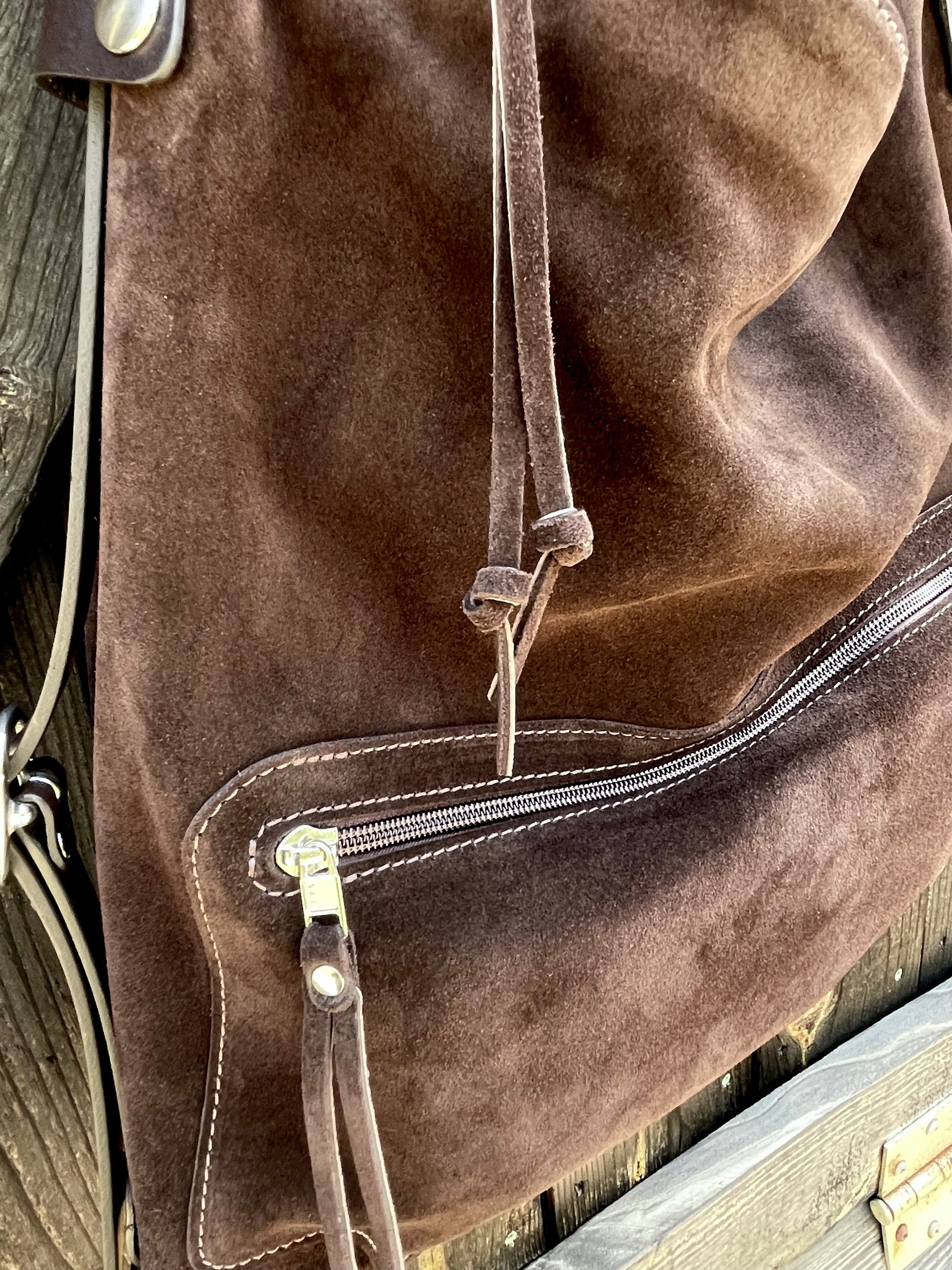 The Villa is a chic backpack and shoulder bag designed all-in-one. It carries a laptop and all your daily necessities with plenty of room to spare. There is one large zipper pocket for quick access on the front of the bag and a large zipper pocket with patch pockets on the upper inside back panel. Securely attached to one of the strap-rings is a long discreet key lanyard that is easily stowed and accessed. The Villa is made of suede from Charles F. Stead, arguably the finest suede worldwide and strapped up with English bridle leather. The hardware is solid stainless steel. All the edges are carefully hand finished making this a timeless and functional piece that will serve and age gracefully for many years to come.