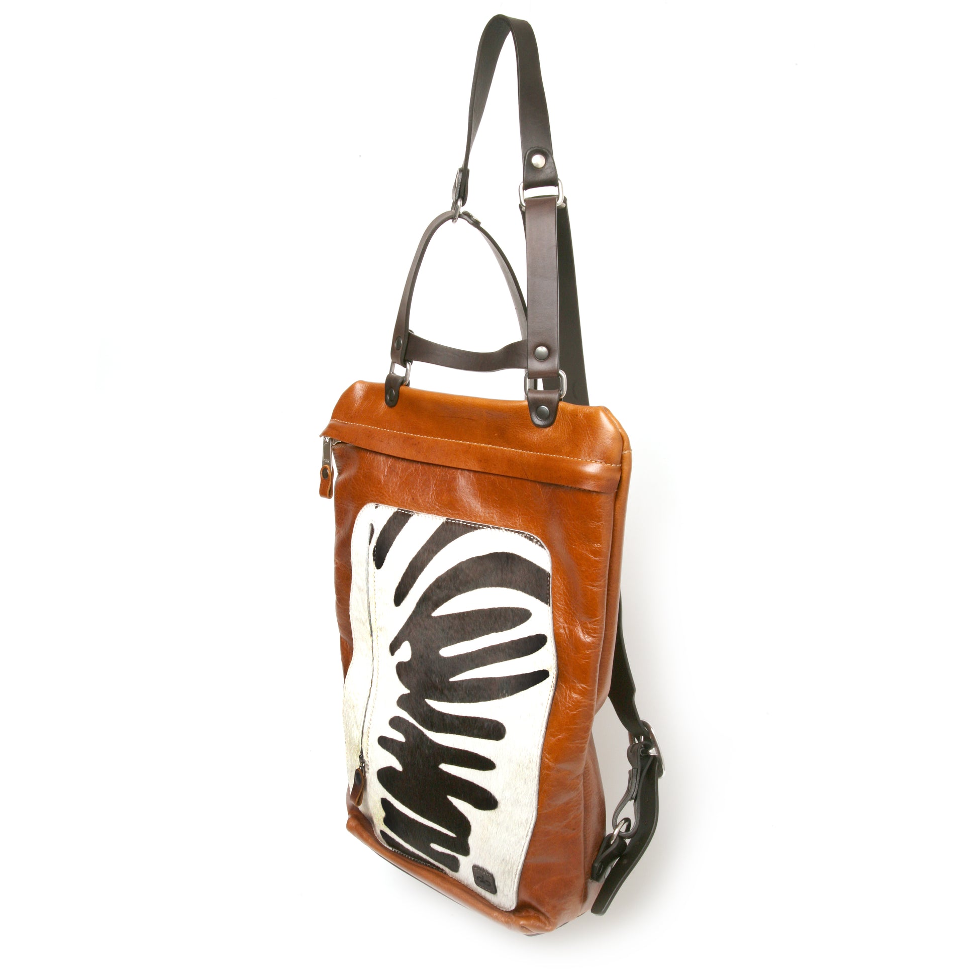This YETI Sling Pack is the ultimate utility tote backpack. Crafted with an ultra-low profile and lightweight design, it is ideal for everyday use as a school bag or for quick errands. Featuring a versatile design and bench made construction, it offers a reliable and stylish solution for everyday carrying needs. This Yeti is a one of a kind with its cow hair, printed with zebra pattern.